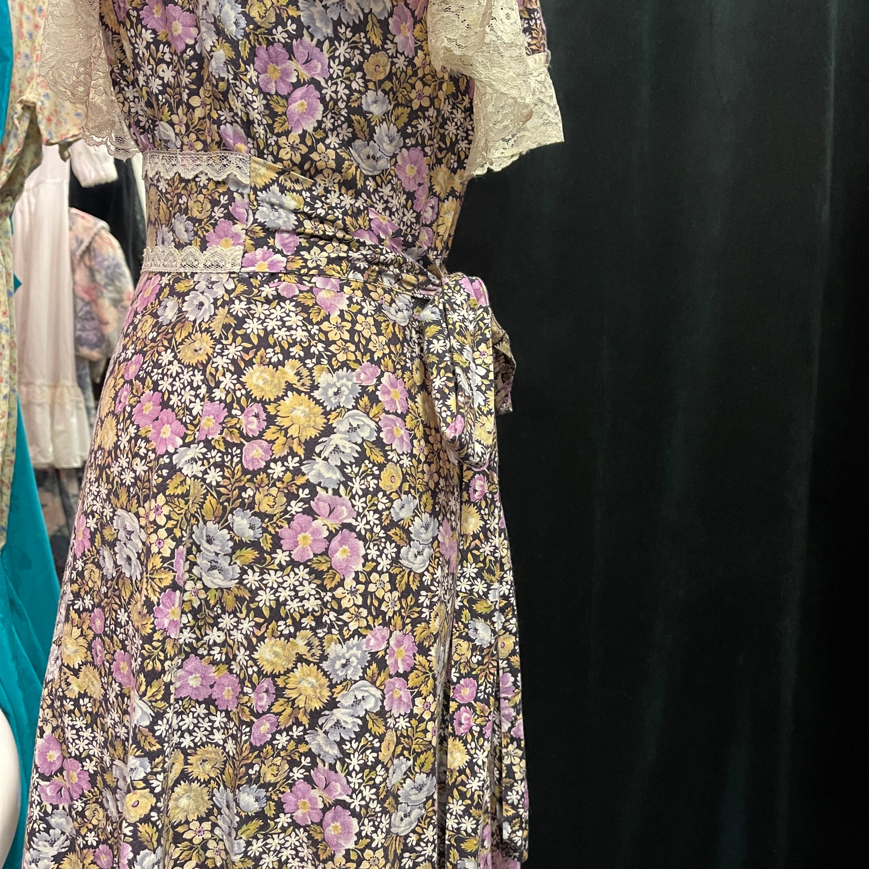 紺地に紫を基調とした花柄に、サテンリボンと華奢なレースで装飾された豪華な一着です。