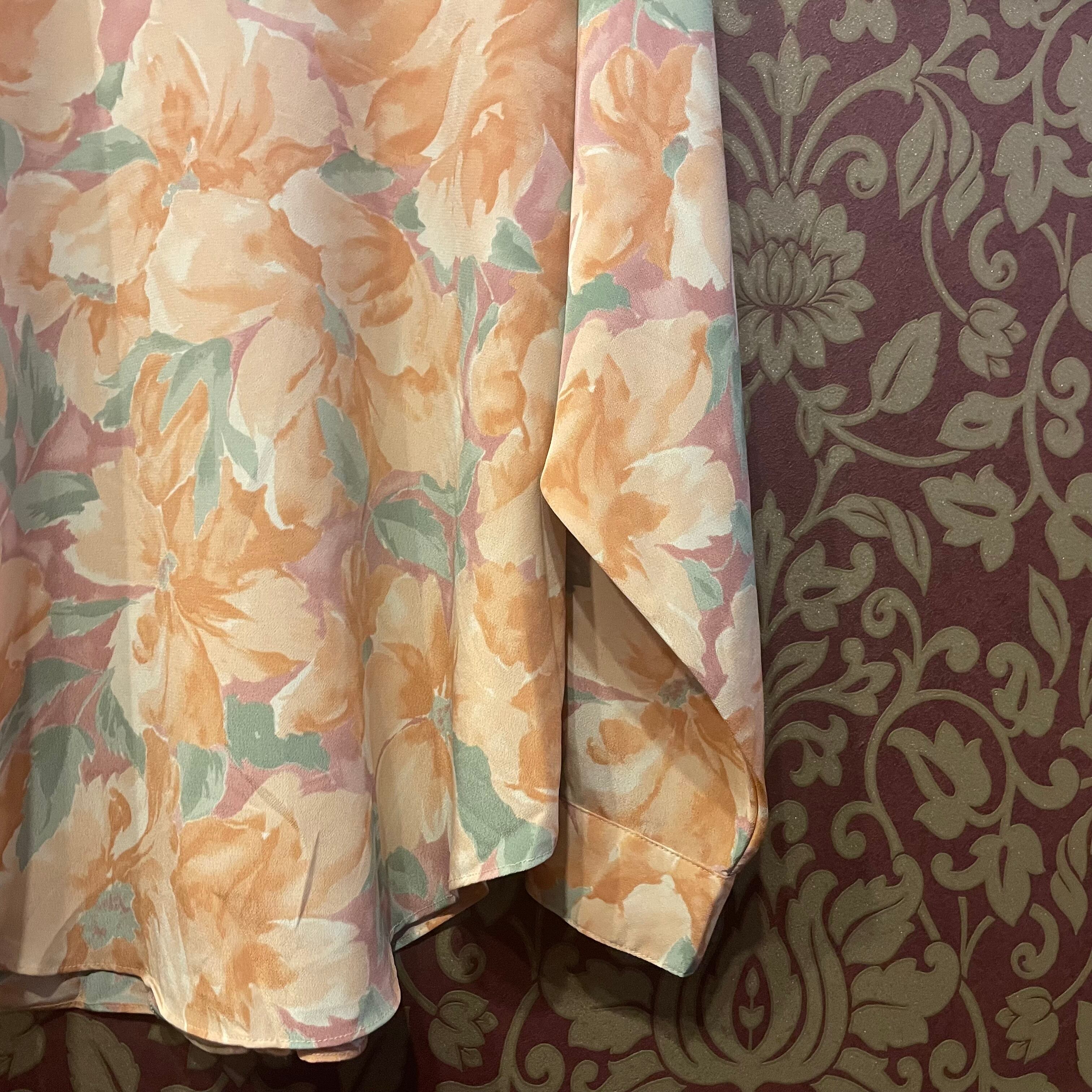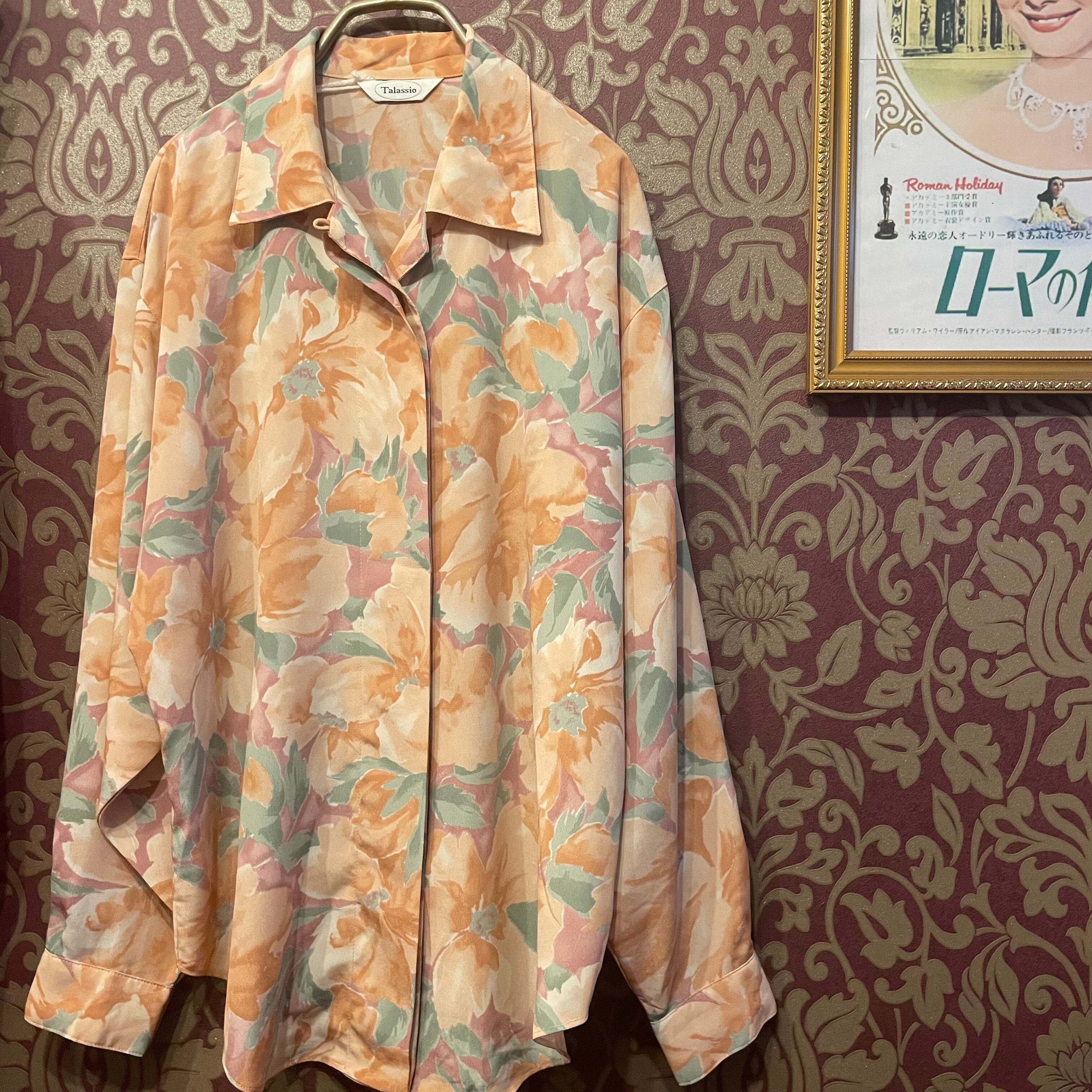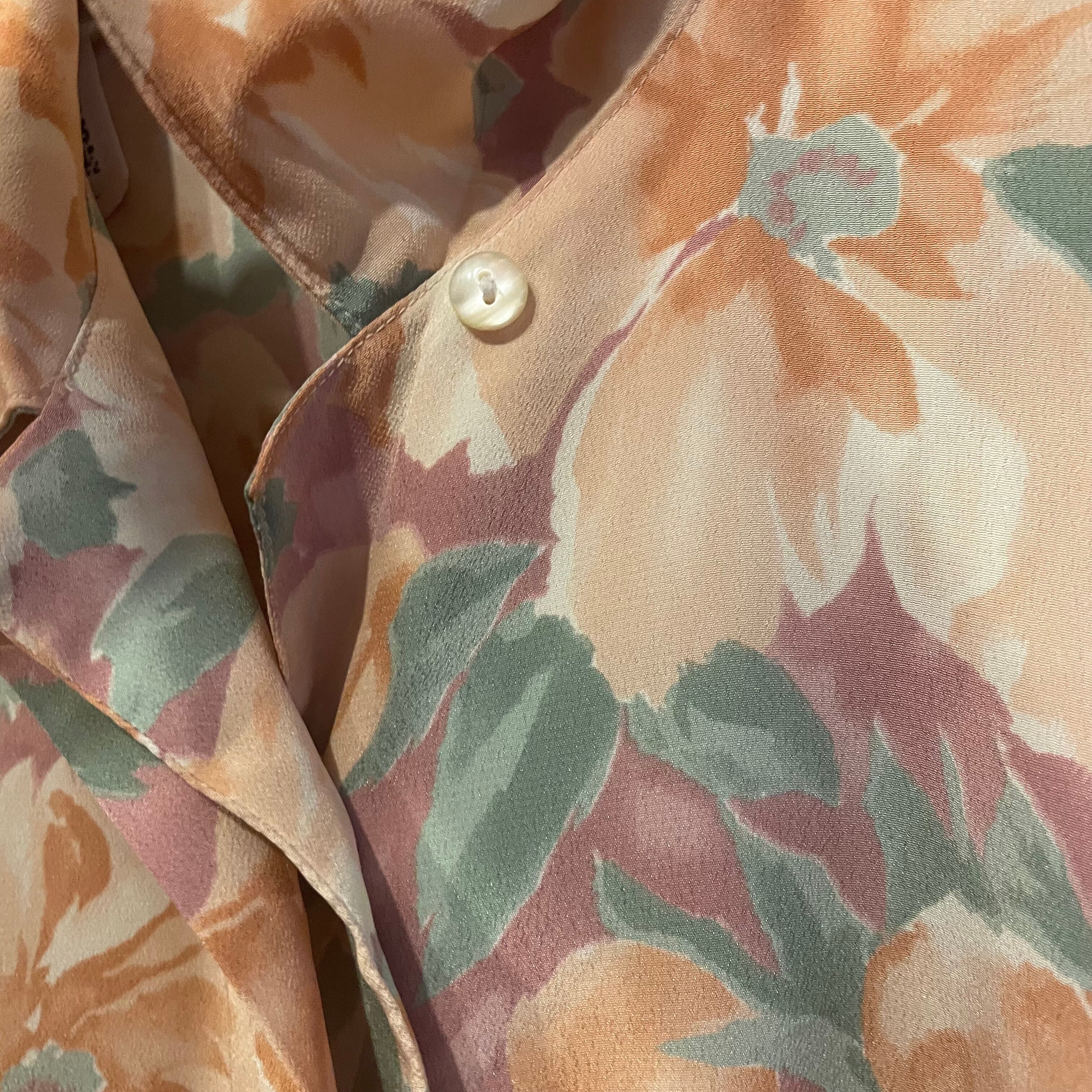 淡いオレンジ色の水彩画のような花柄ブラウスです。