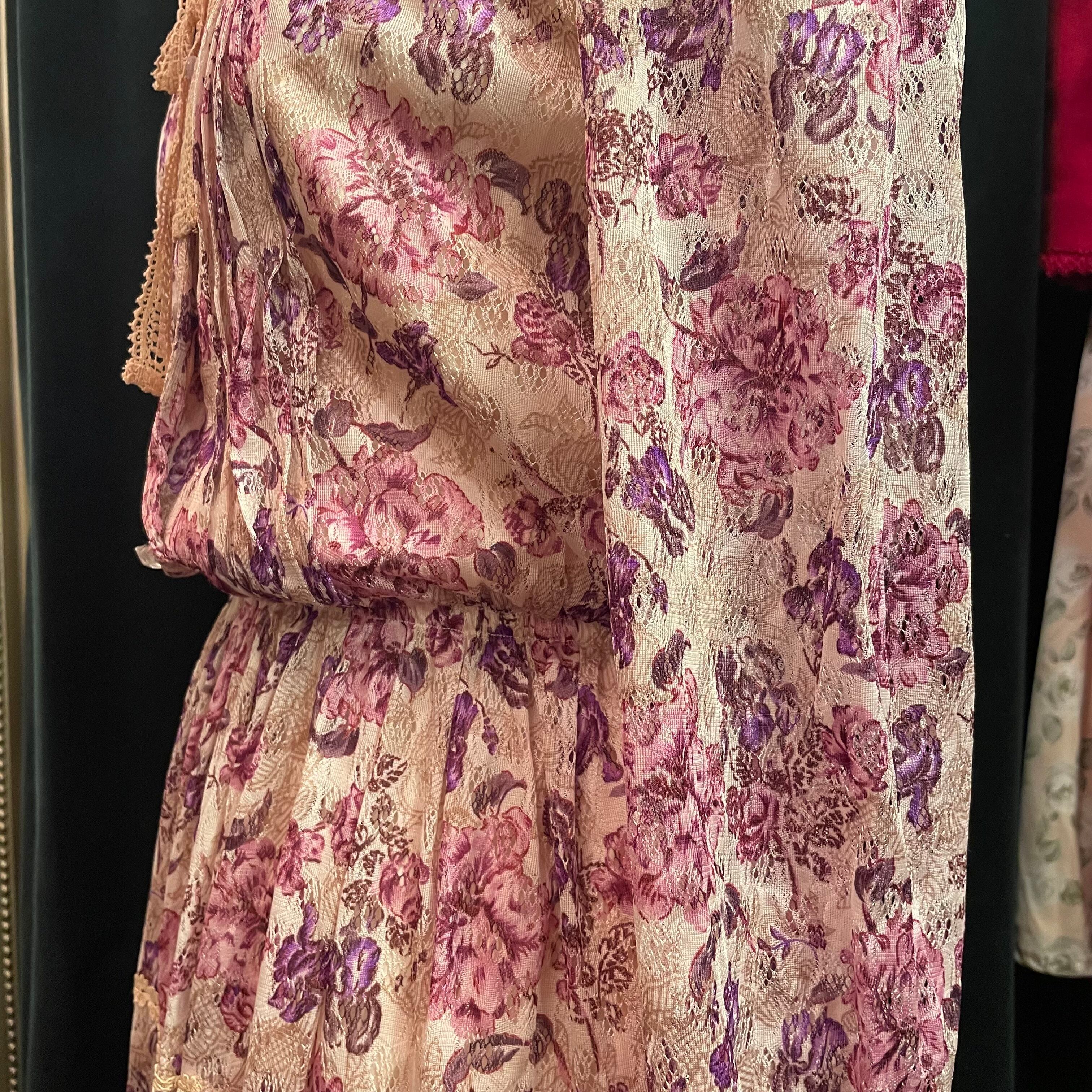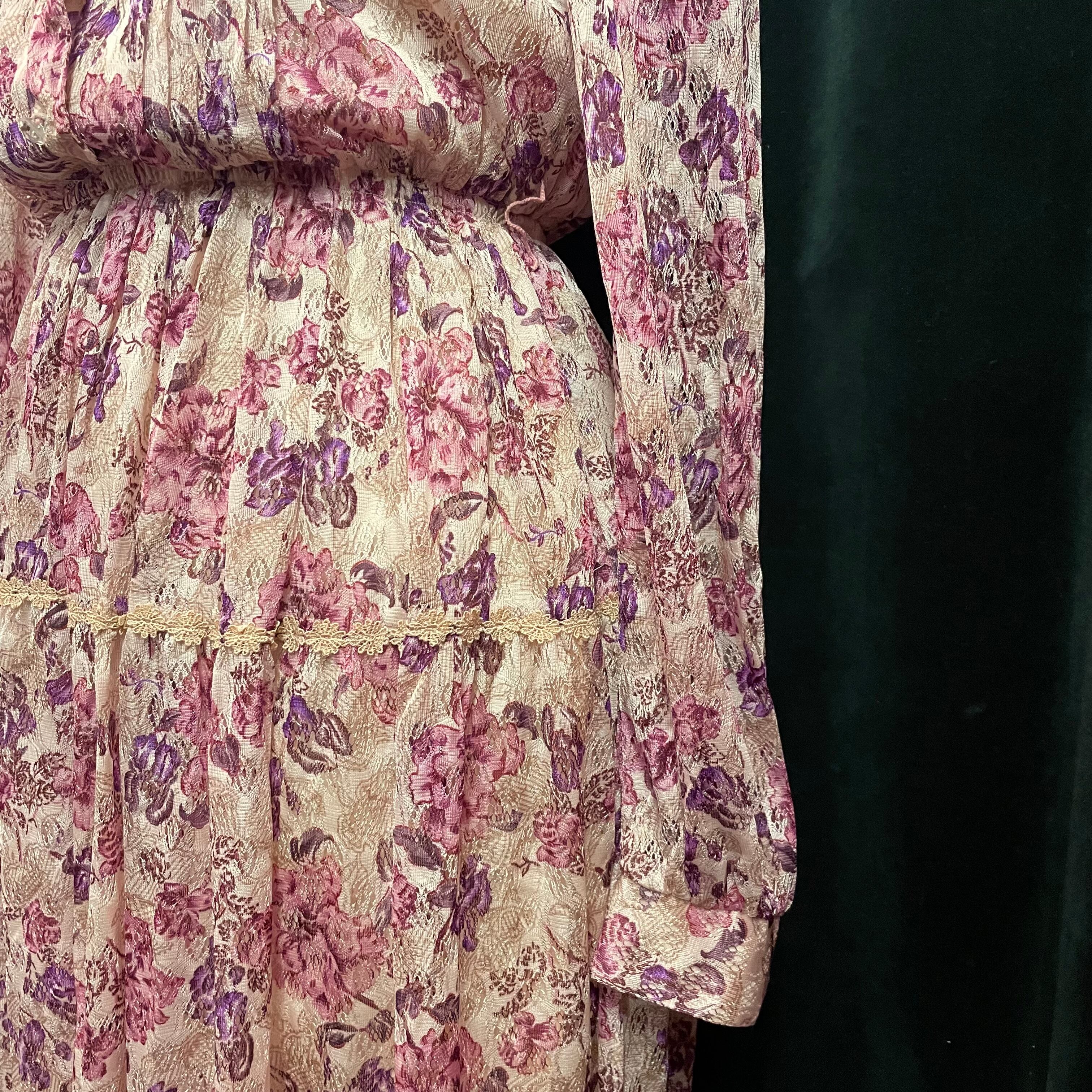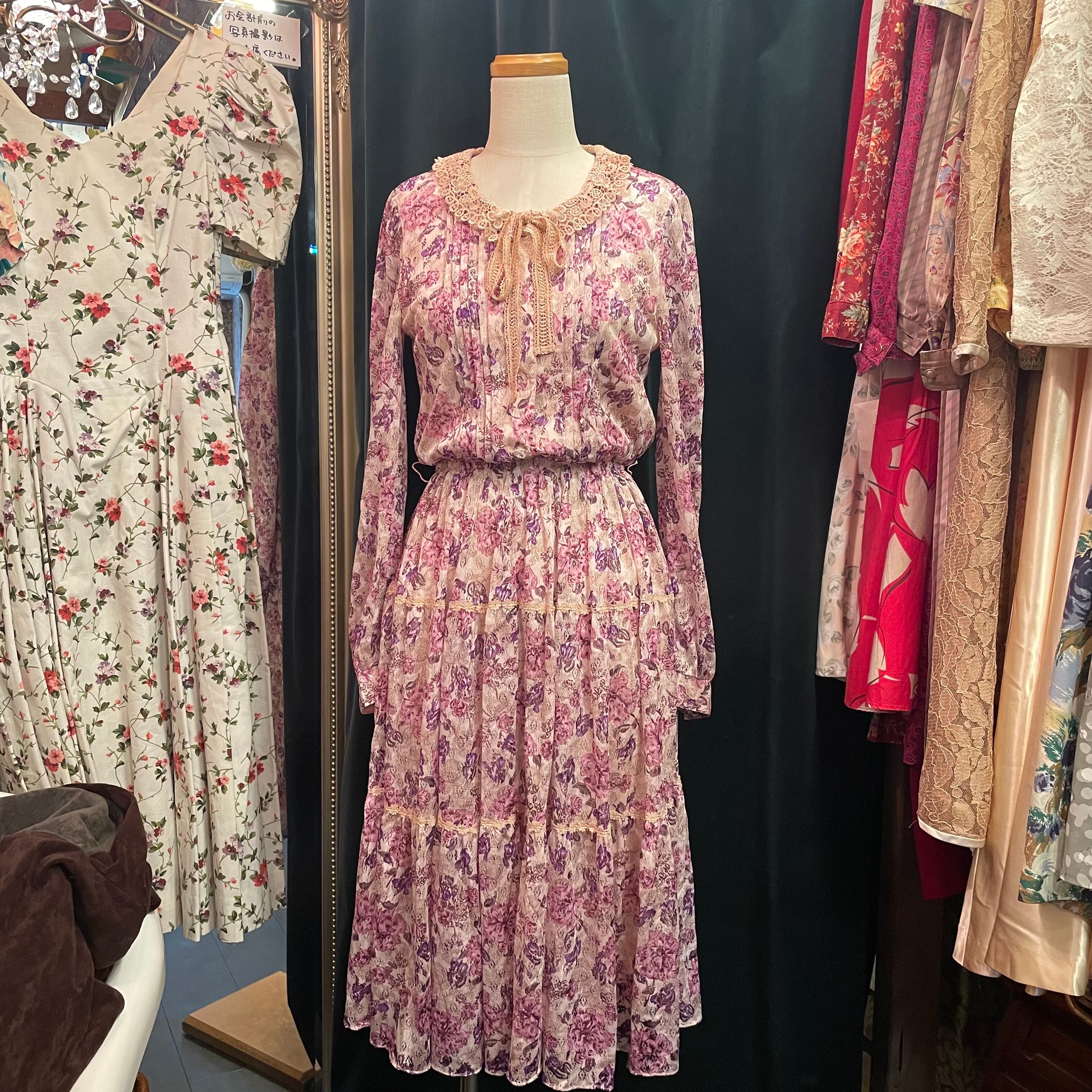 淡いピンク地にピンクと紫の花柄がプリントされたレースで作られたワンピースです。