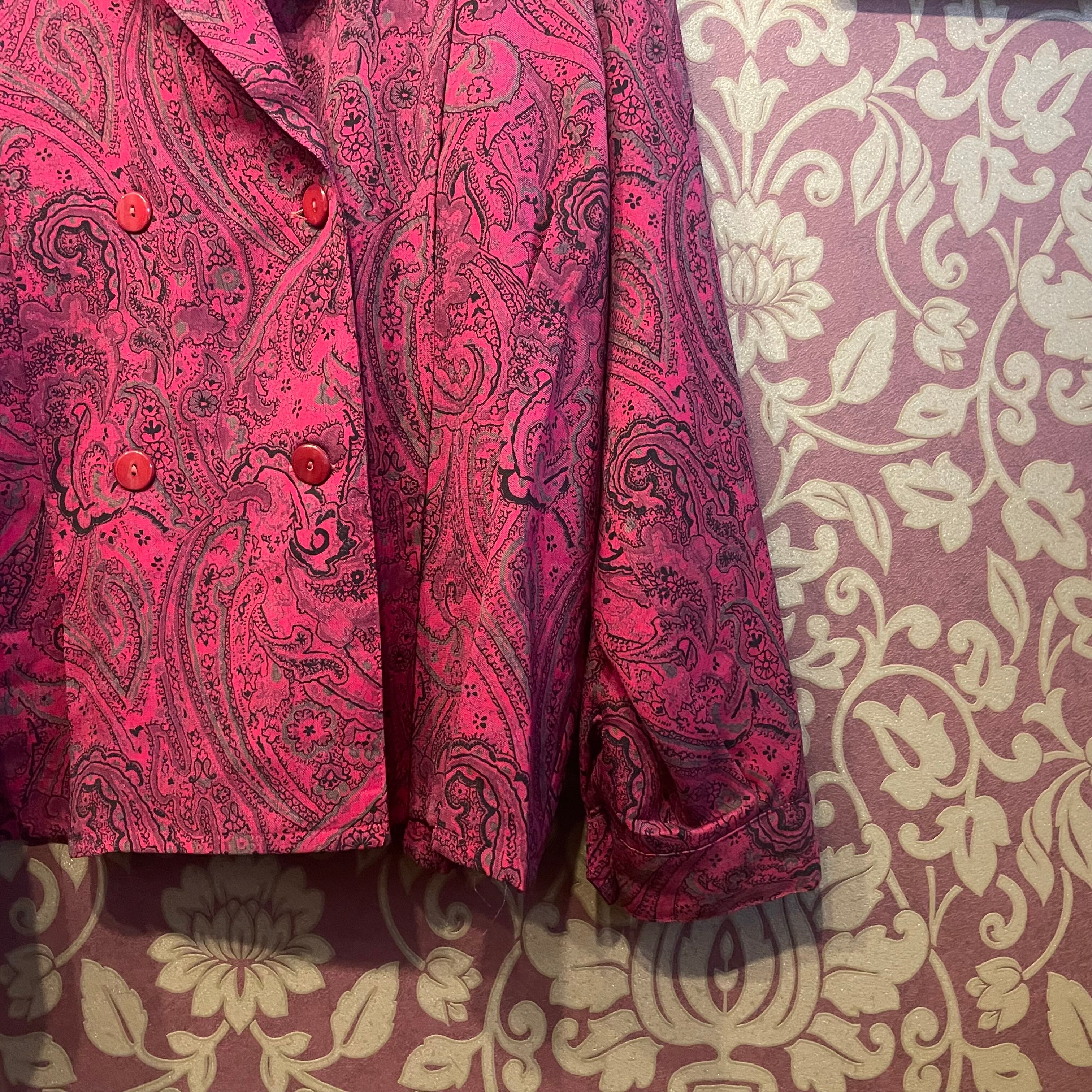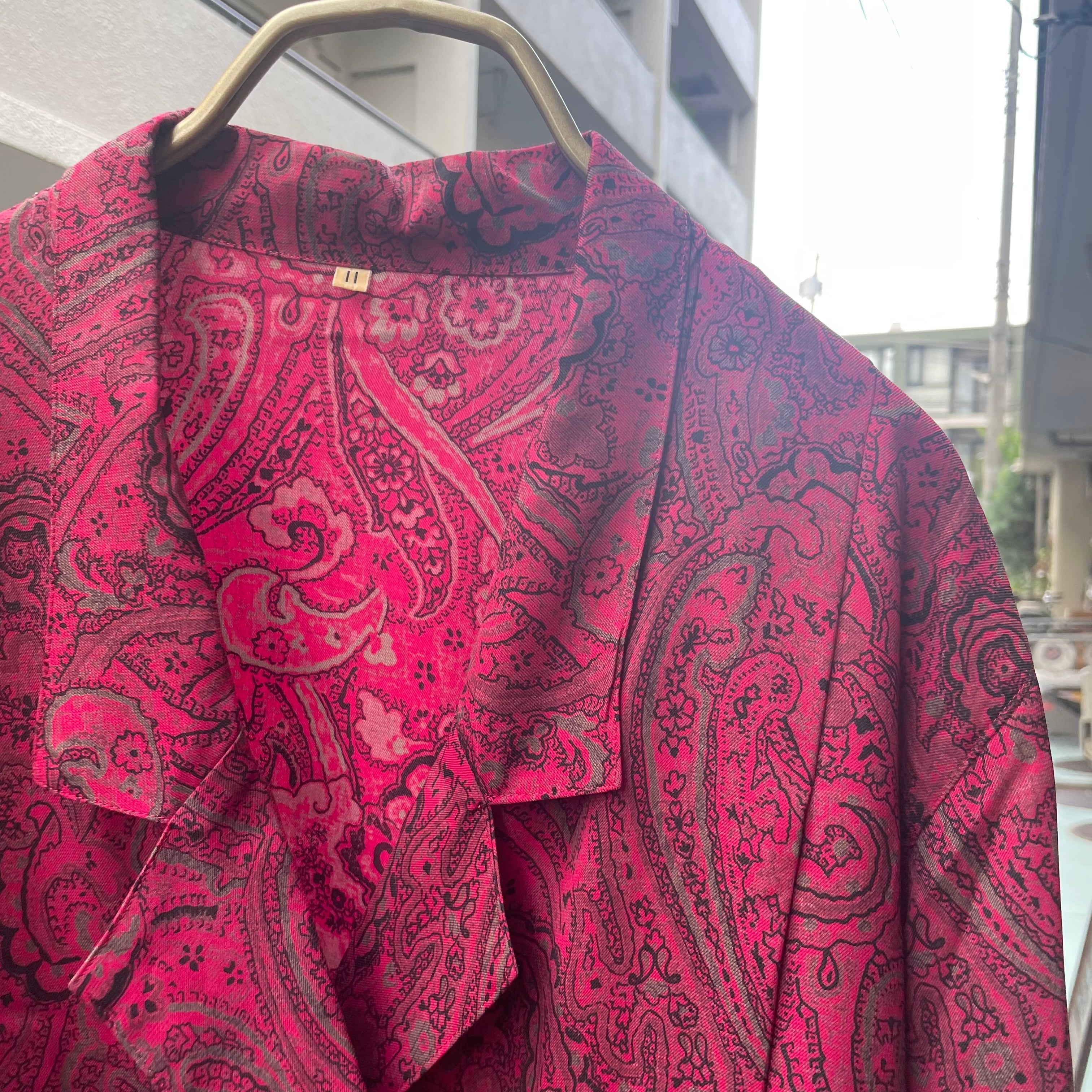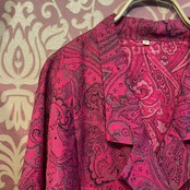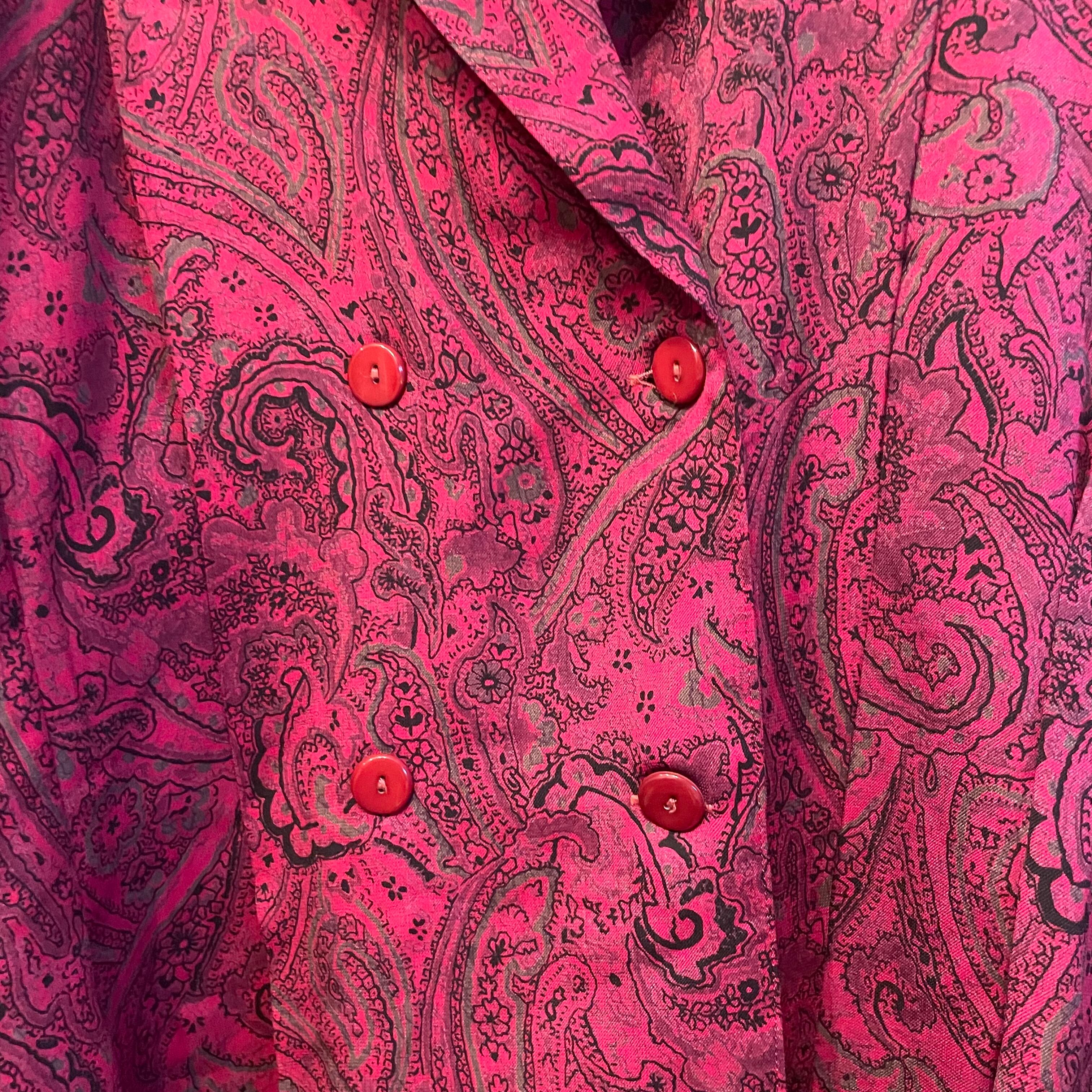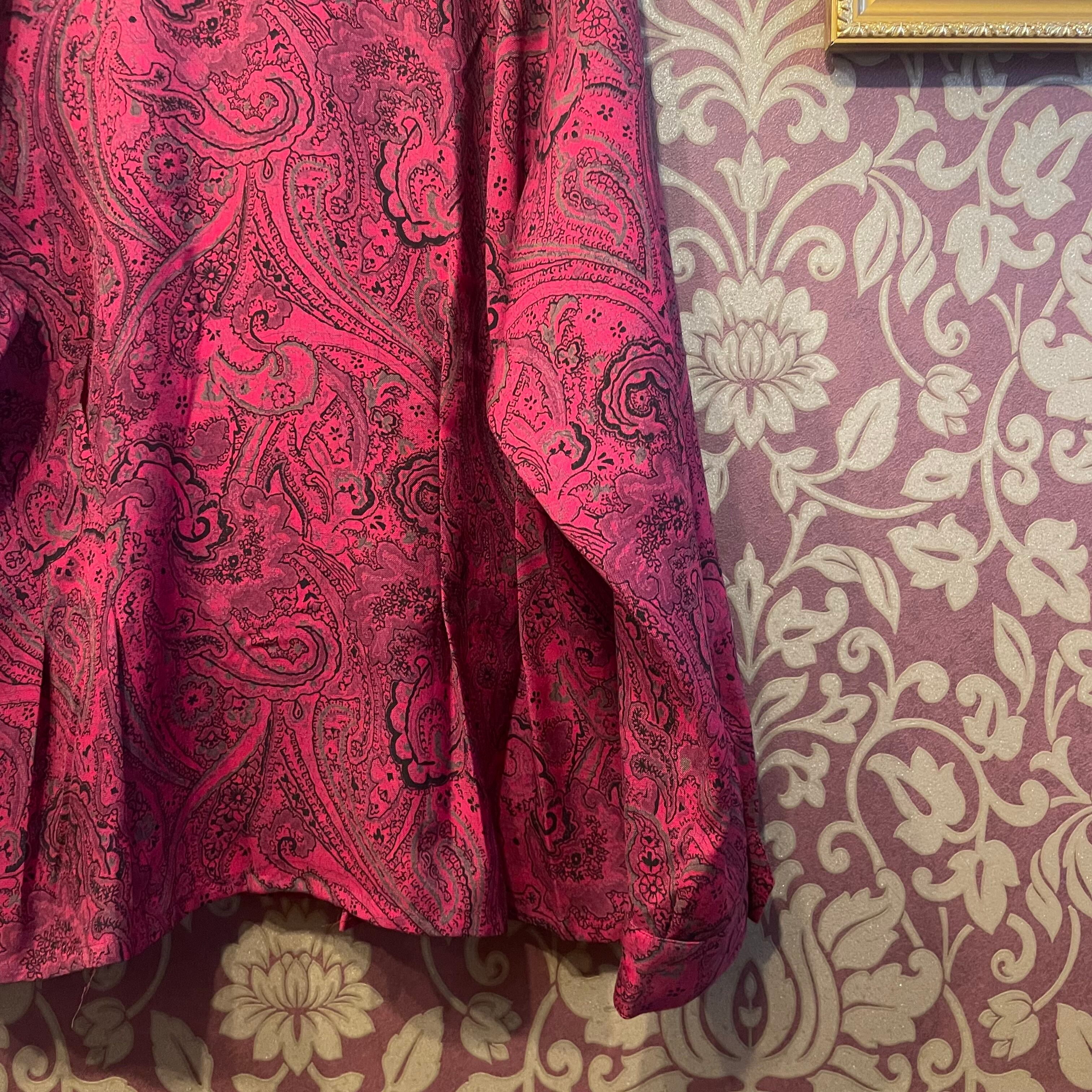 ワインのような渋みのある赤に黒と緑のペイズリー柄ブラウスです。