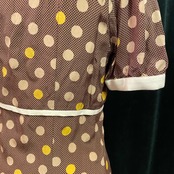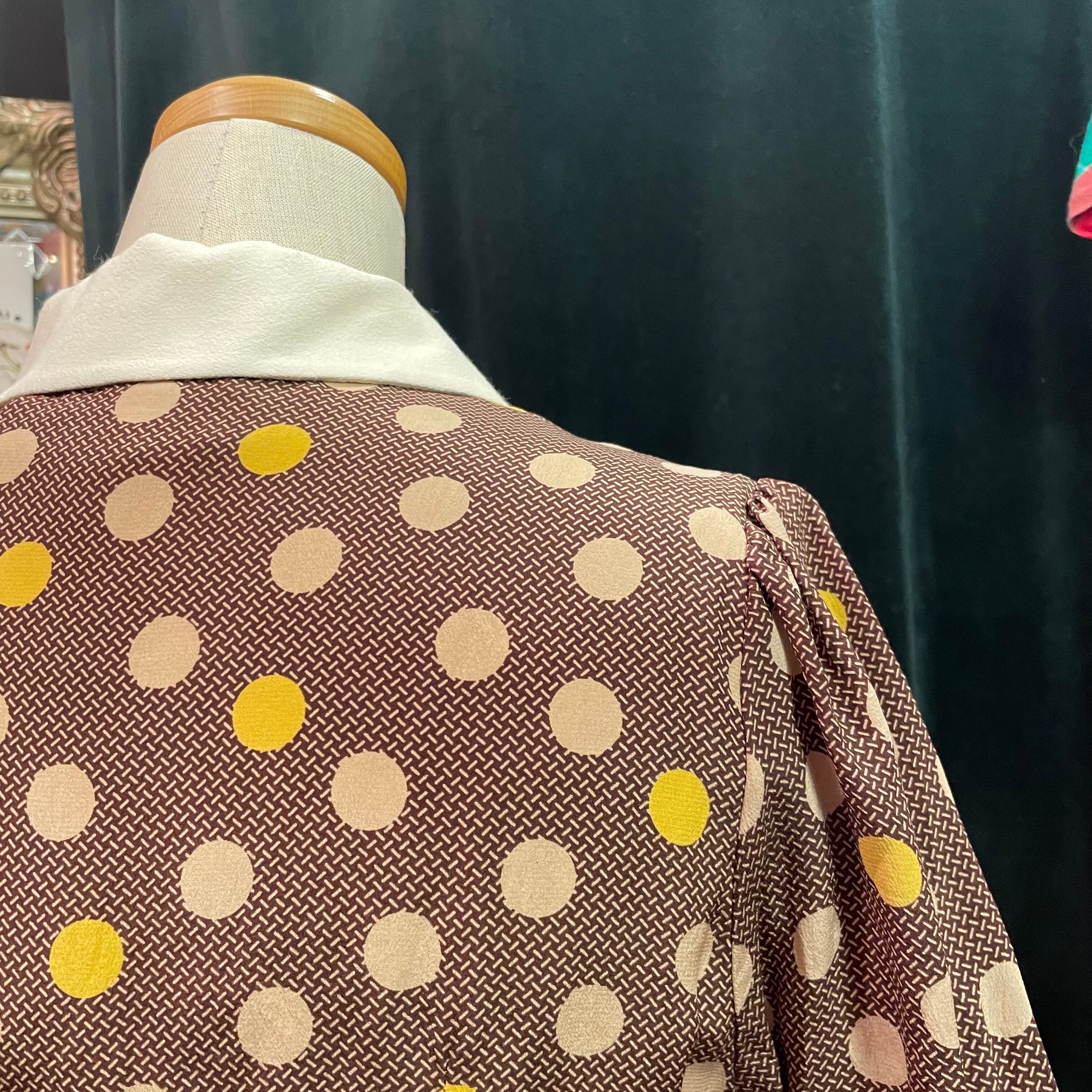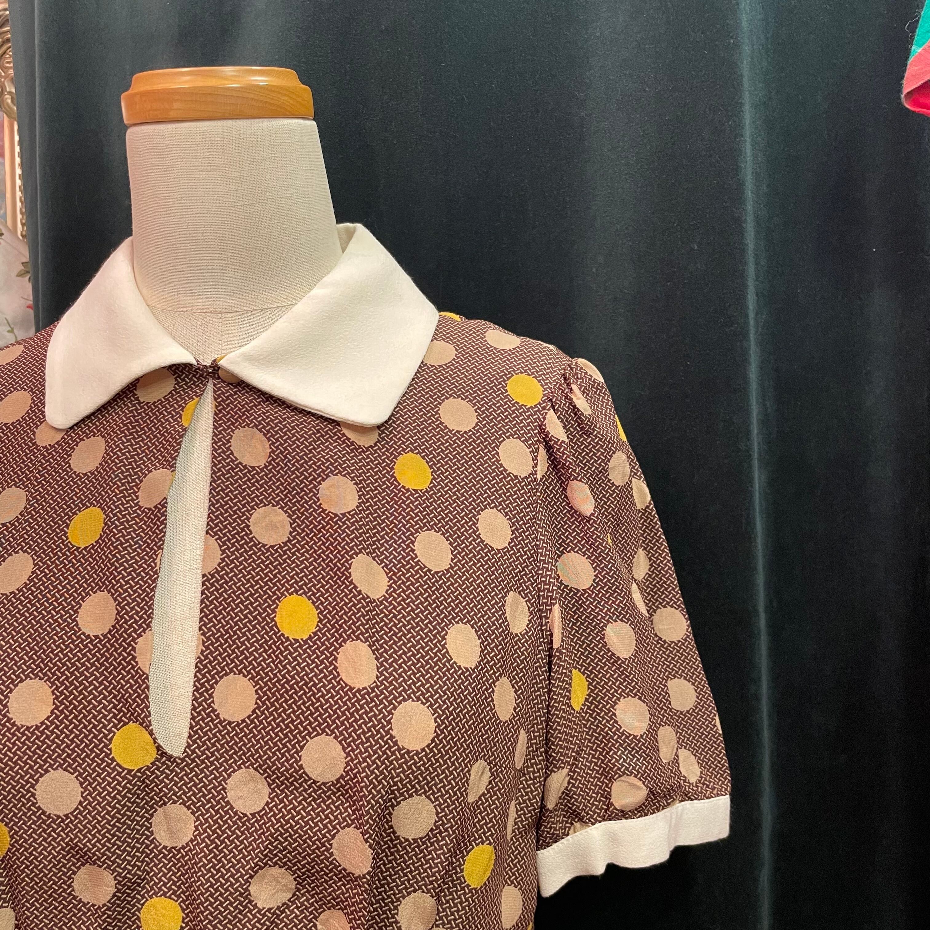 落ち着いた色合いのブラウンにベージュと黄色のコインドット柄でレトロなデザインです。