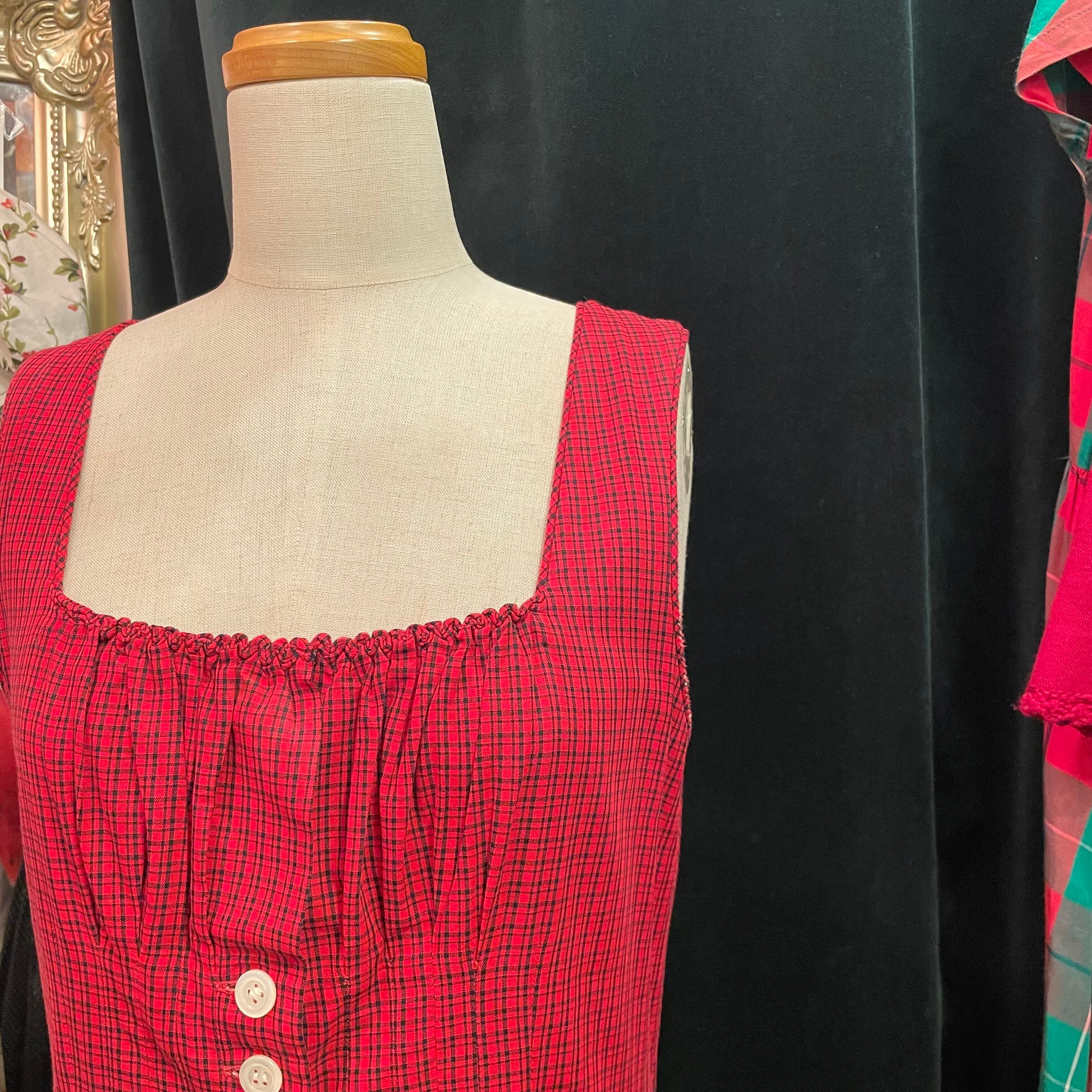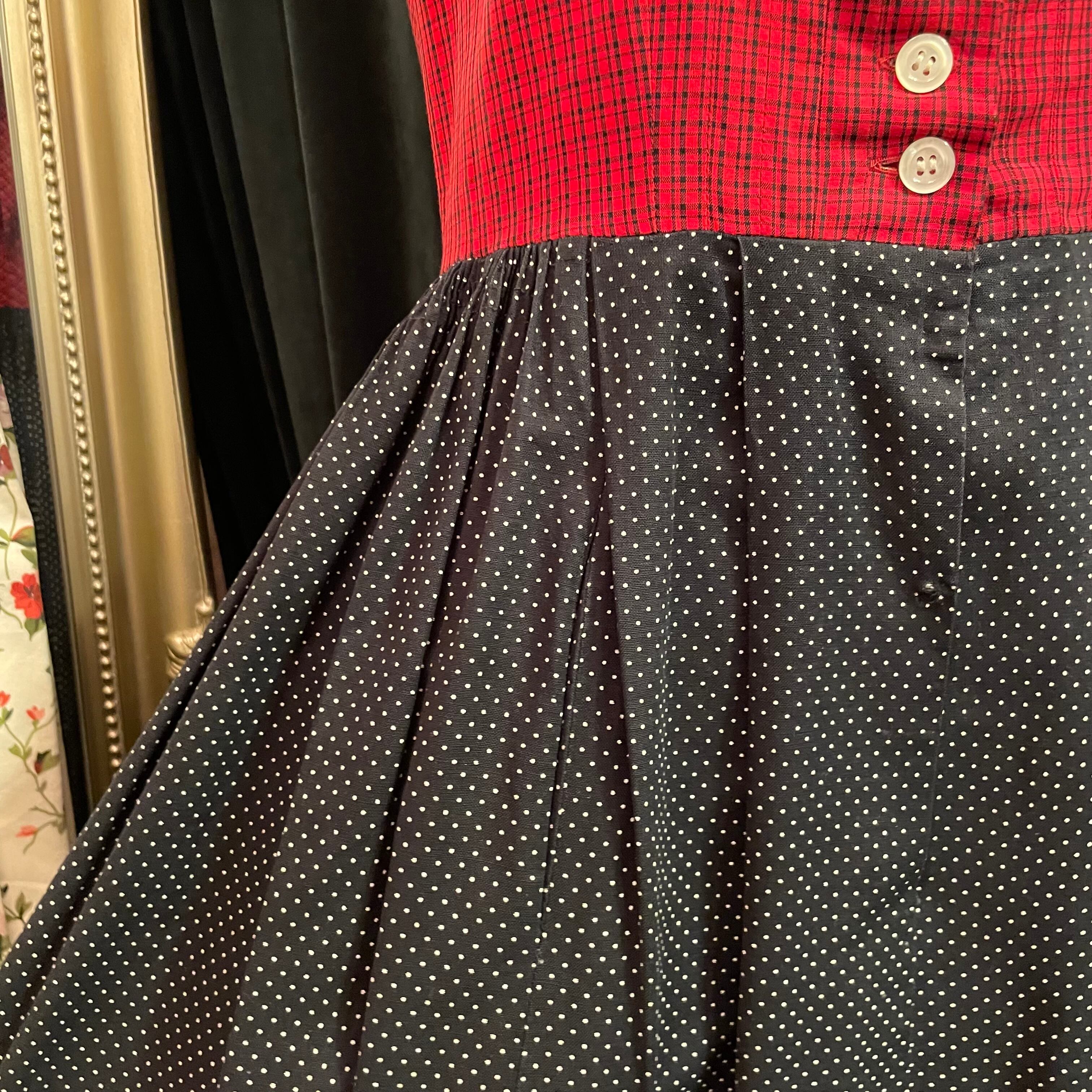 上半身は赤いチェック柄、スカート部分は黒地に白のピンドット柄で作られています。