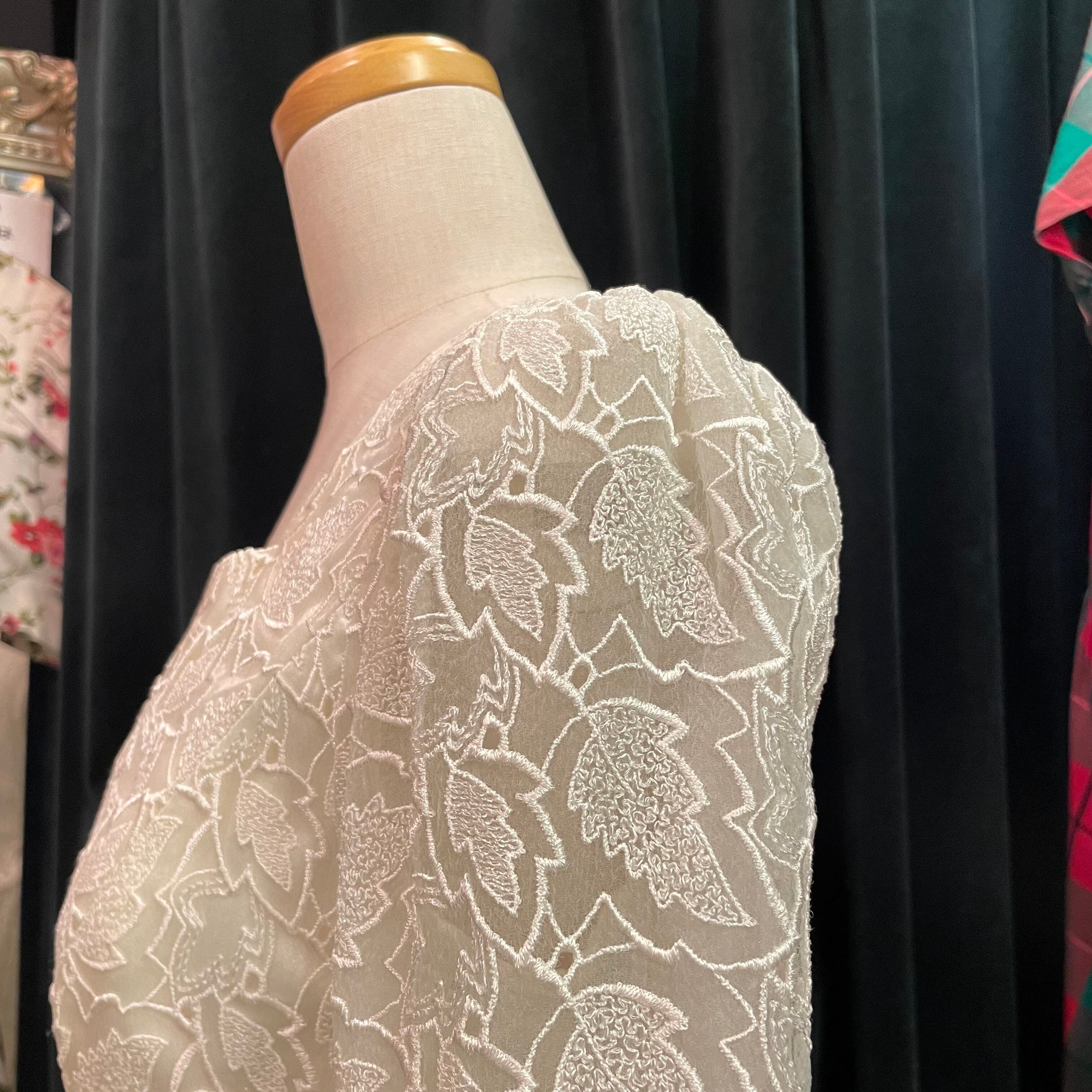 オフホワイトの優しい印象のレースで作られたドレスです。