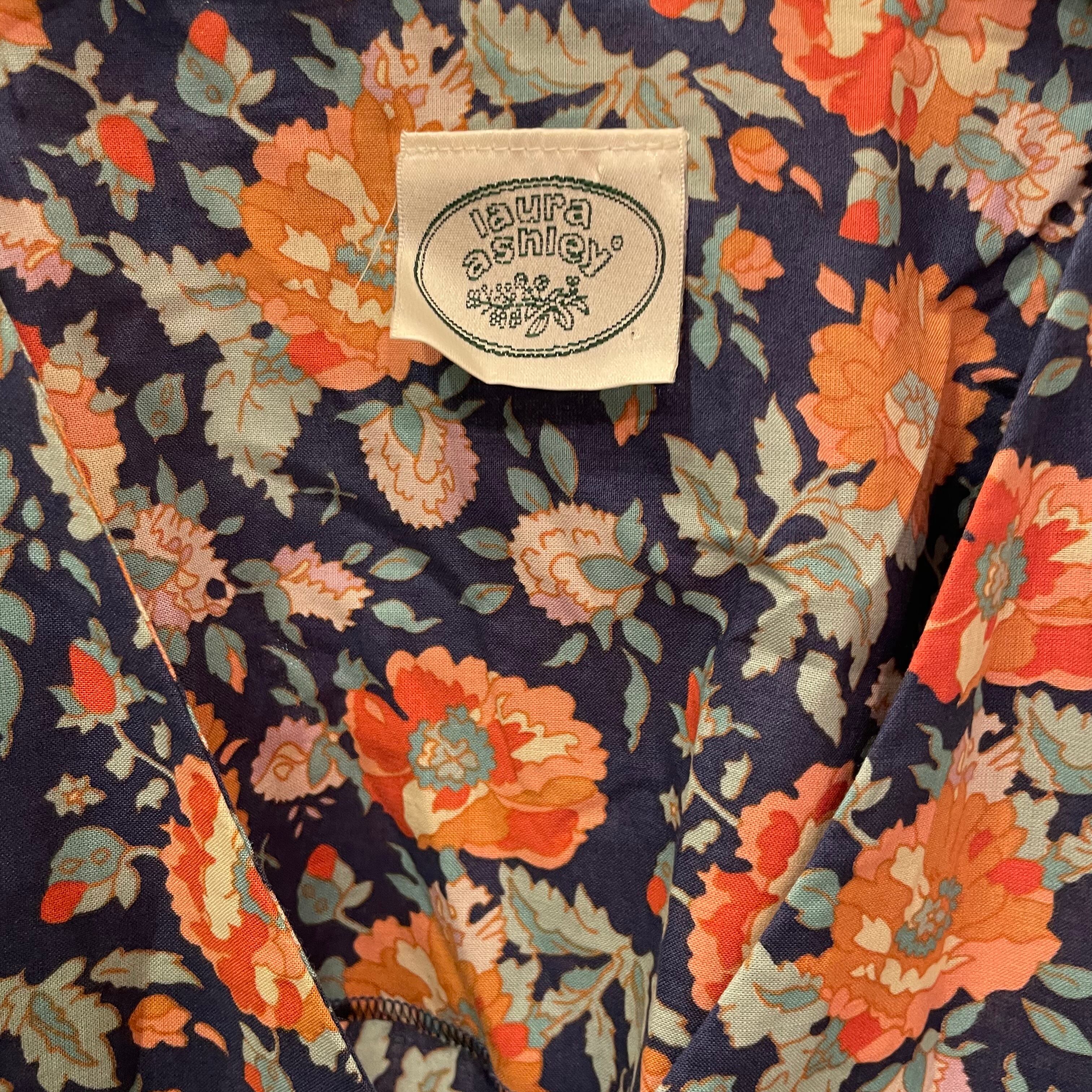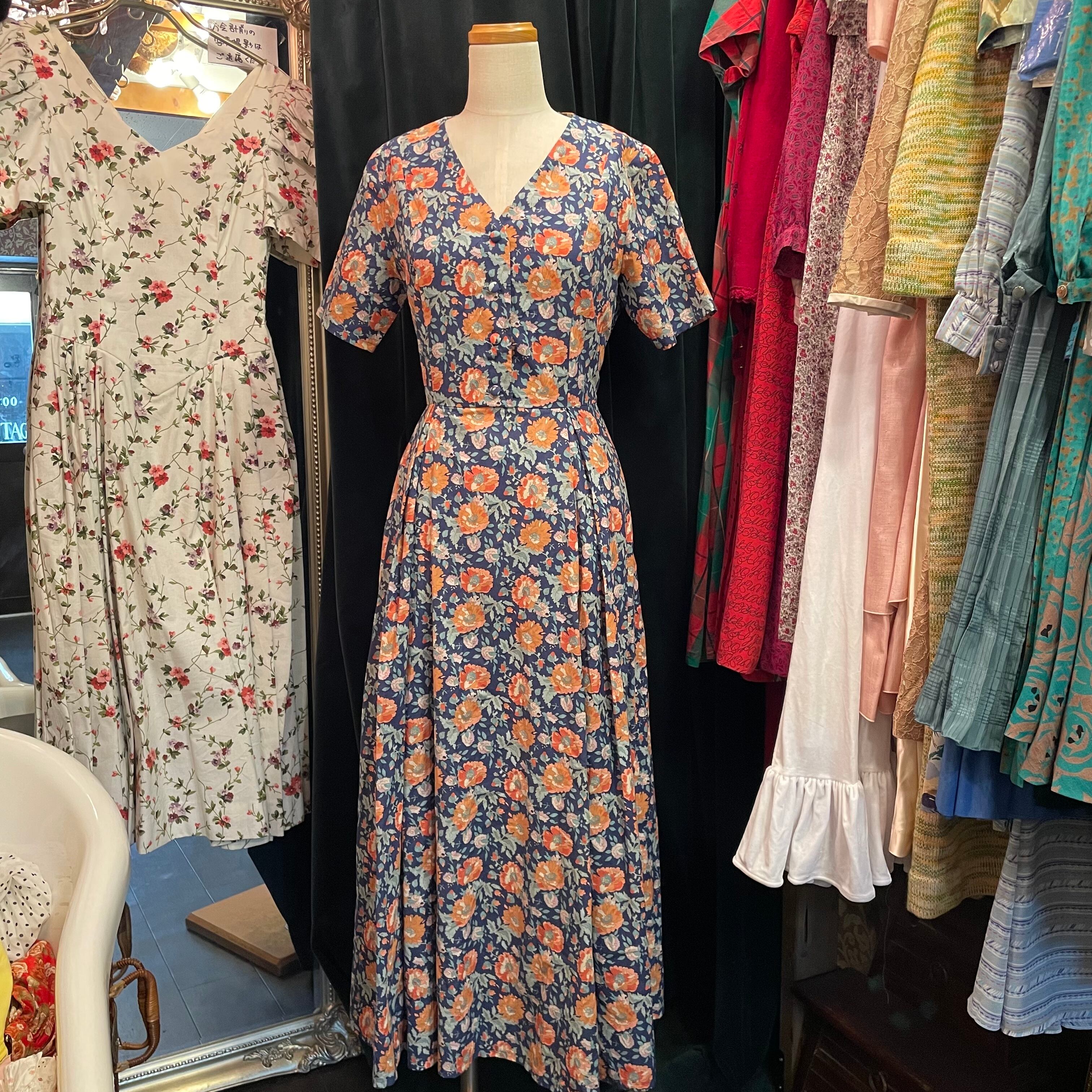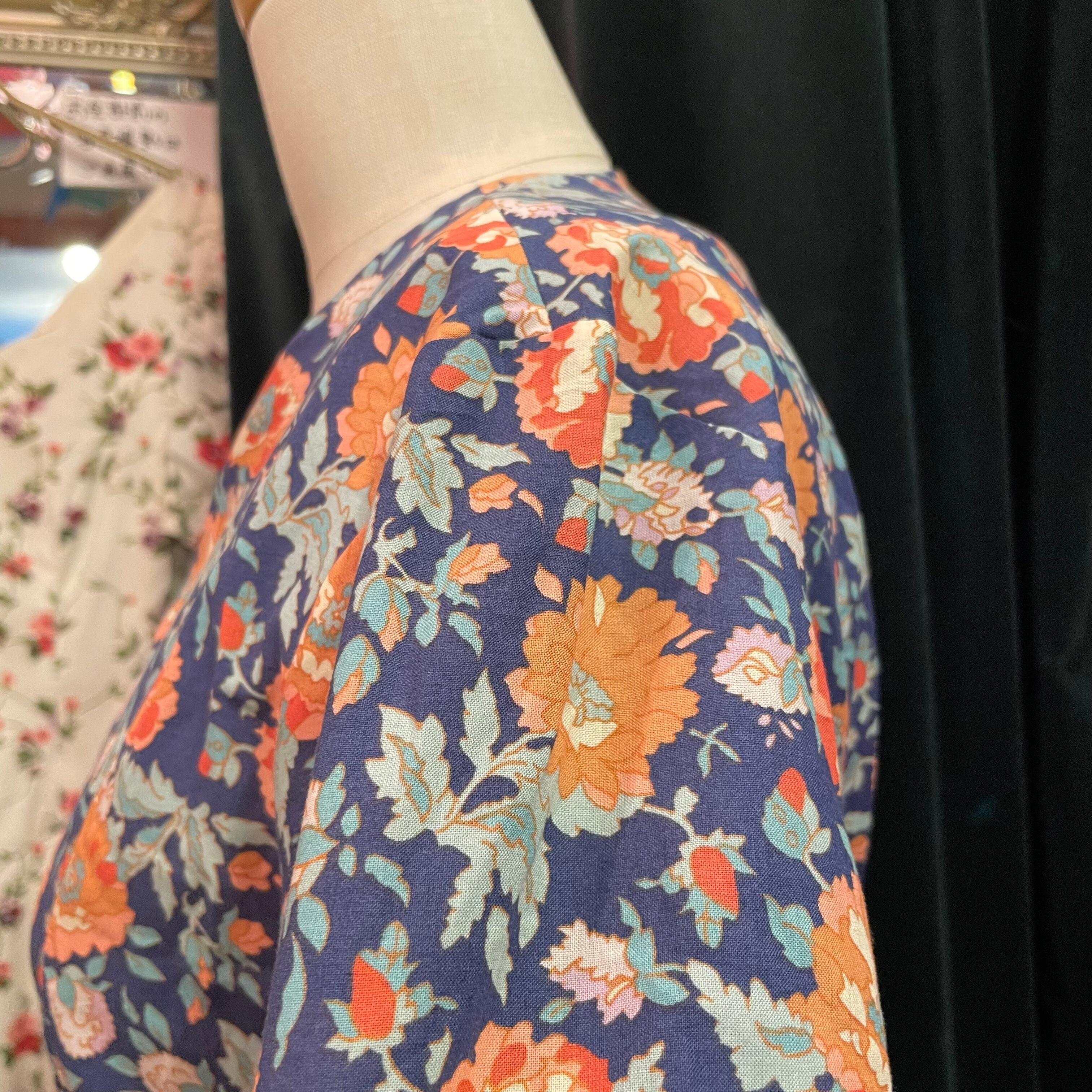 ローラアシュレイの青地にカラフルな花柄のワンピースです。