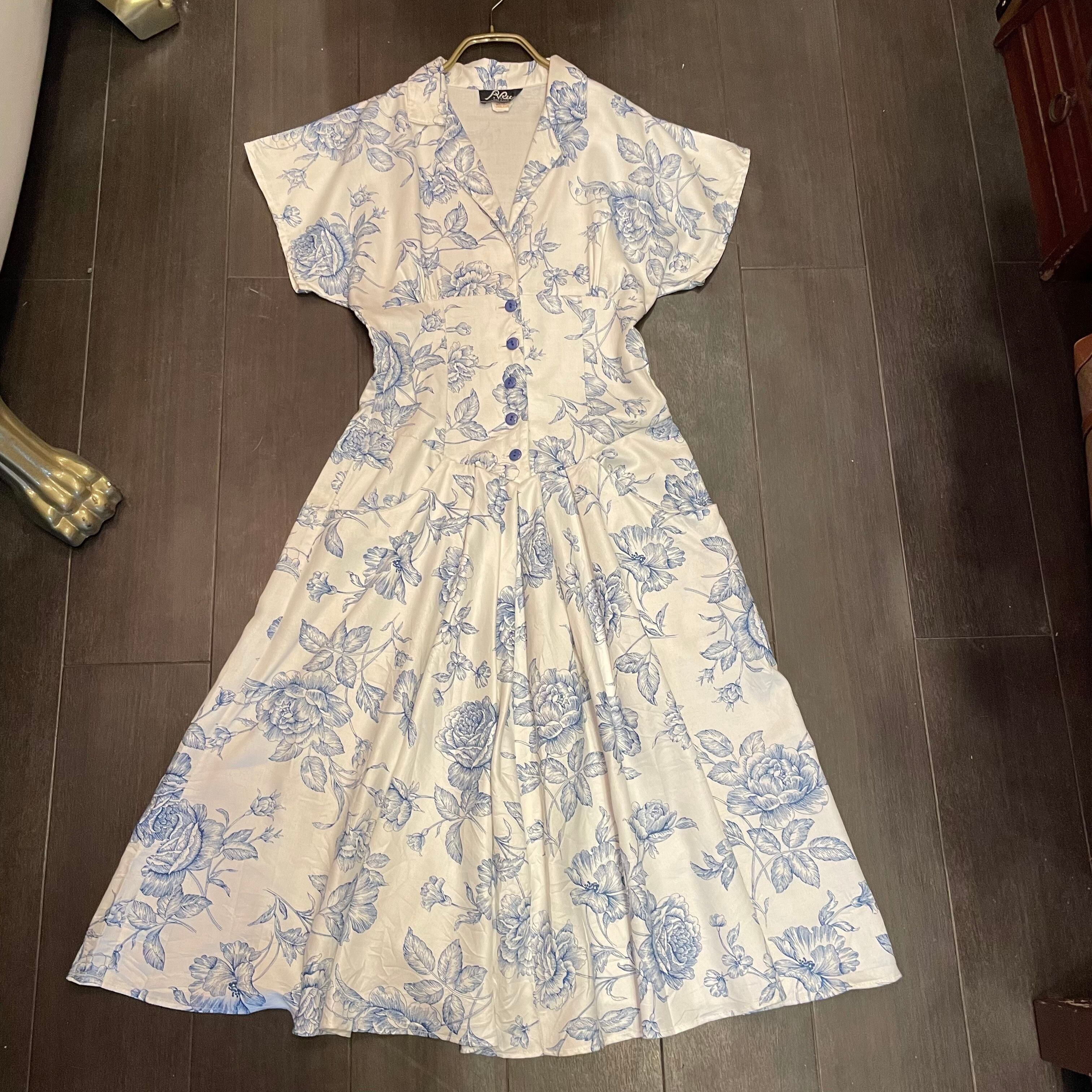 白地に青のペンで描かれた花柄がプリントされている生地で作られたvintageワンピースです。