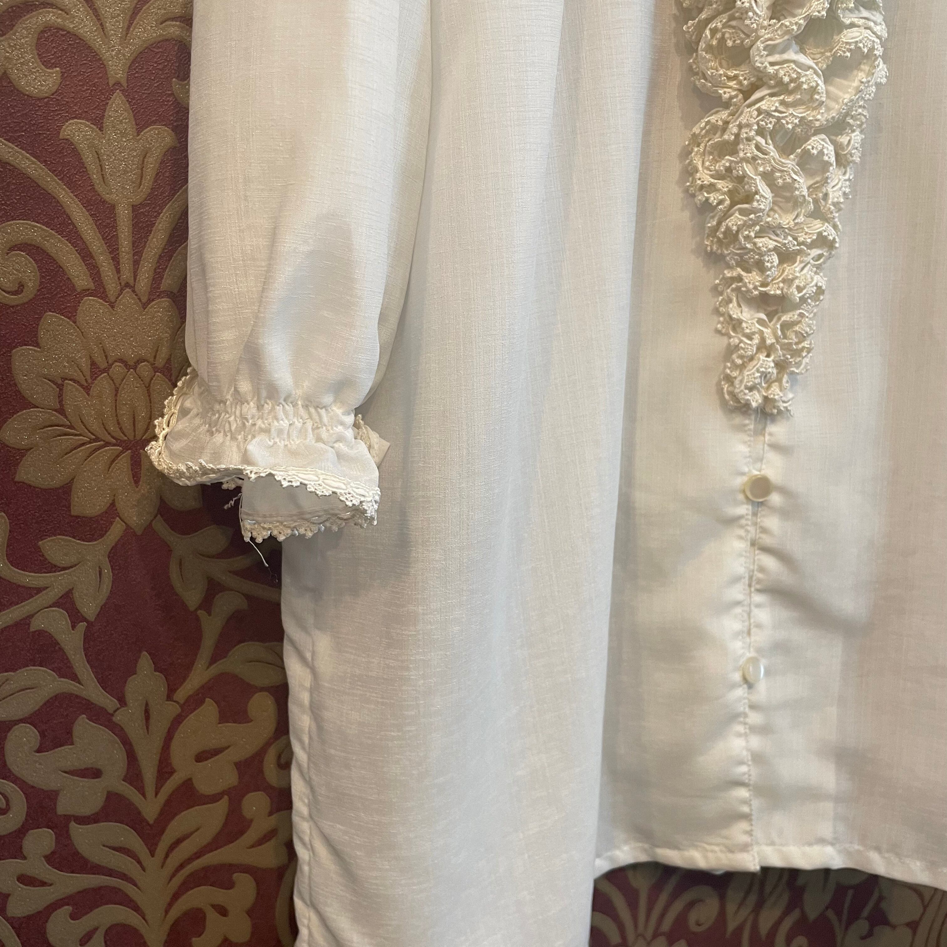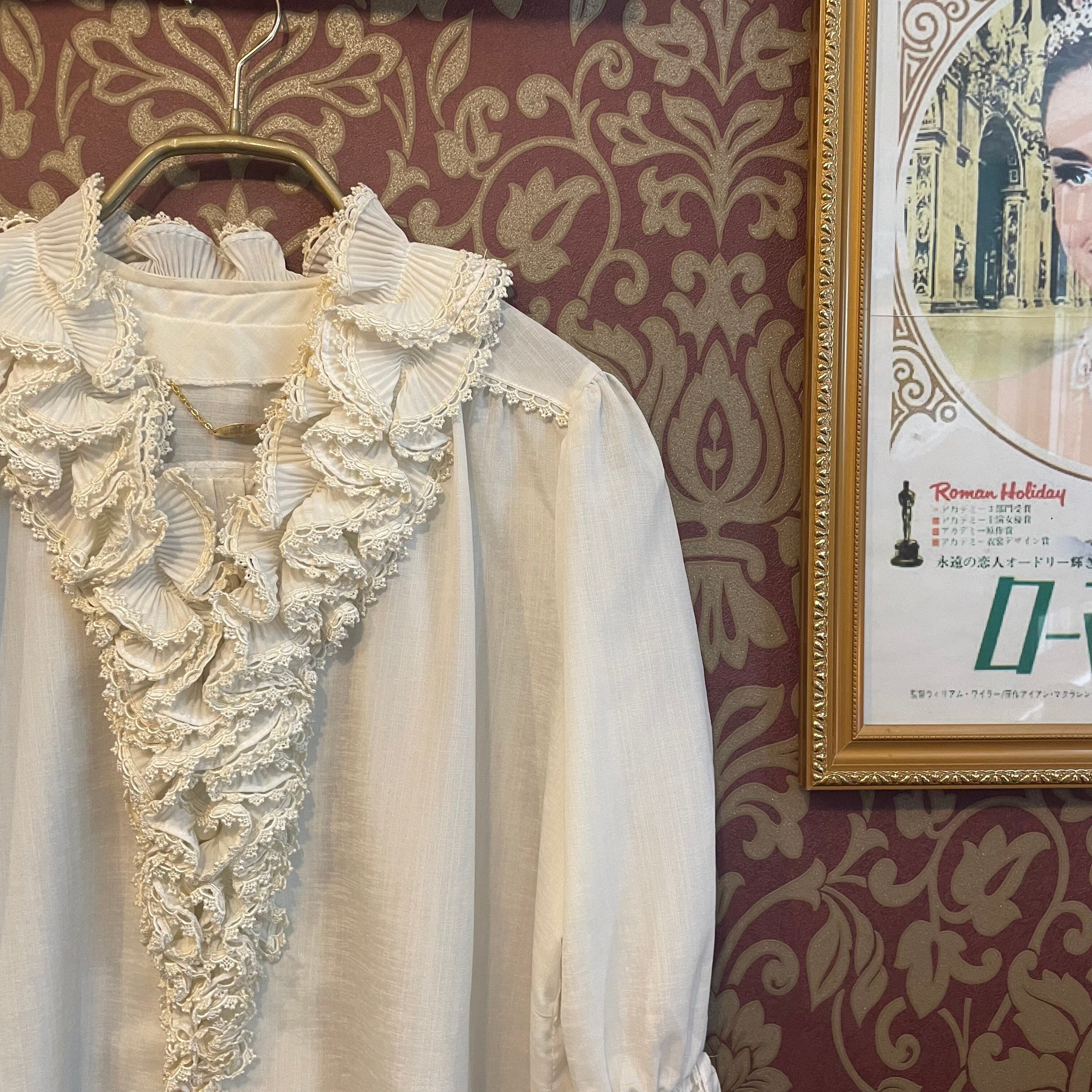 フリルとレースで豪華に装飾された袖が短めのブラウスは珍しいかと思います。