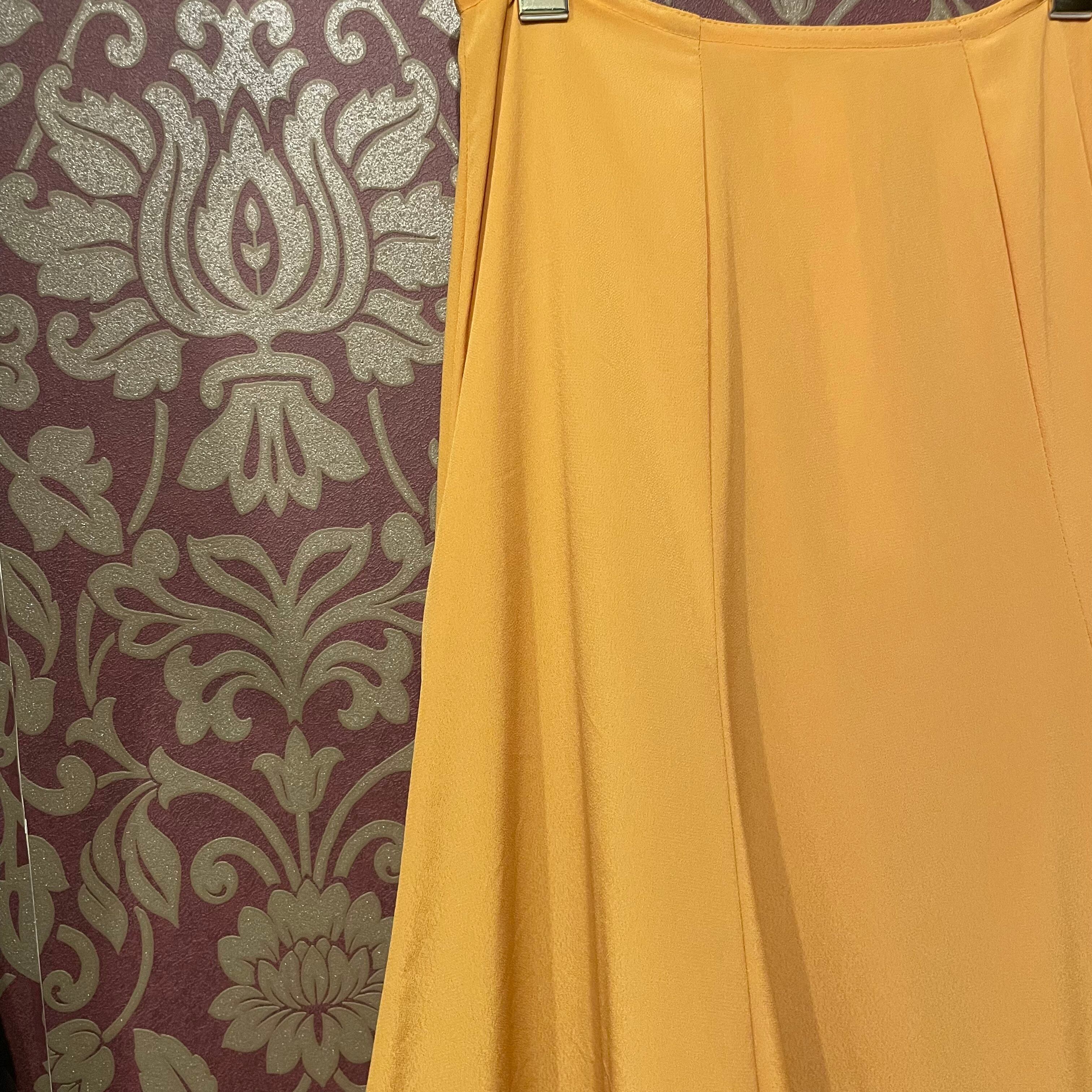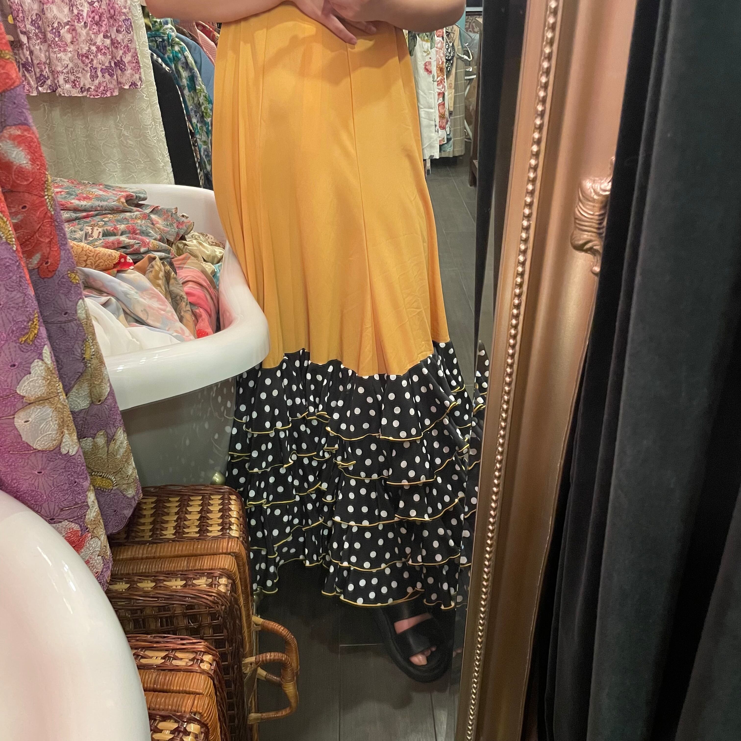 山吹色に黒地のドット柄フリルが付いたピエロのようなロングスカートです。
