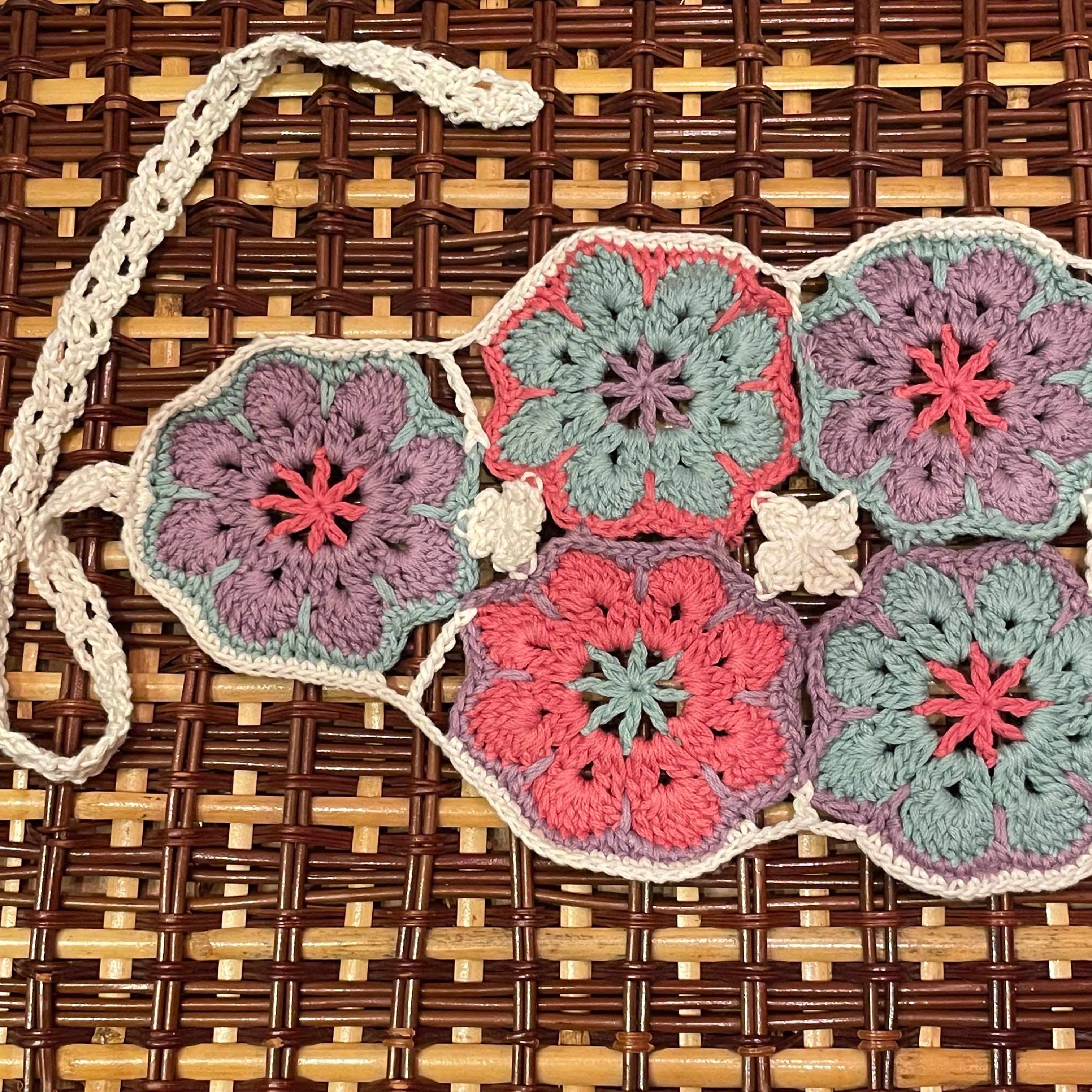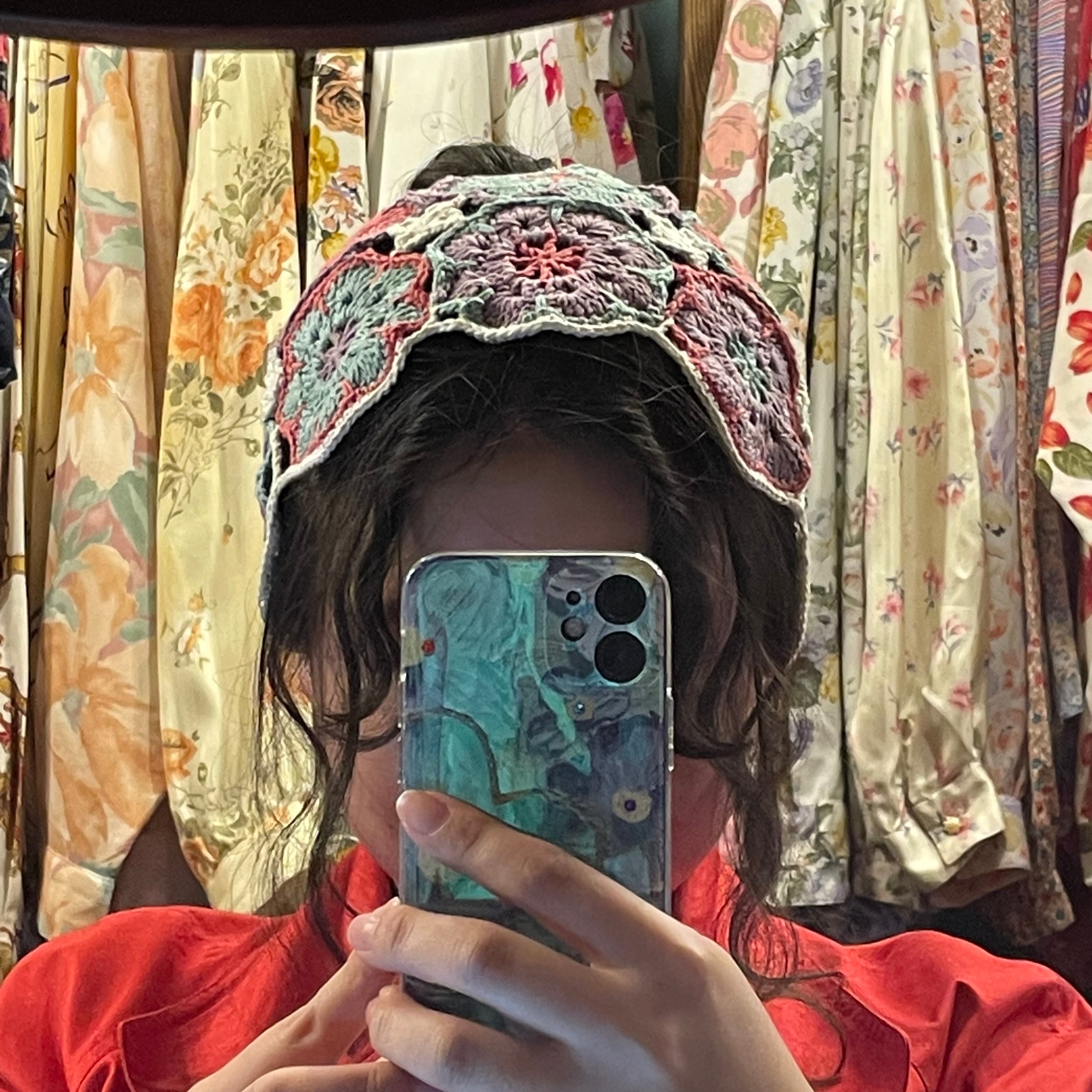 かぎ針編みで作ったグラニースクエアのヘッドドレスのような、ボンネットのような、バラクラバのようなものです。