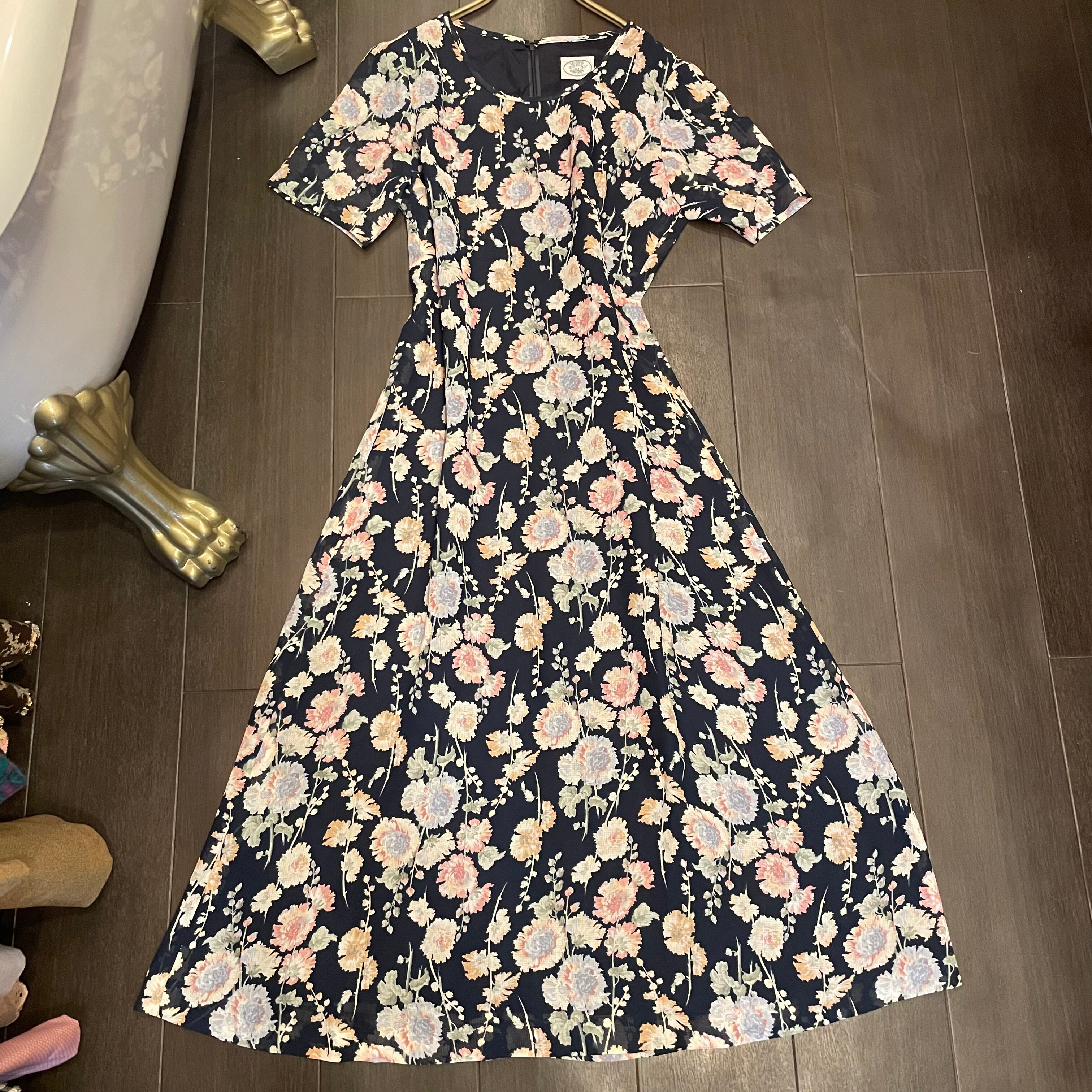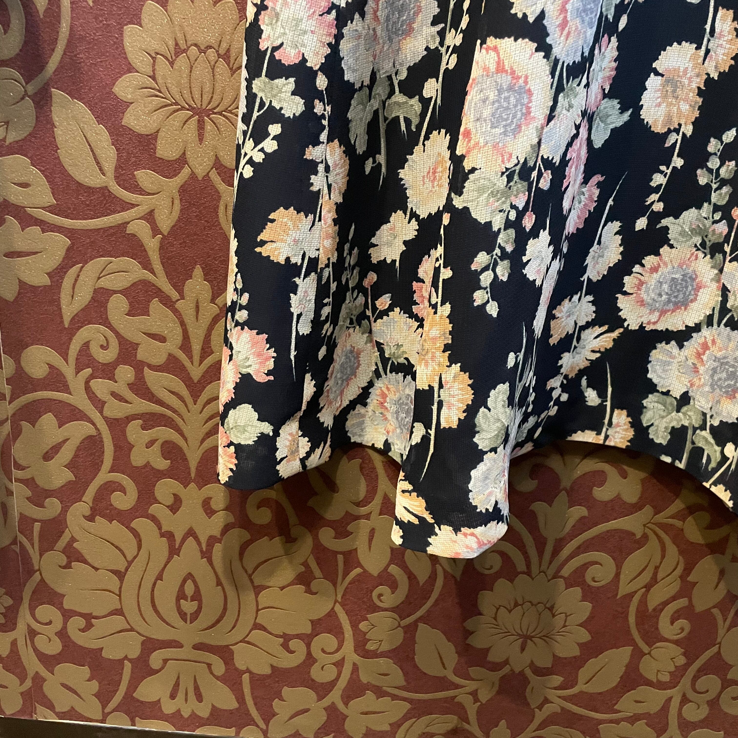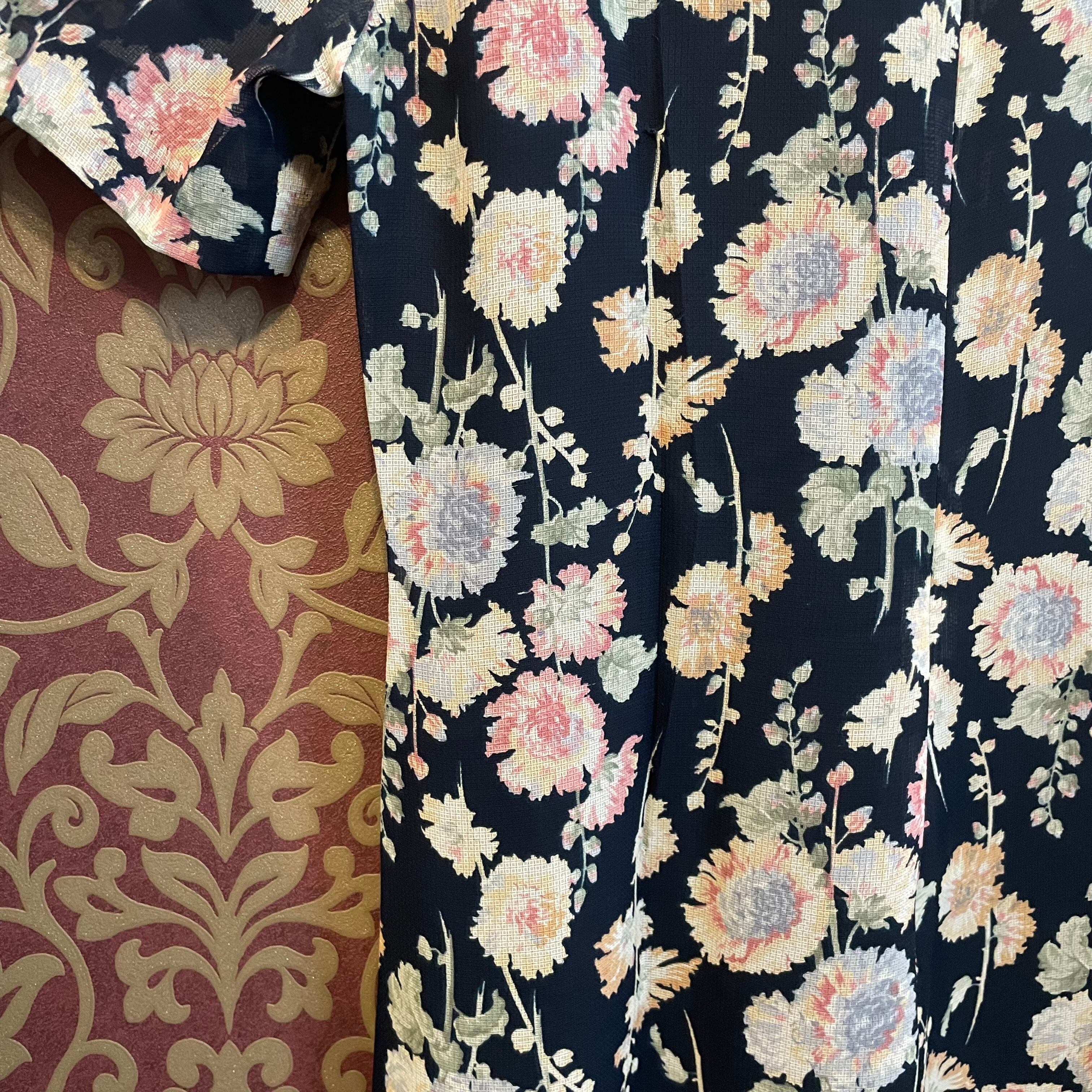 紺地にペールカラーの花柄が映えるステキな一着です。