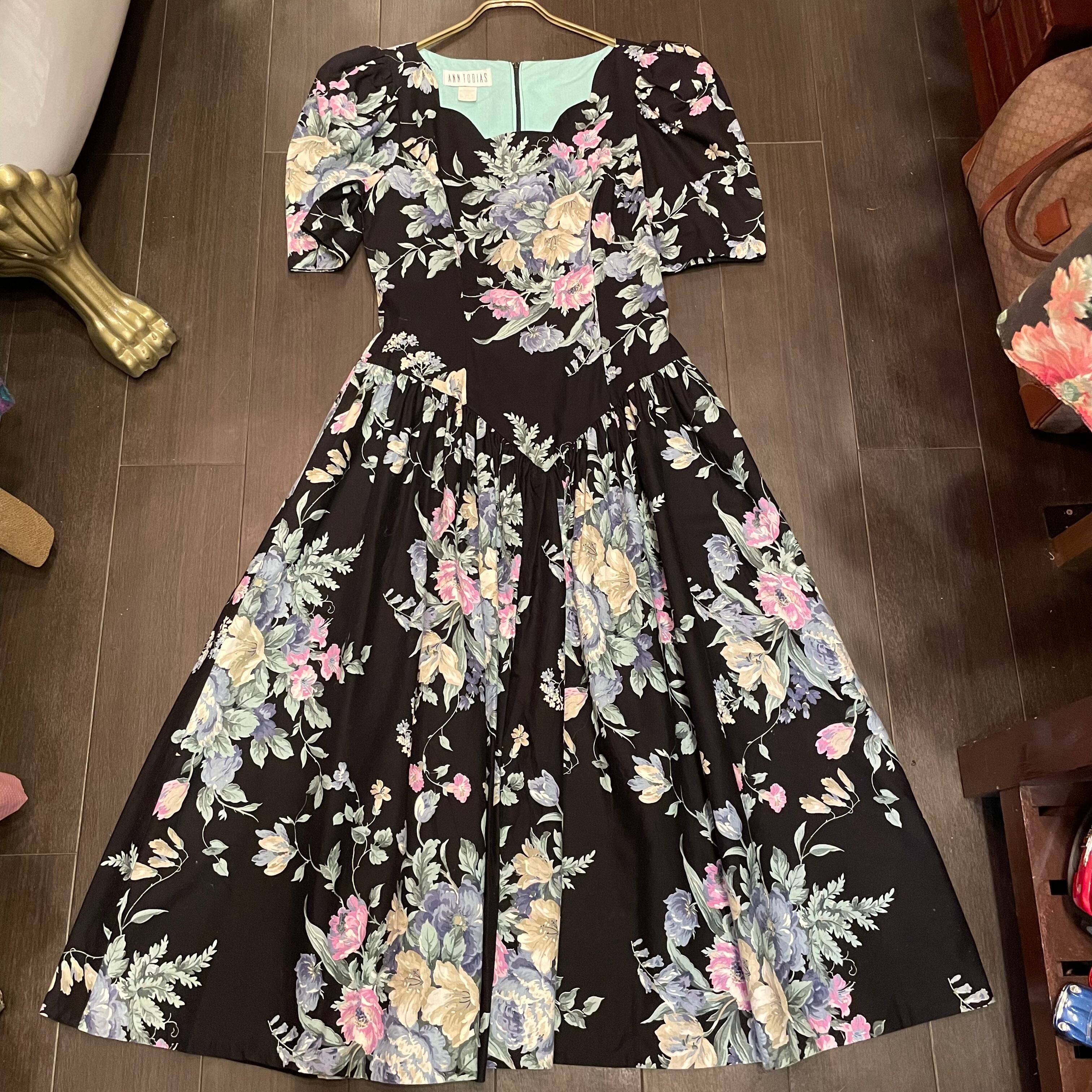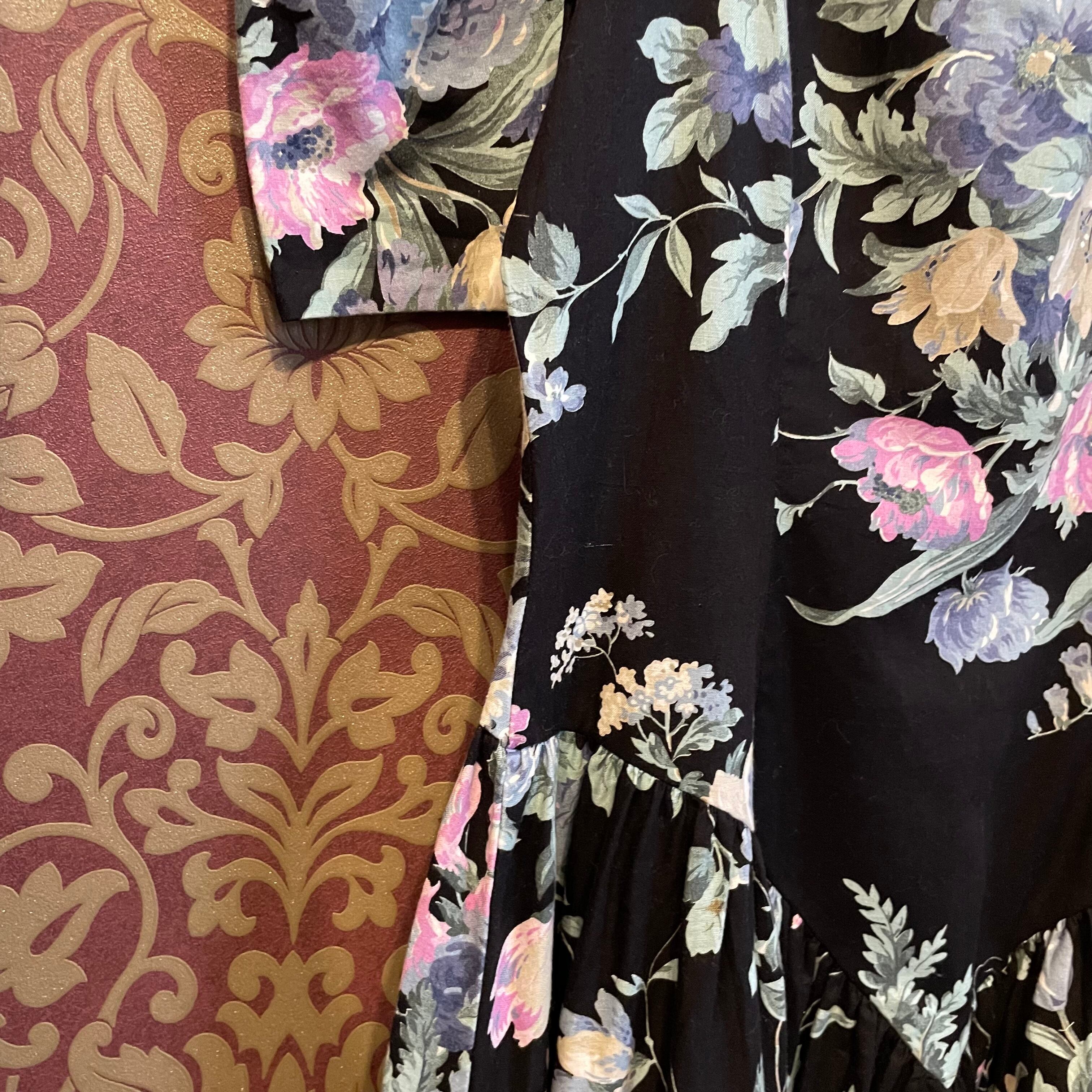 カラフルな優しい色合いの牡丹のような花柄の80sワンピースです。