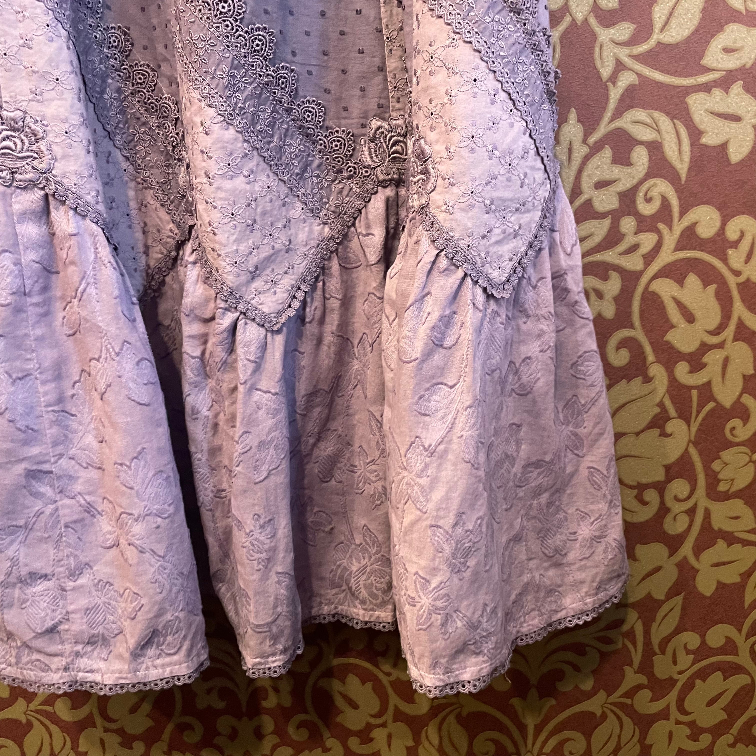 落ち着いたくすみ紫色で少しずつ違う生地やレースが豪華に使われています。