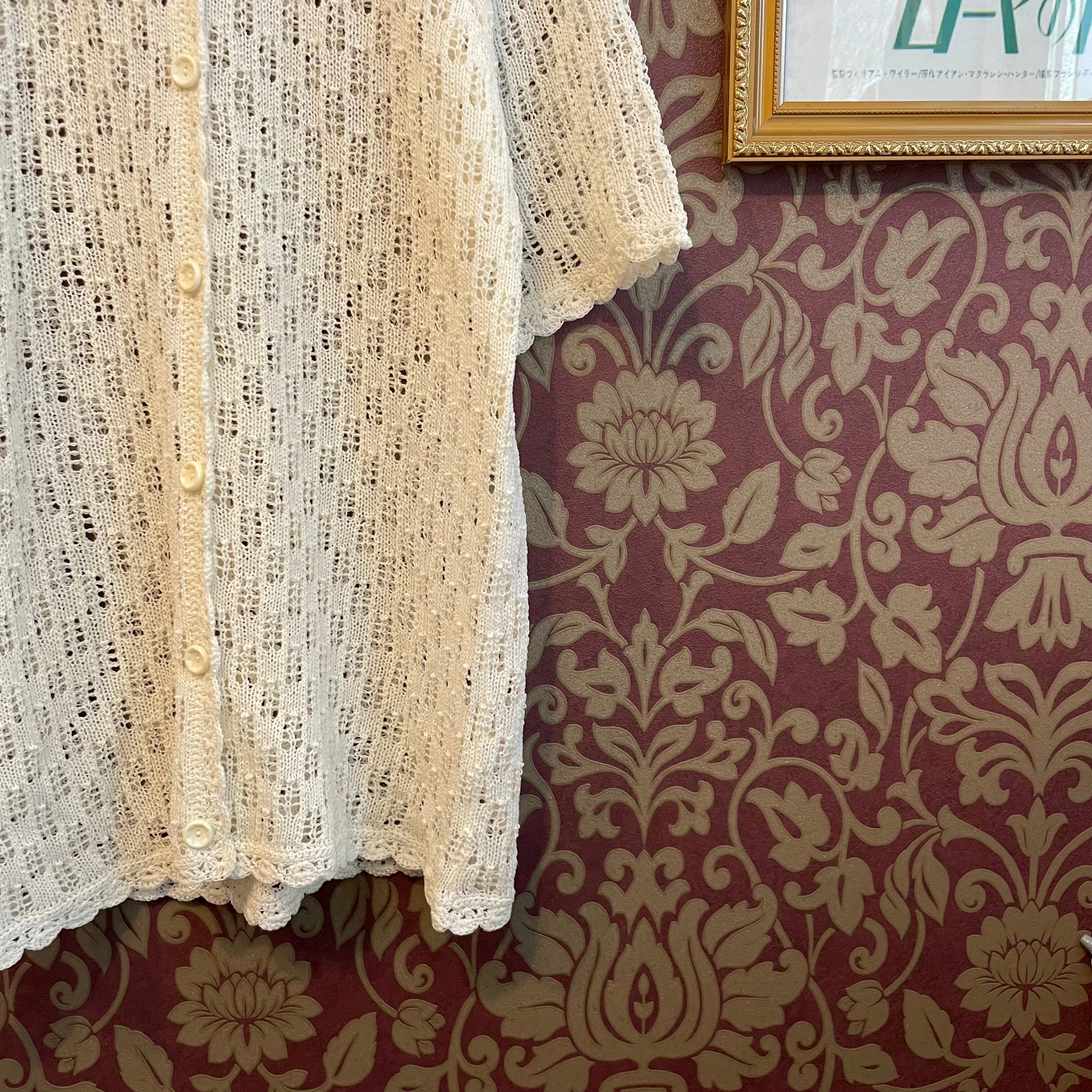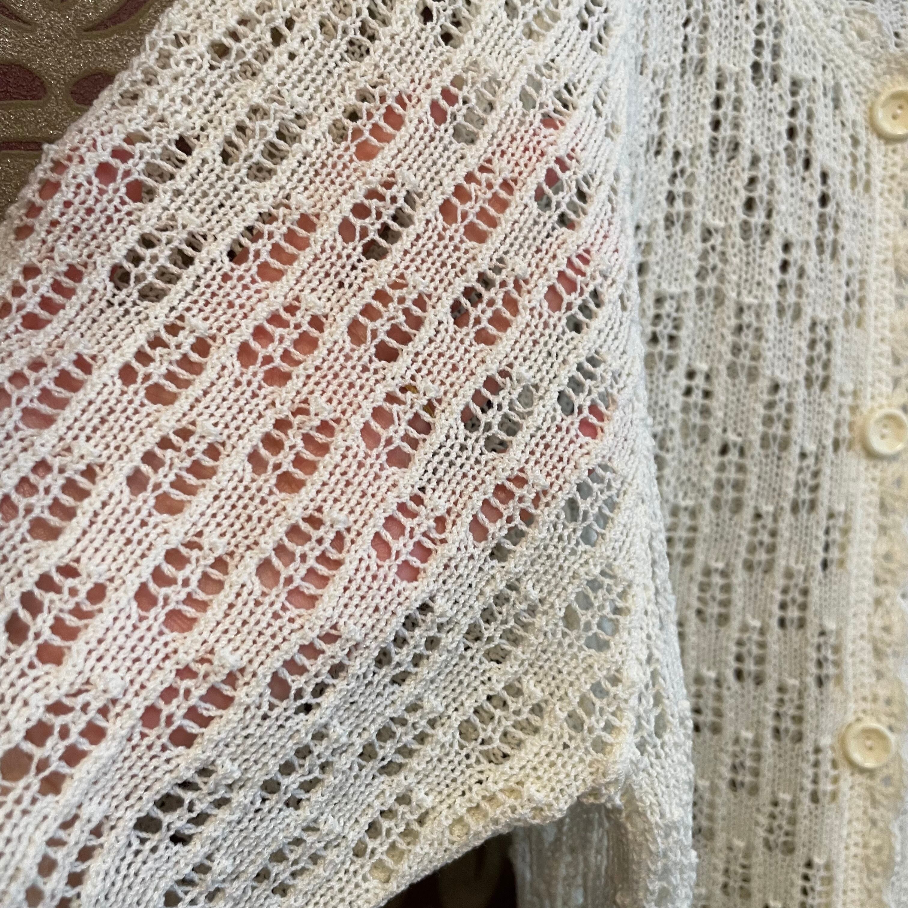 細めの白いアクリル糸で編まれたサマーカーディガンです。