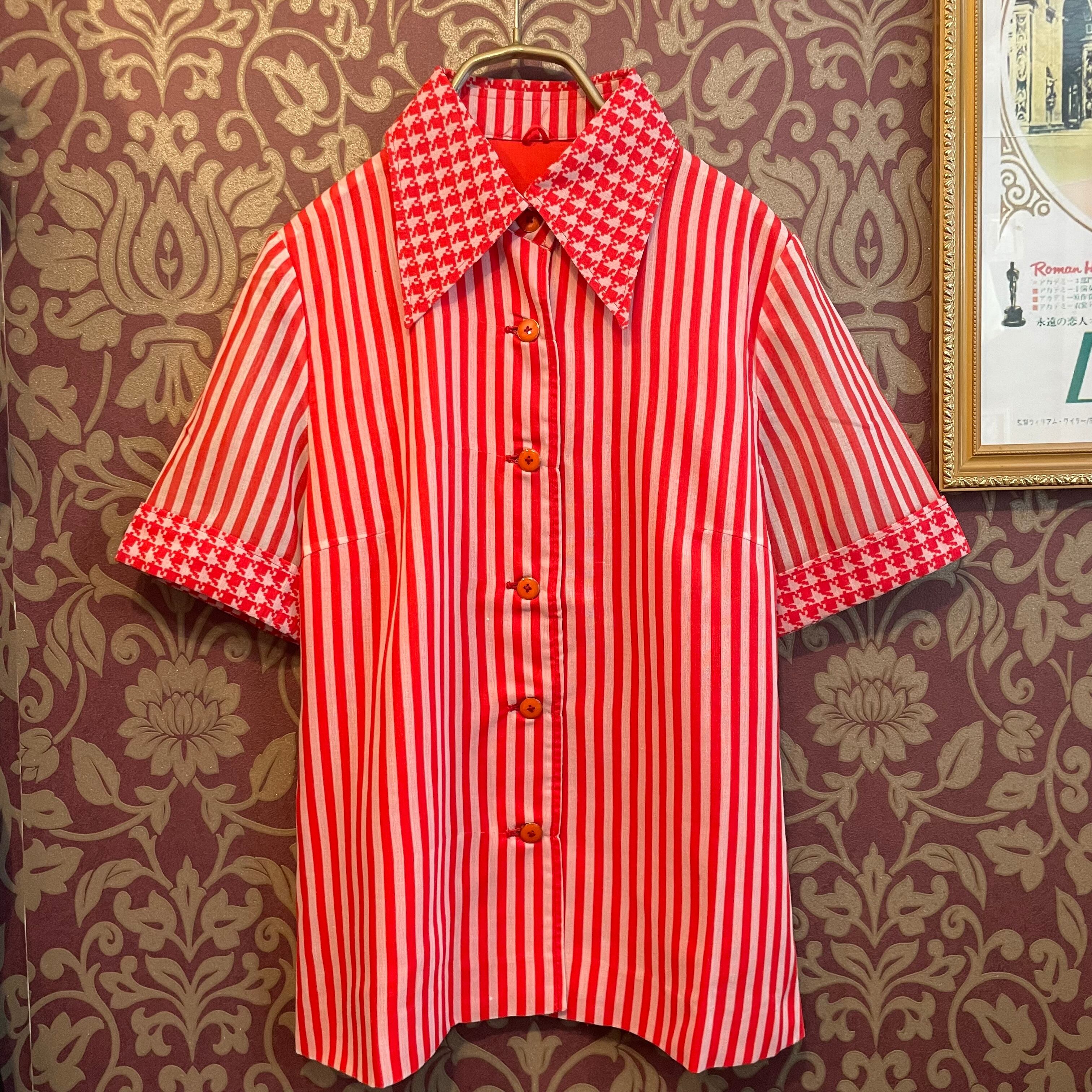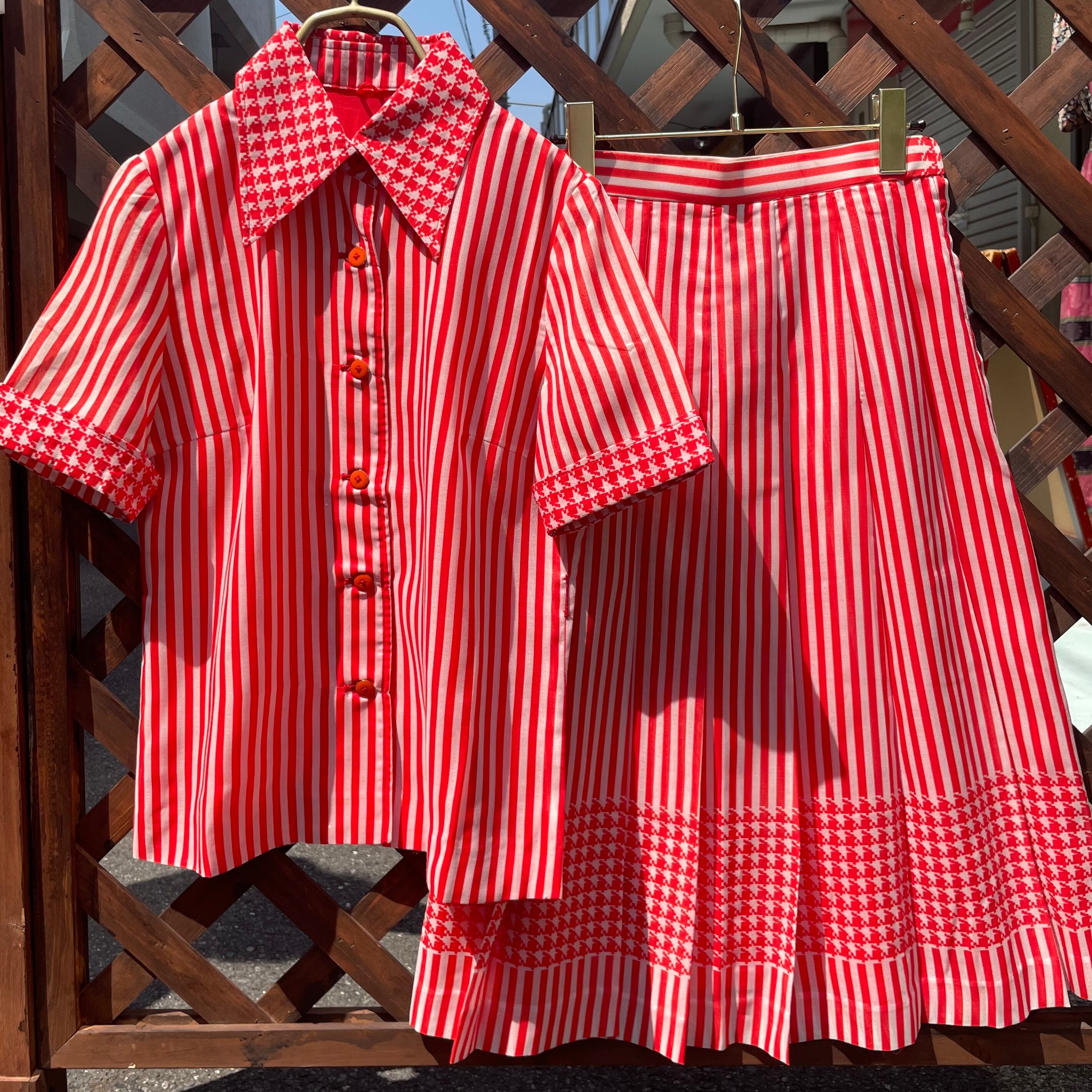 70年代ならではの大きな襟が特徴的なブラウスとスカートのセットアップです。
