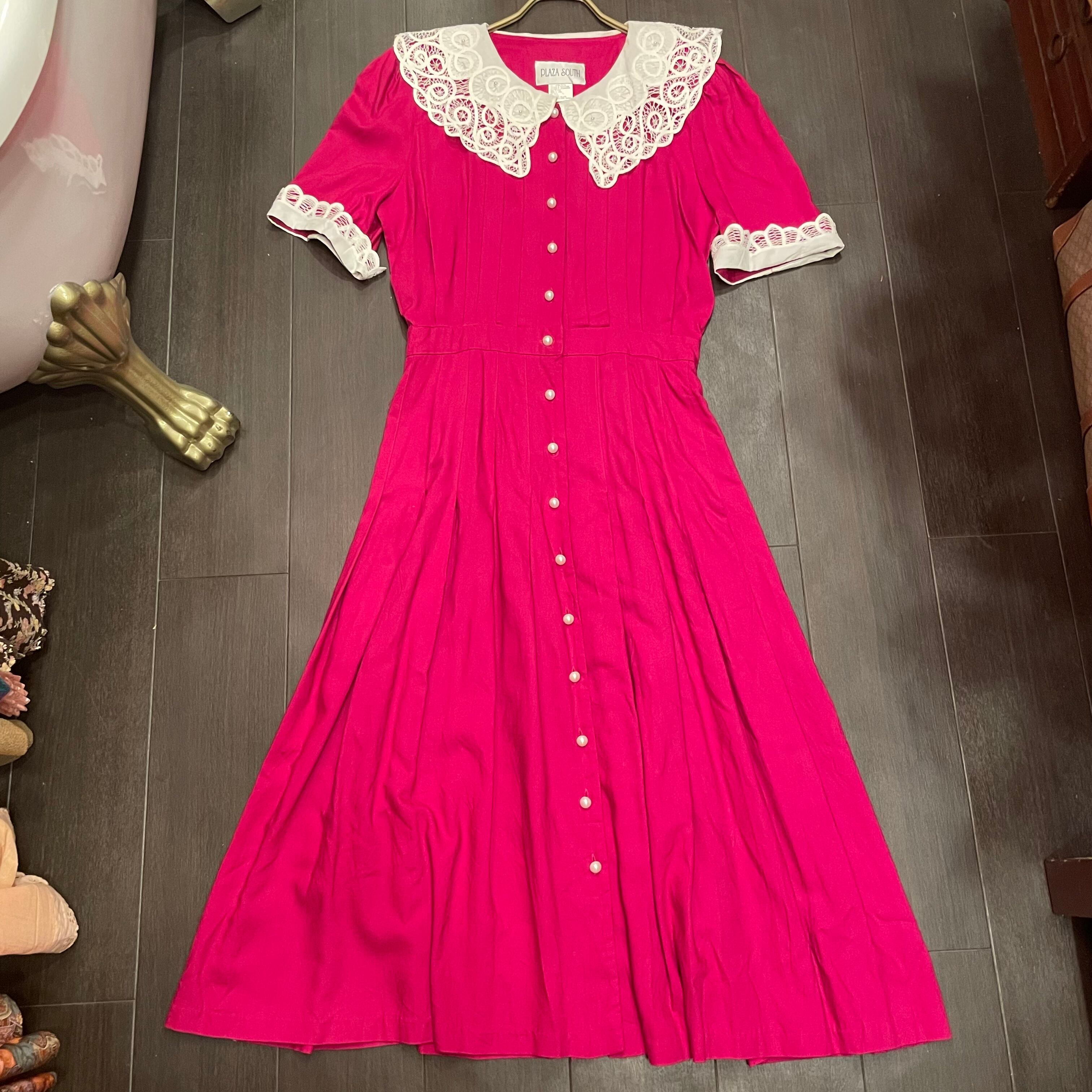 襟と袖口にはパールを使用したクロシェレースが使われていて白とピンクのコントラストが美しいです。