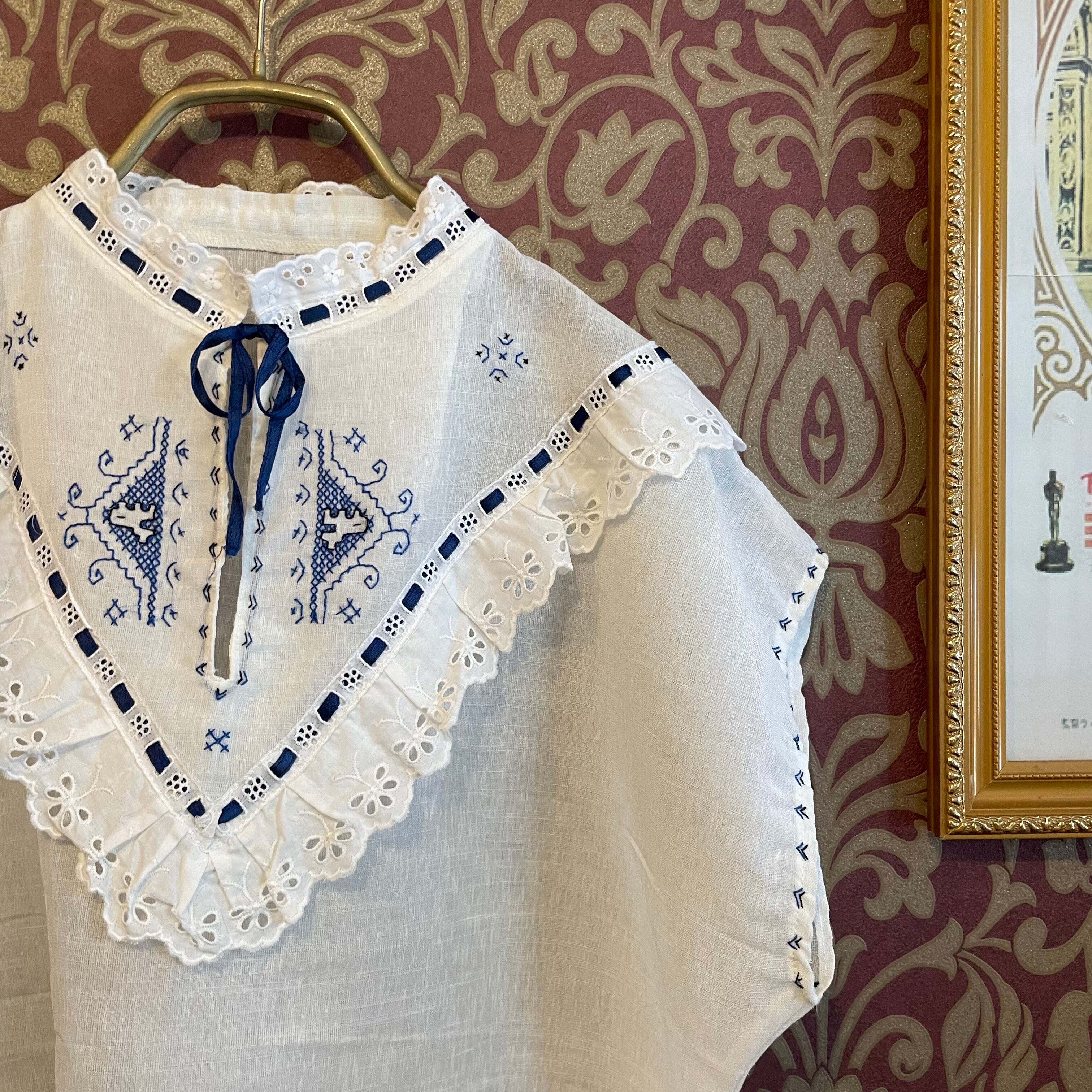 白のヴィンテージブラウスに手刺繍が施された一着です。