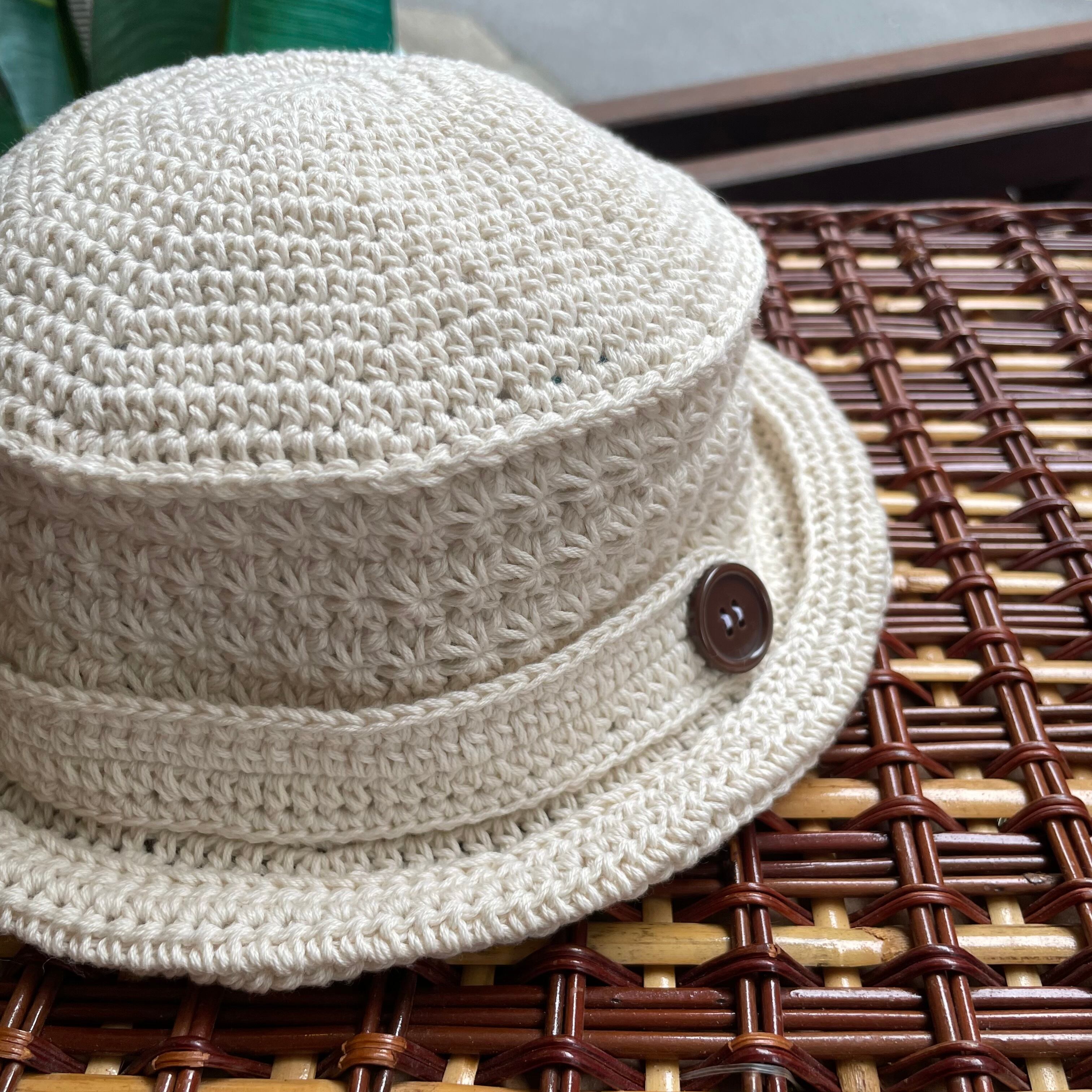 丸みを帯びたトップに、サイドクラウンは細かな花模様に、ブリムはくるんと上に丸まったシルエットに仕上げました。