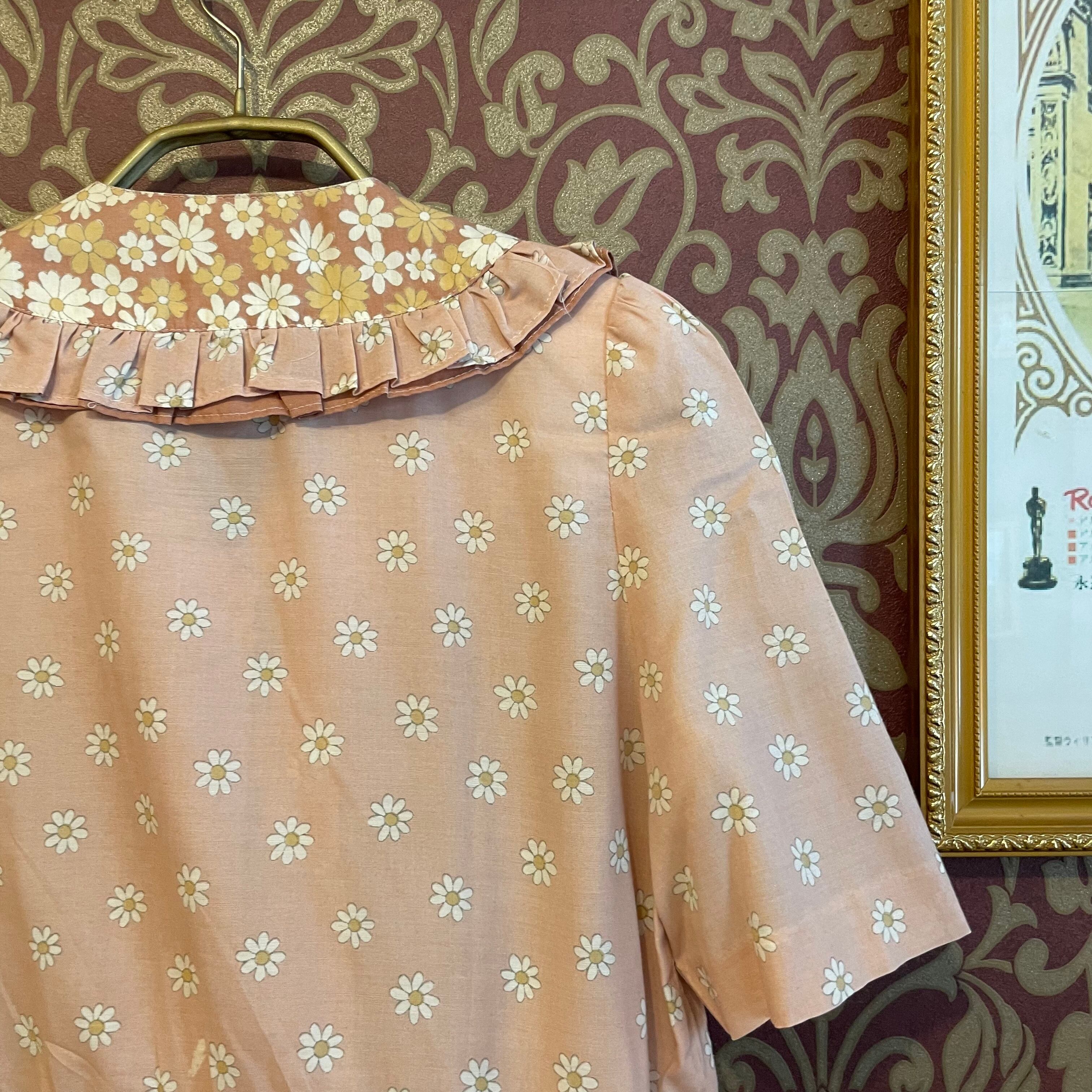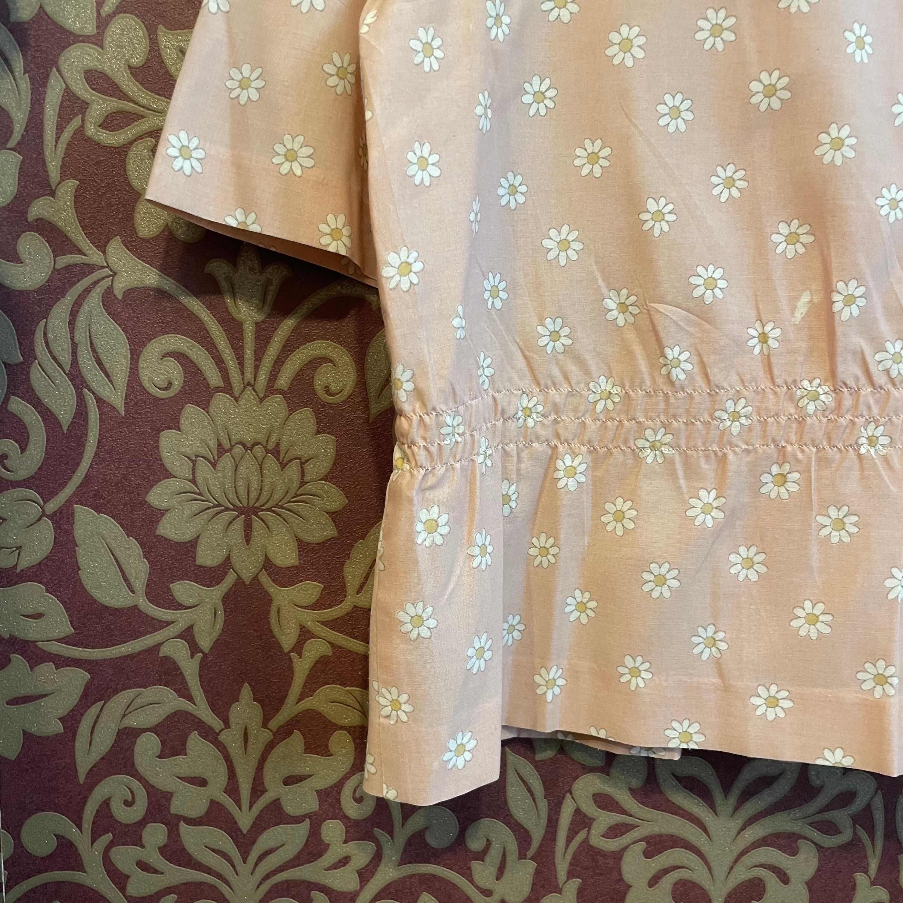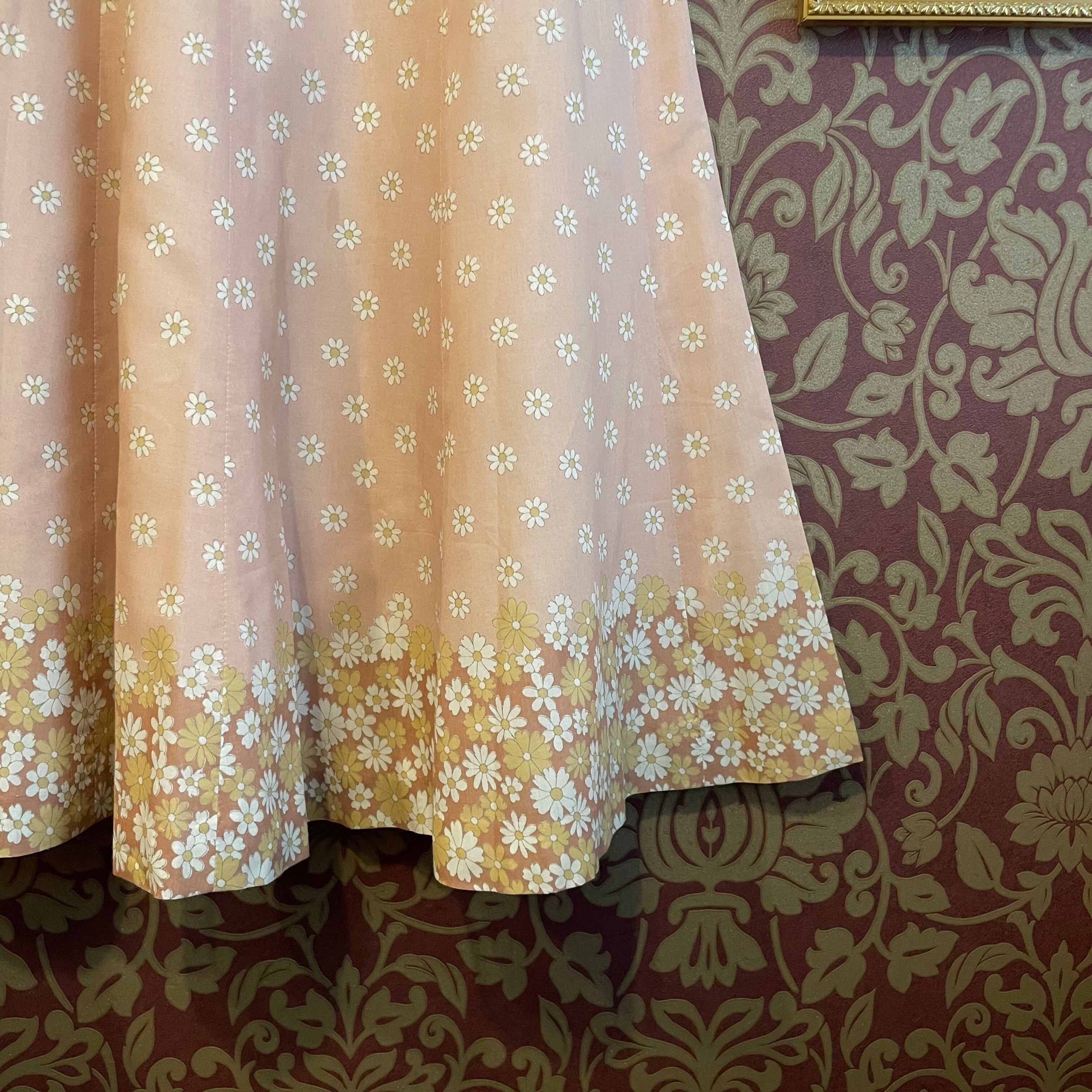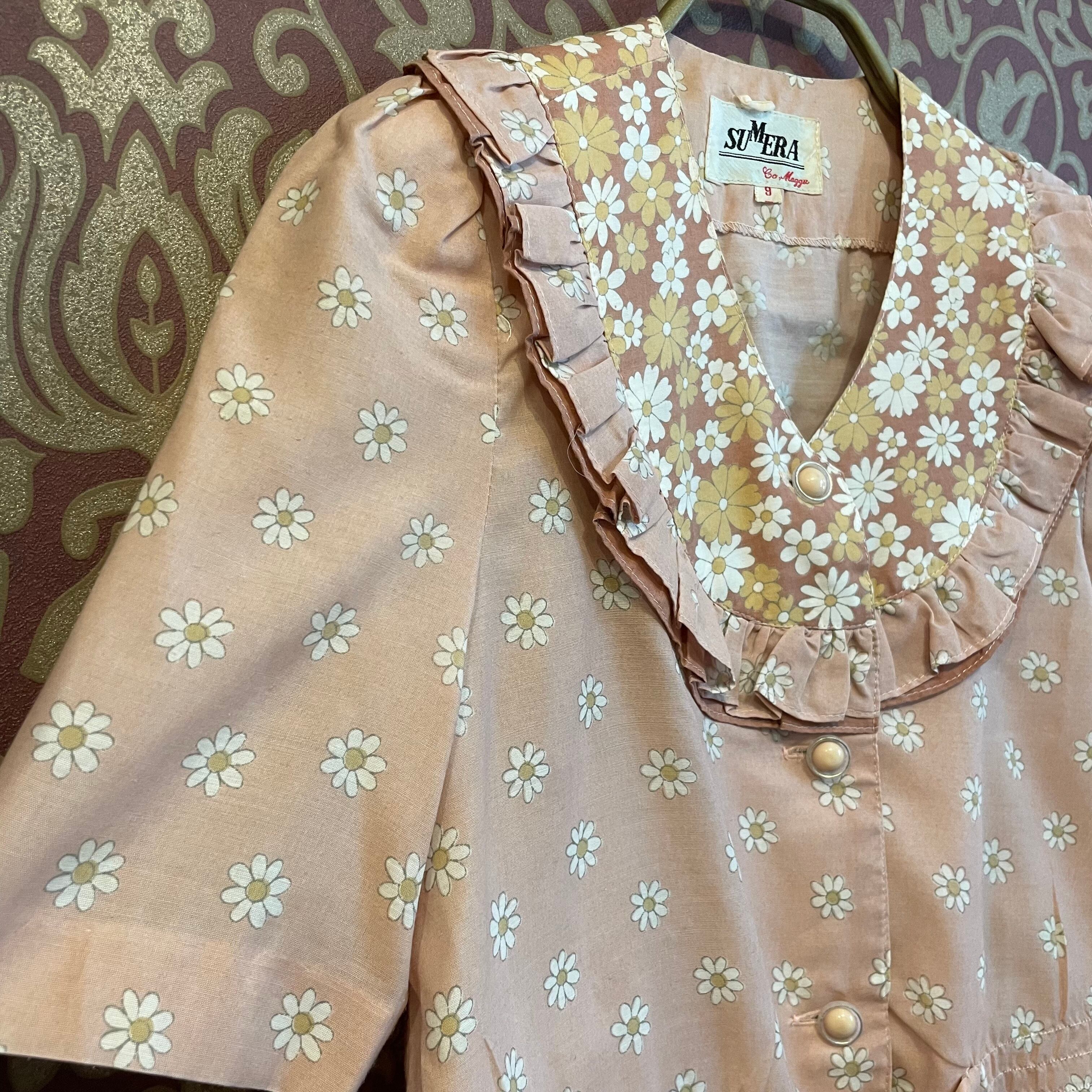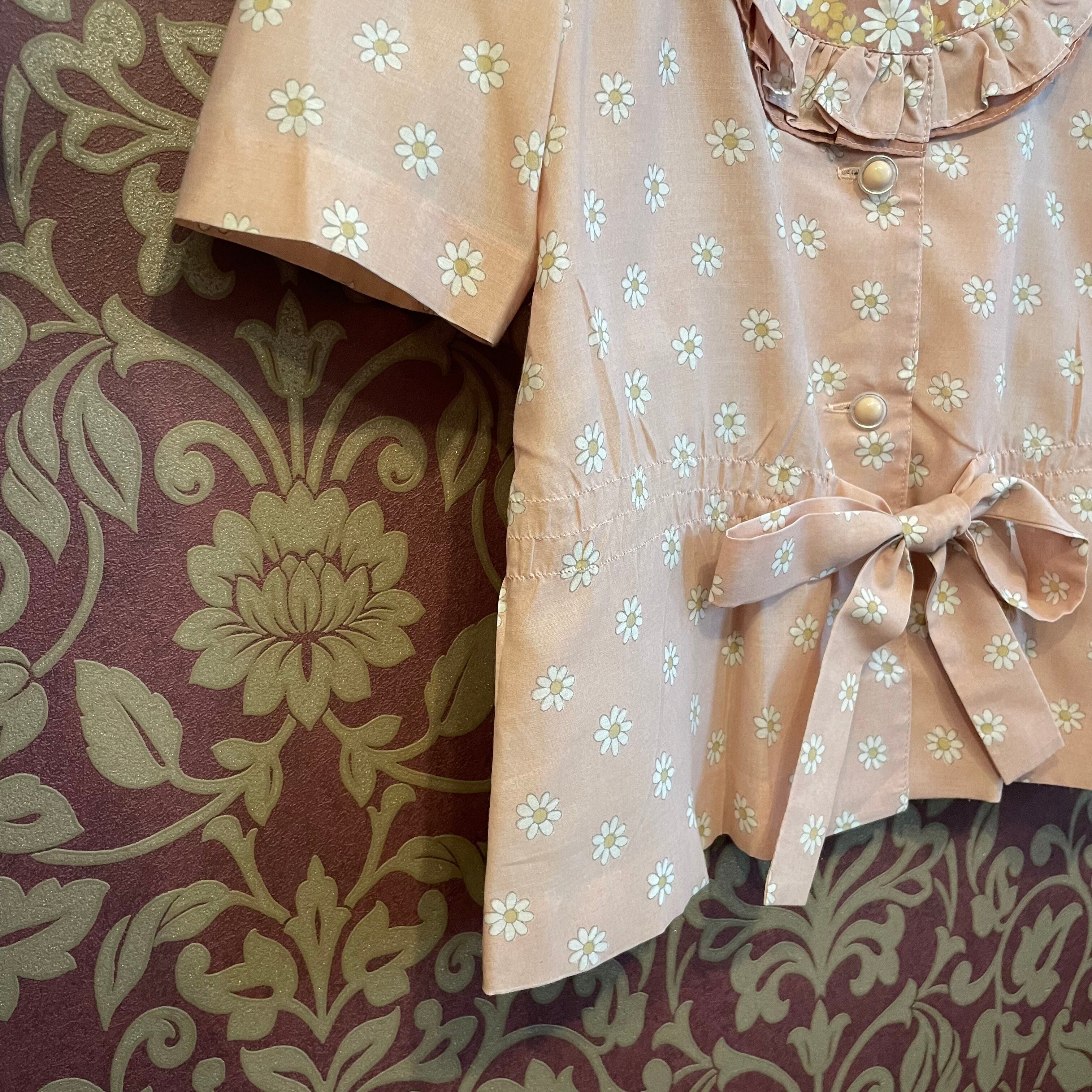 桜ピンク色の花柄のレトロガーリーなブラウスとスカートのセットです。
