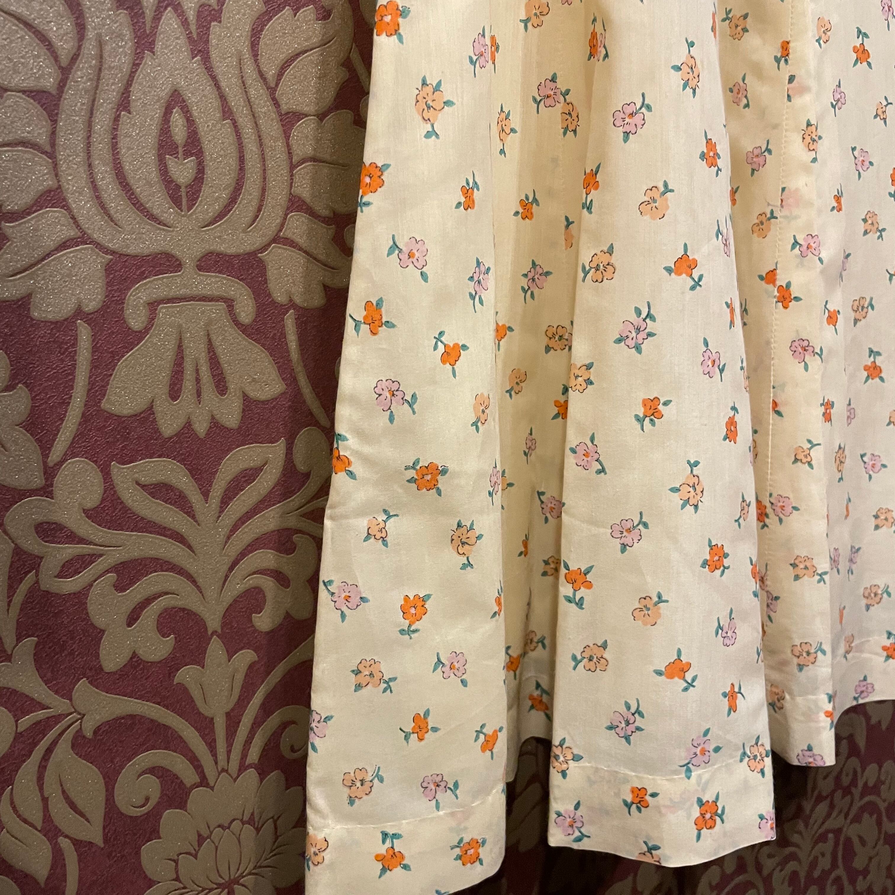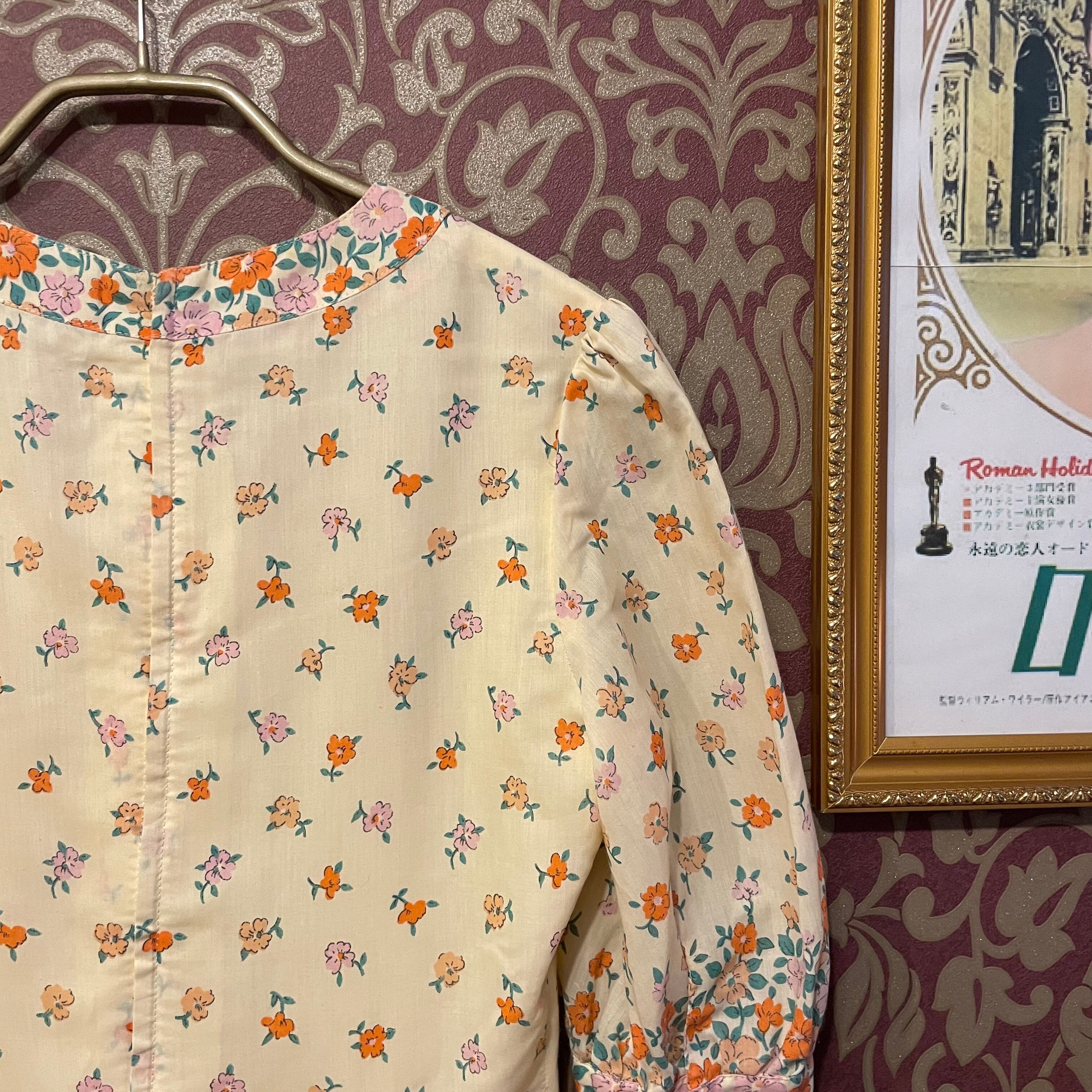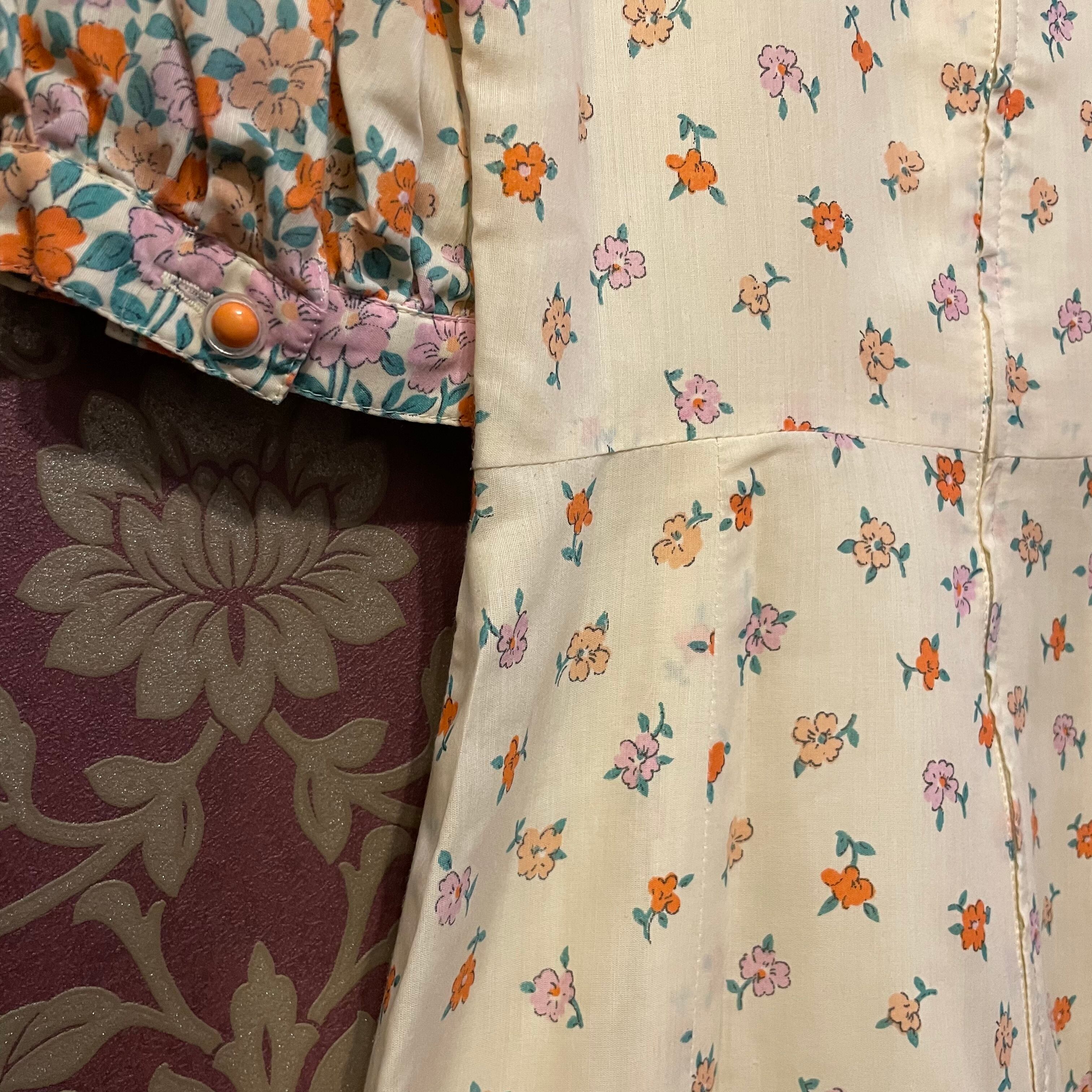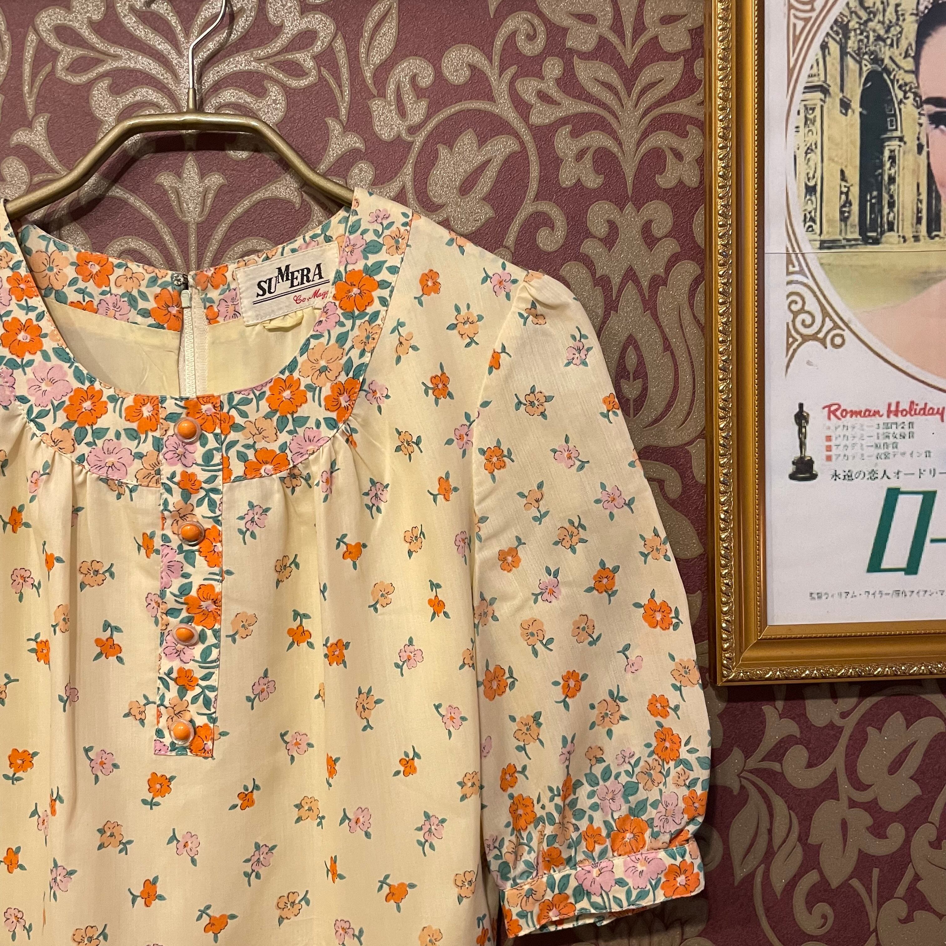 クリームのような淡いベージュにオレンジを基調としたレトロな花柄が可愛らしいワンピースです。