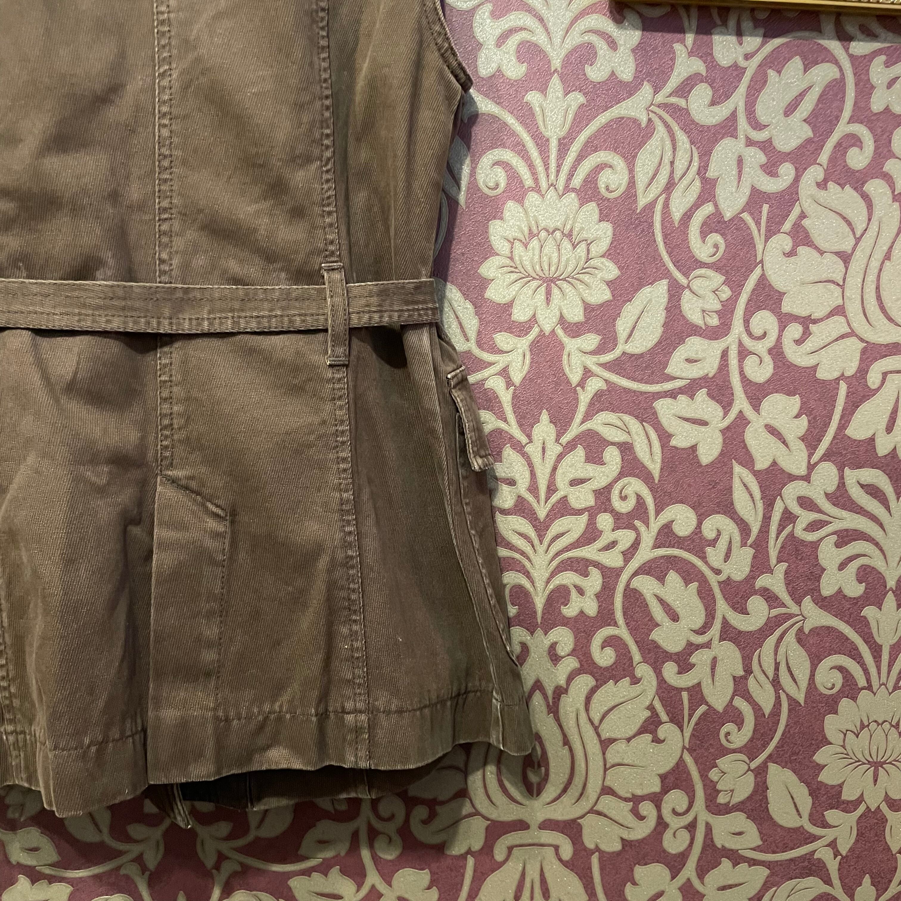 厚手のデニム地で作られていて着丈が長めでベルトがついたサファリ風のベストです。