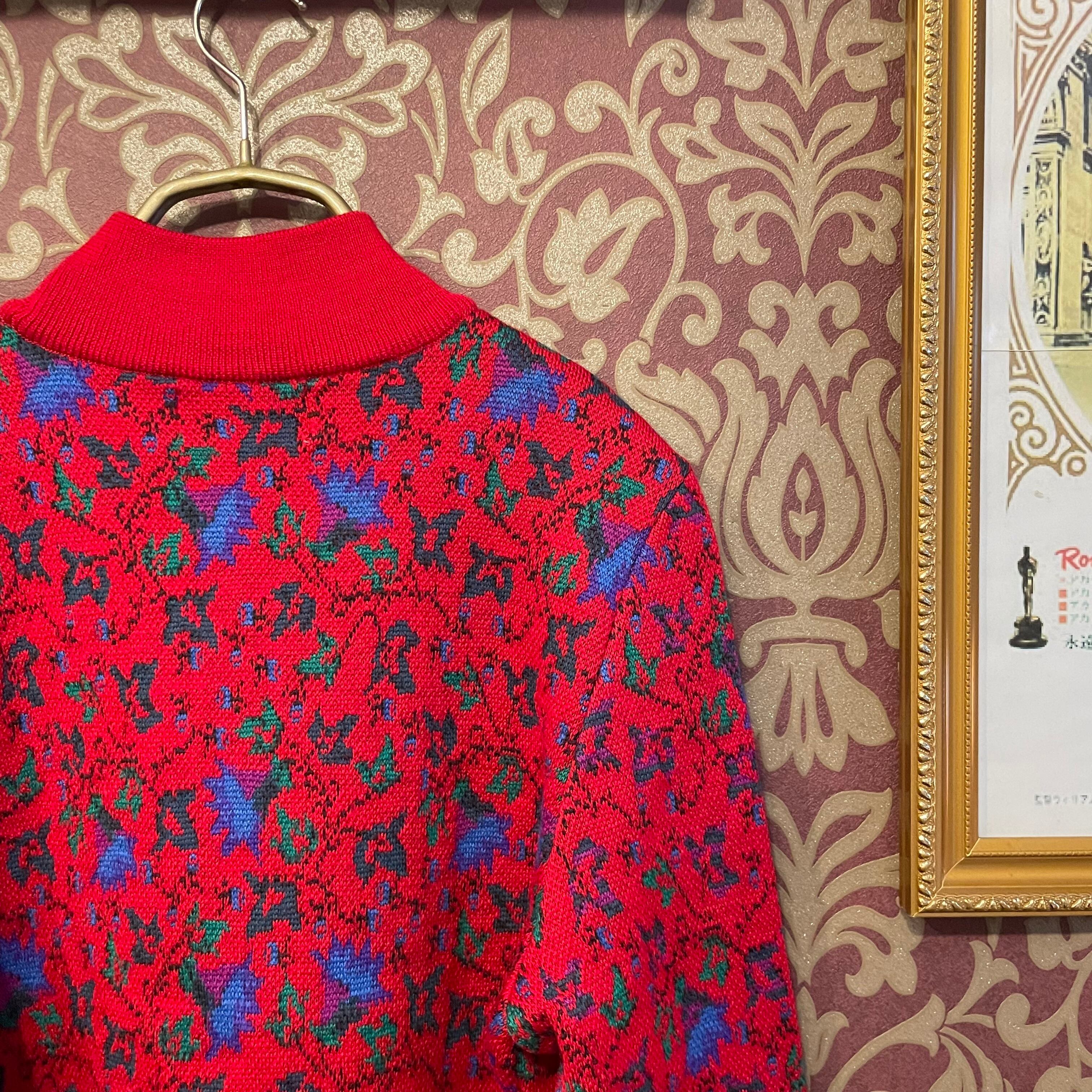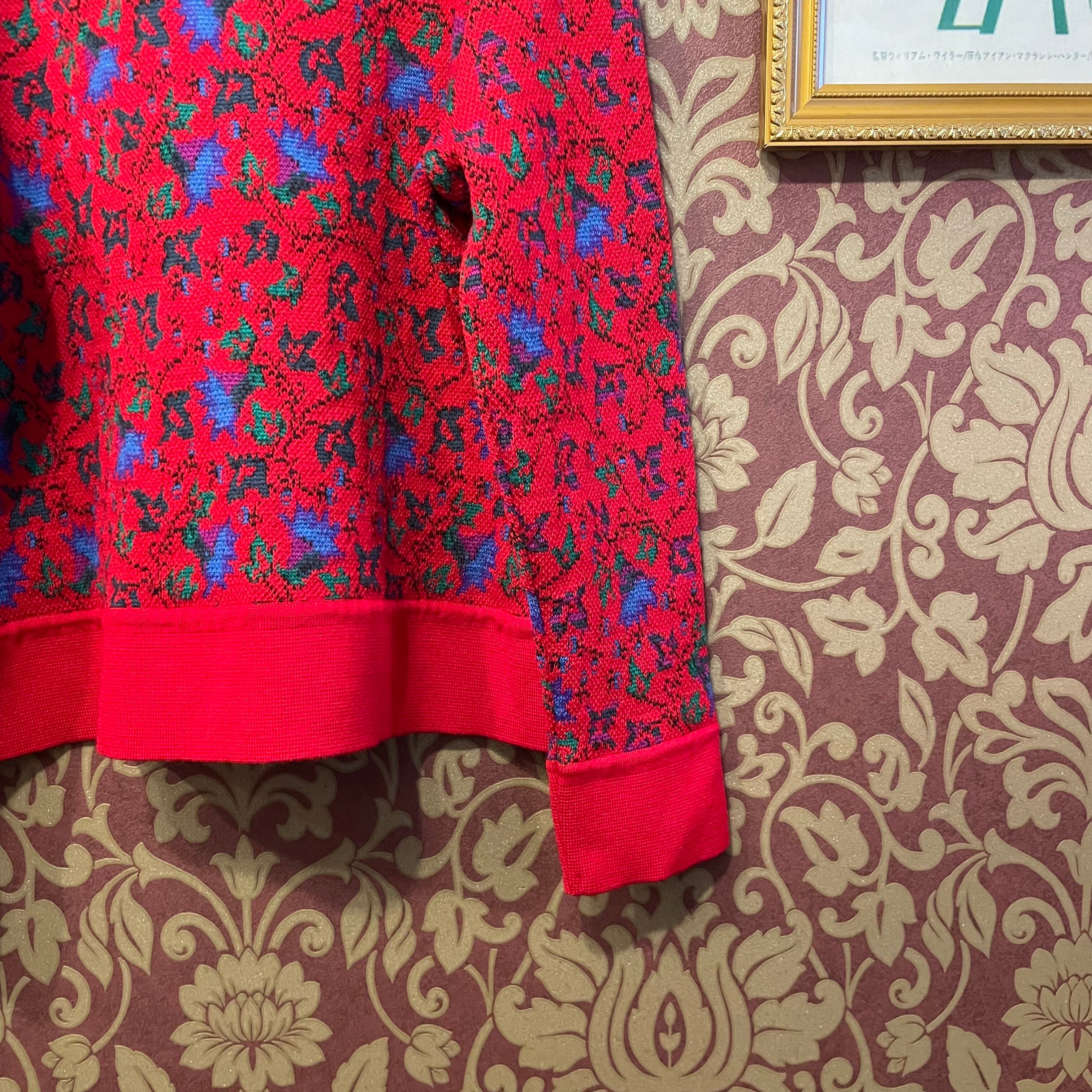 赤をベースに青や紫、緑の柄が編み込まれています。