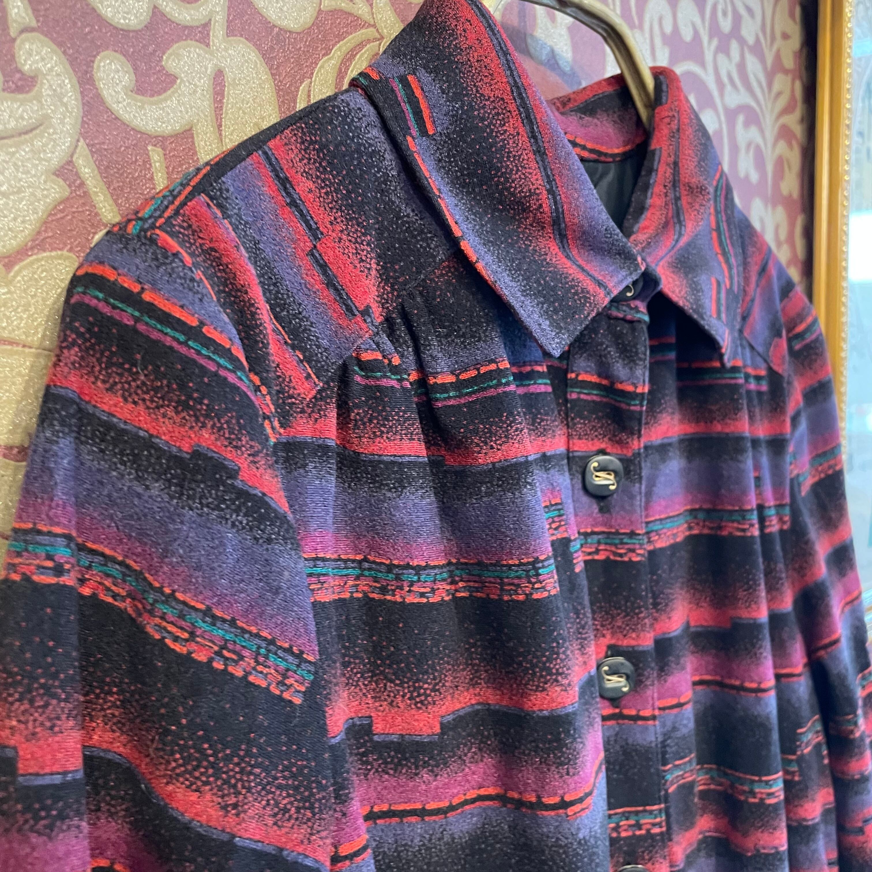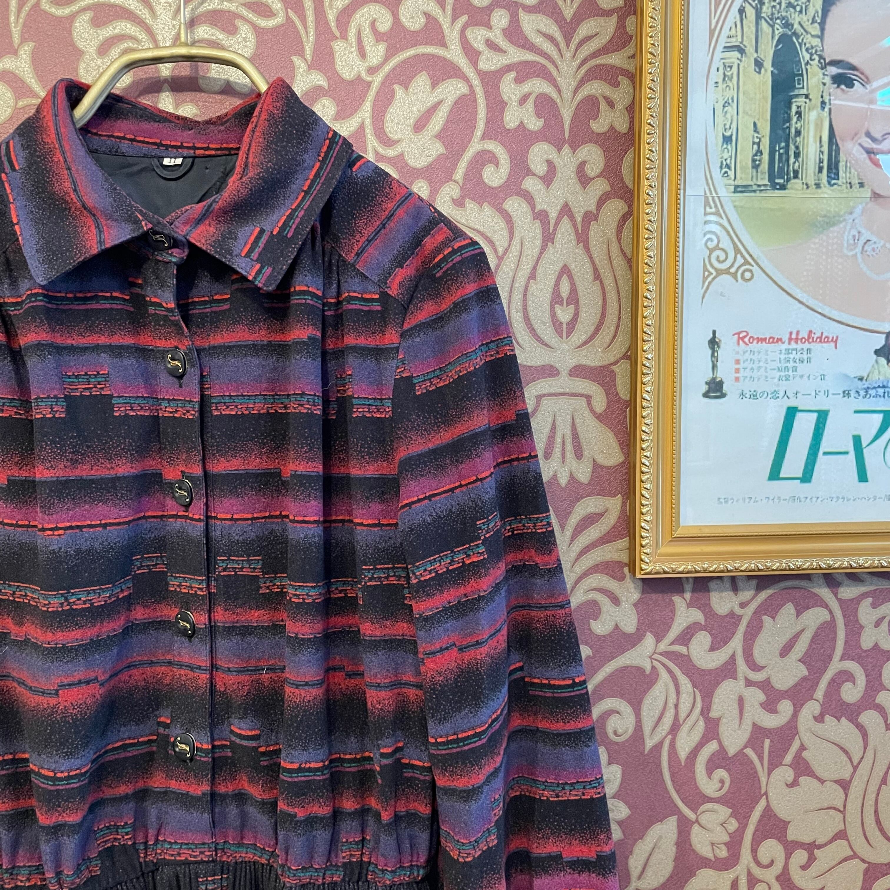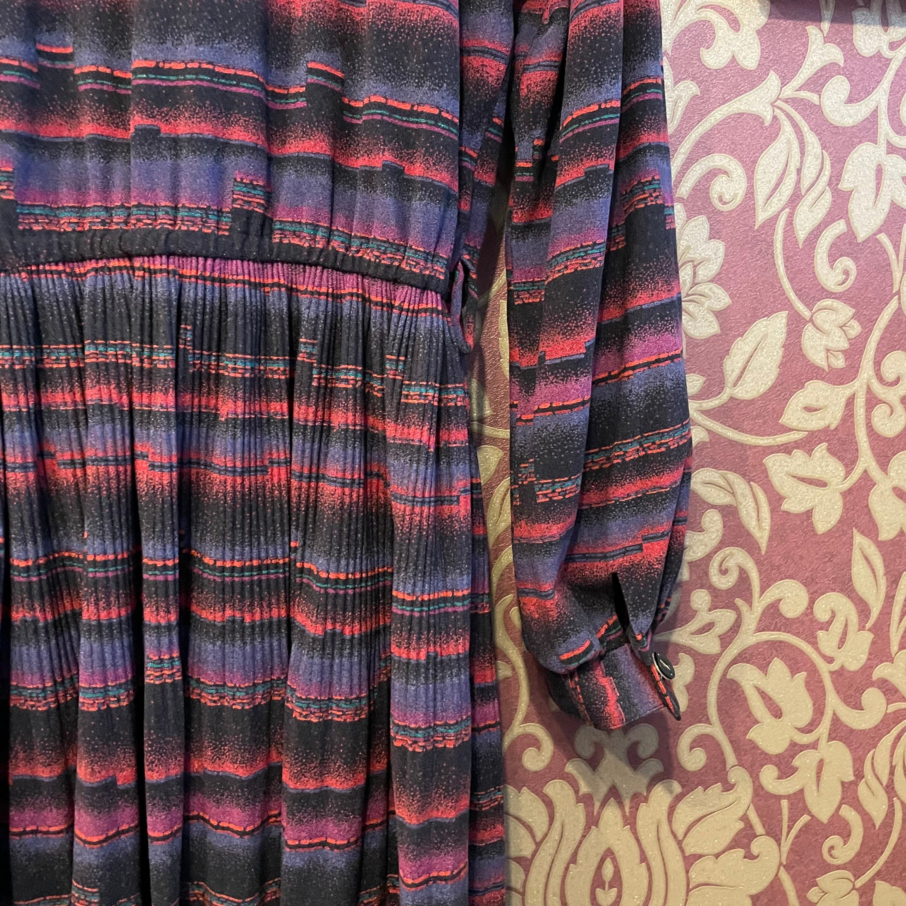 黒をベースに紫と赤紫、緑で構成されたレトロなボーダー柄のようなワンピースです。