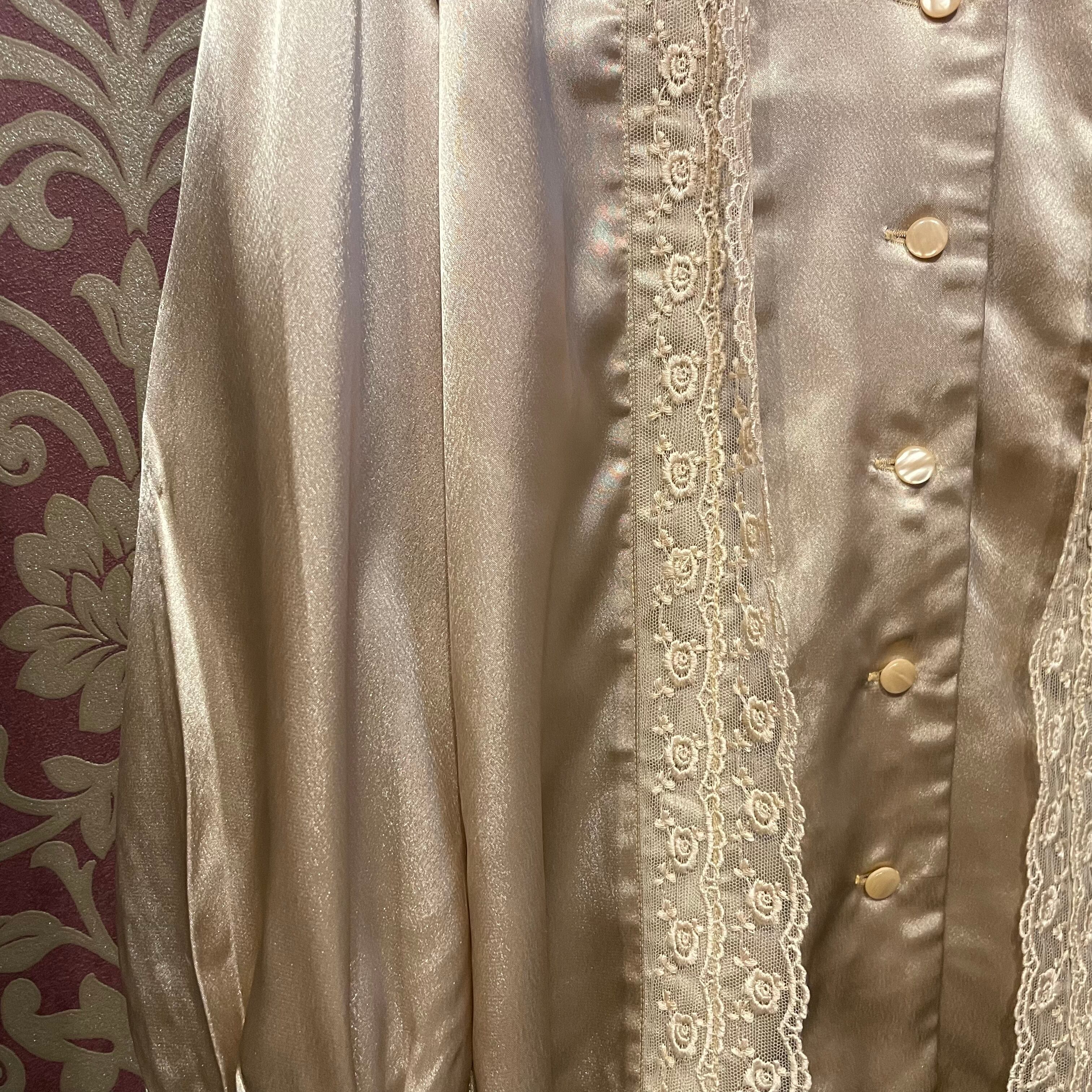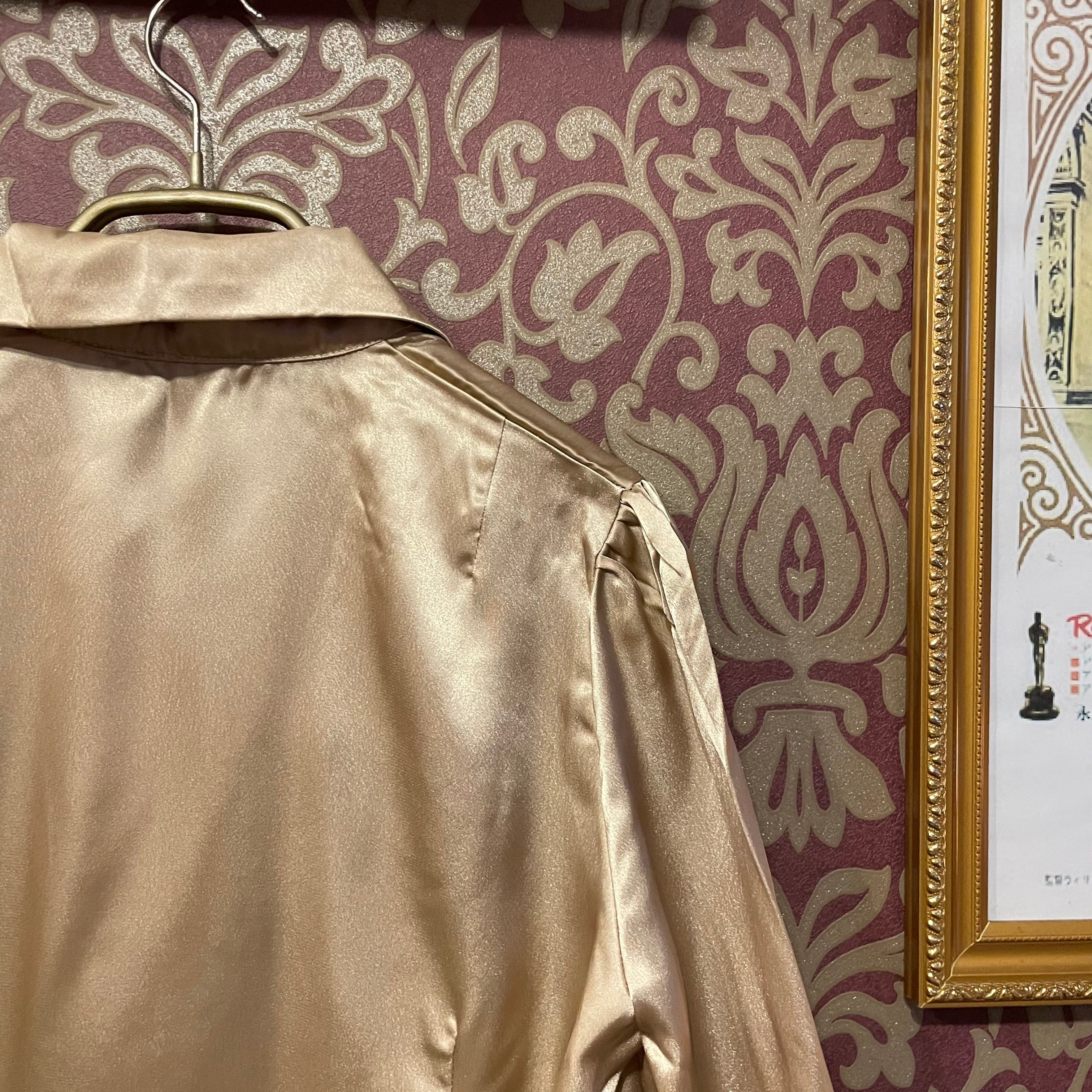 シャンパンゴールドが眩しいポリエステルサテンのブラウスです。