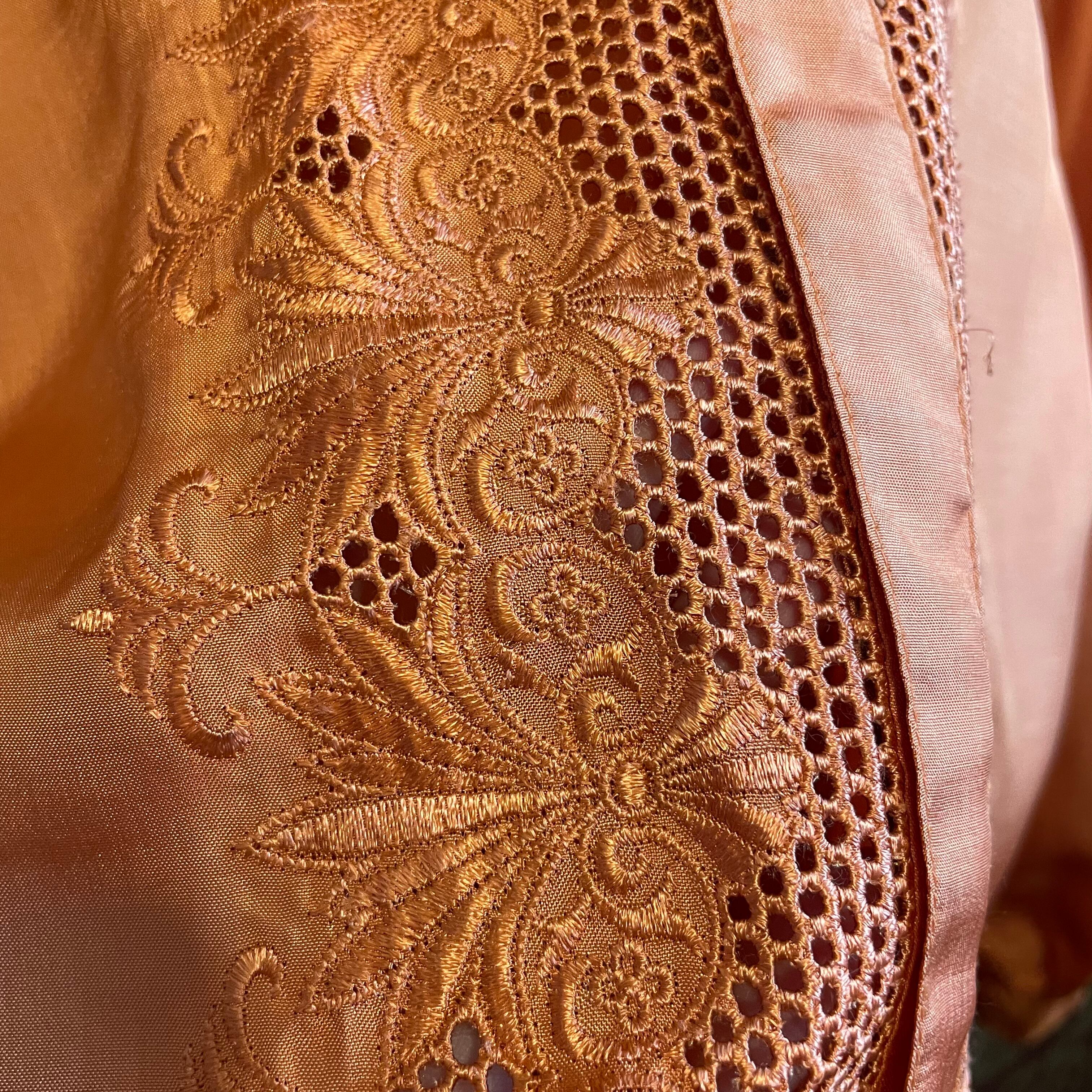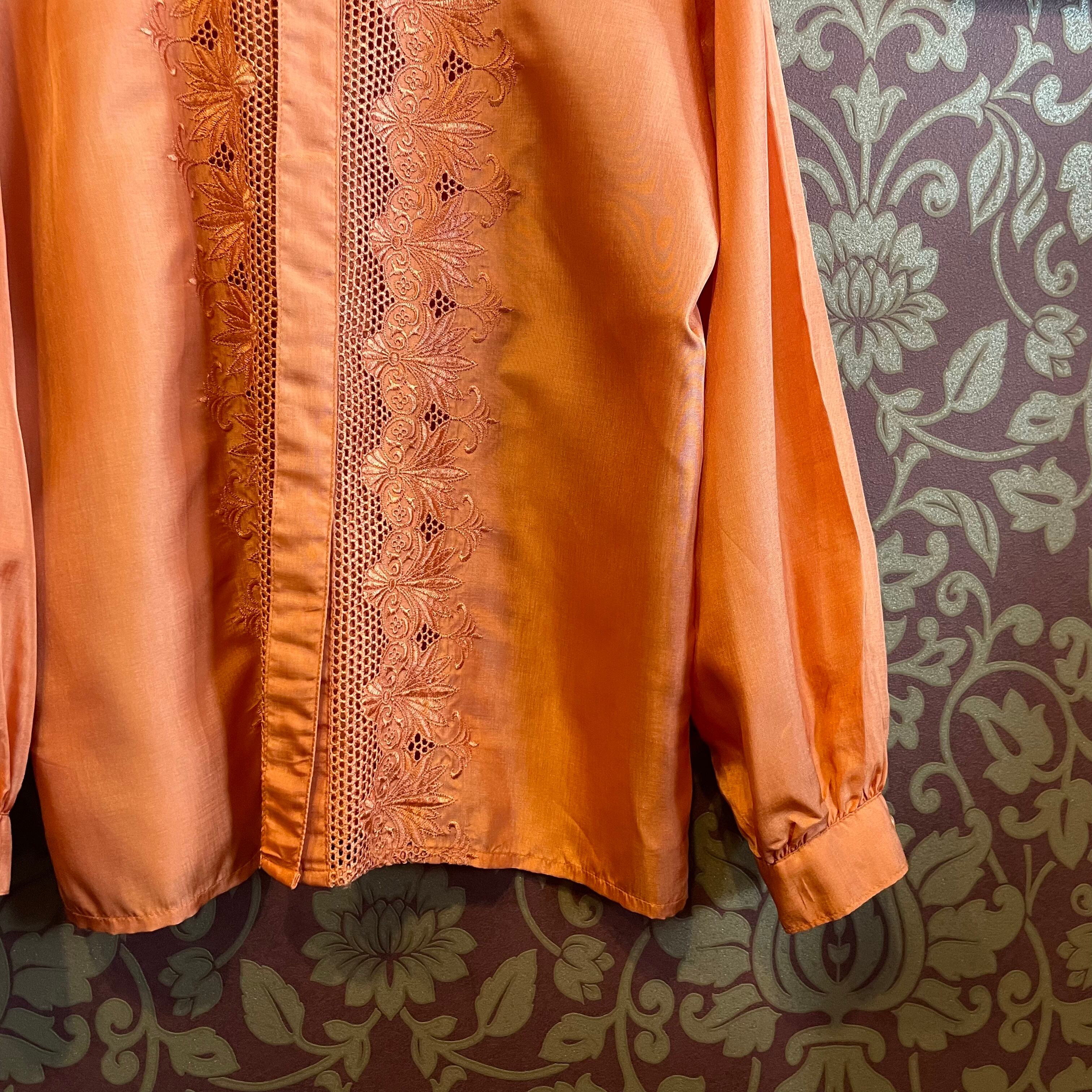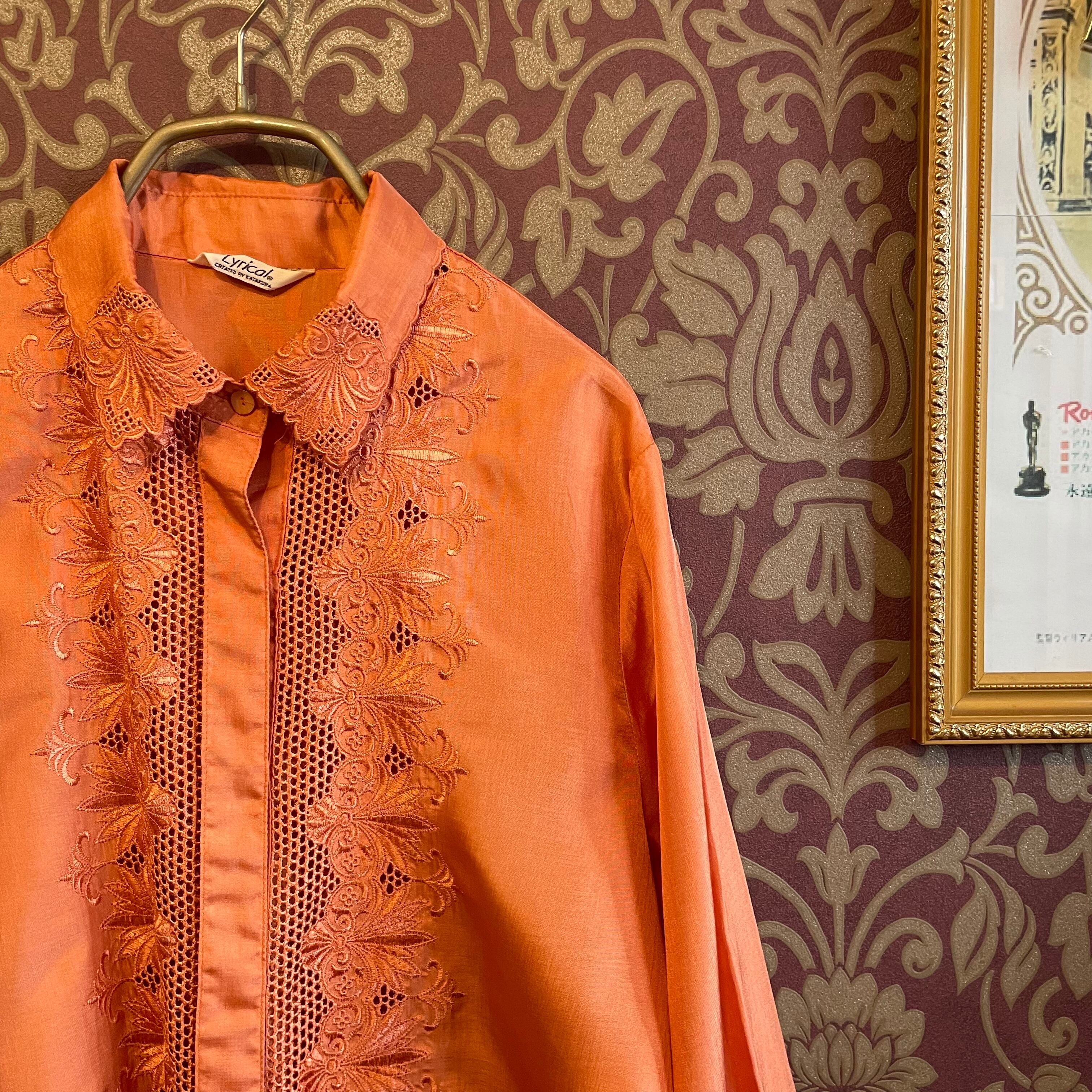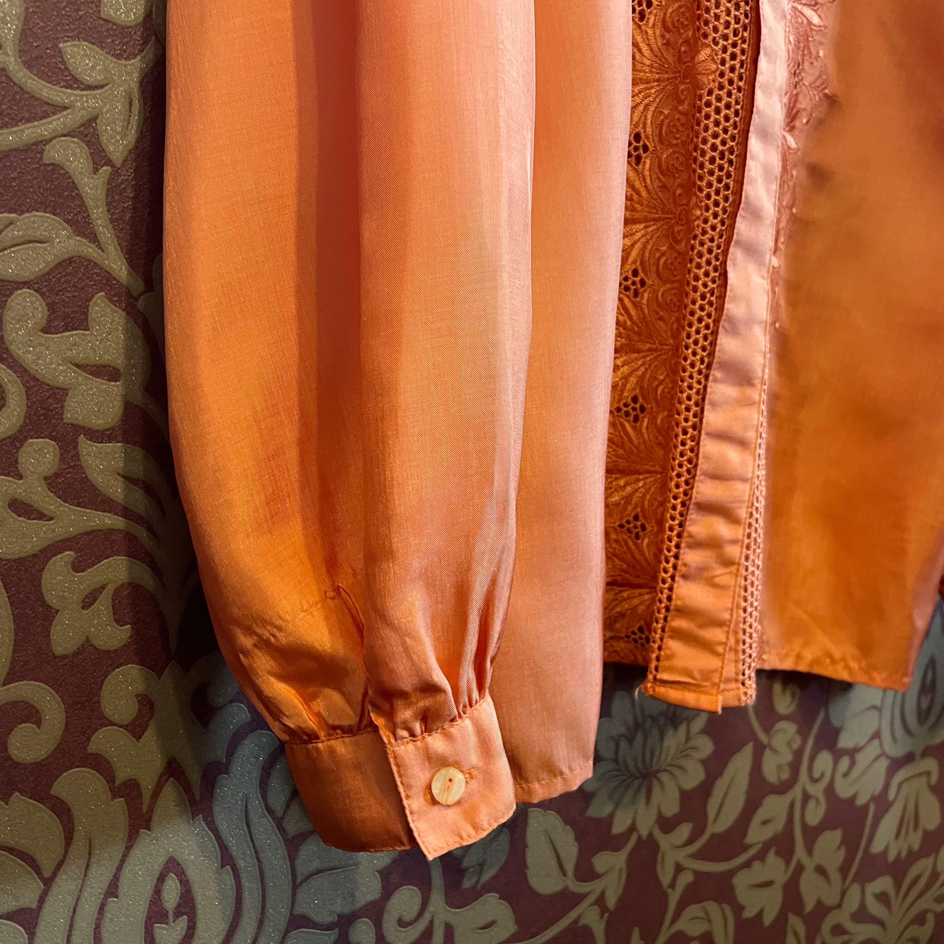レースのような繊細な刺繍が美しいサーモンピンクのブラウスです。