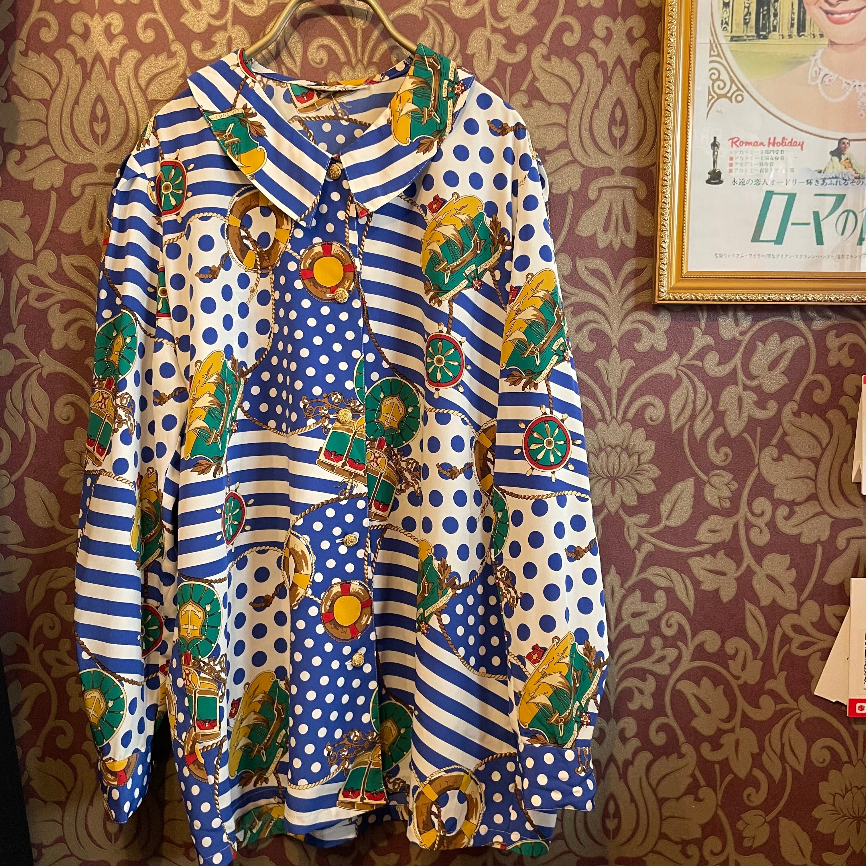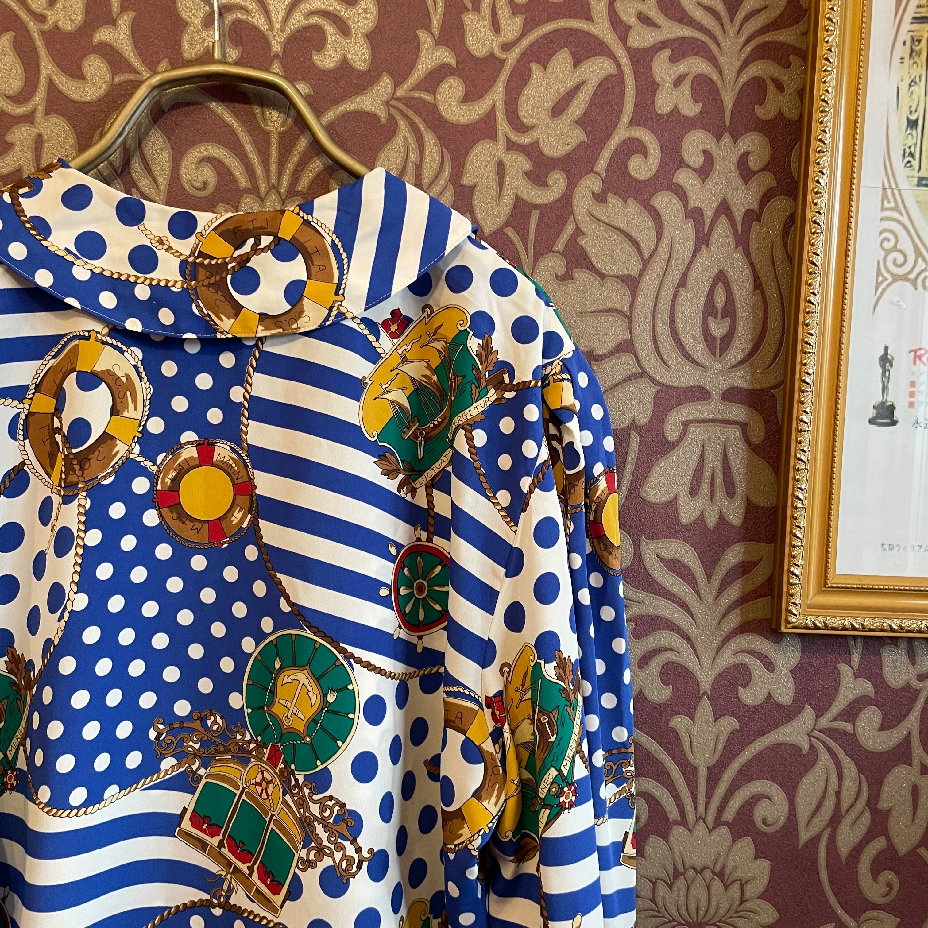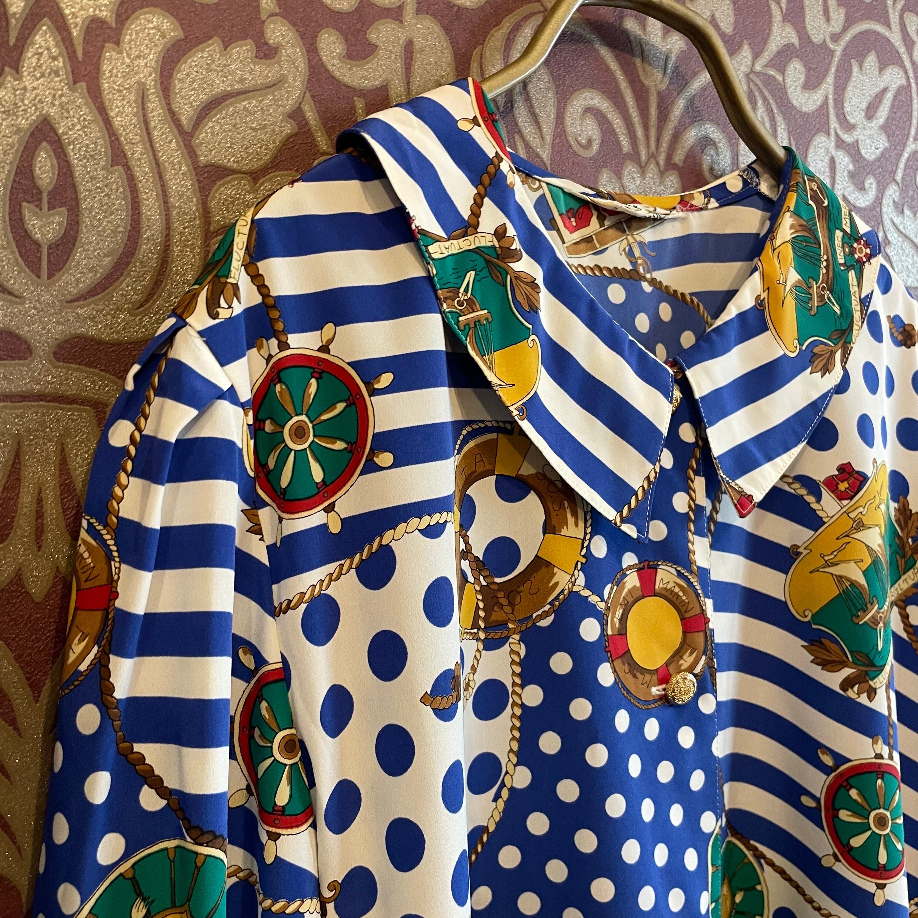 青と白のドット柄やストライプ柄がランダムに配置されて、舵や浮き輪、船のイラストがロープで繋がれています。