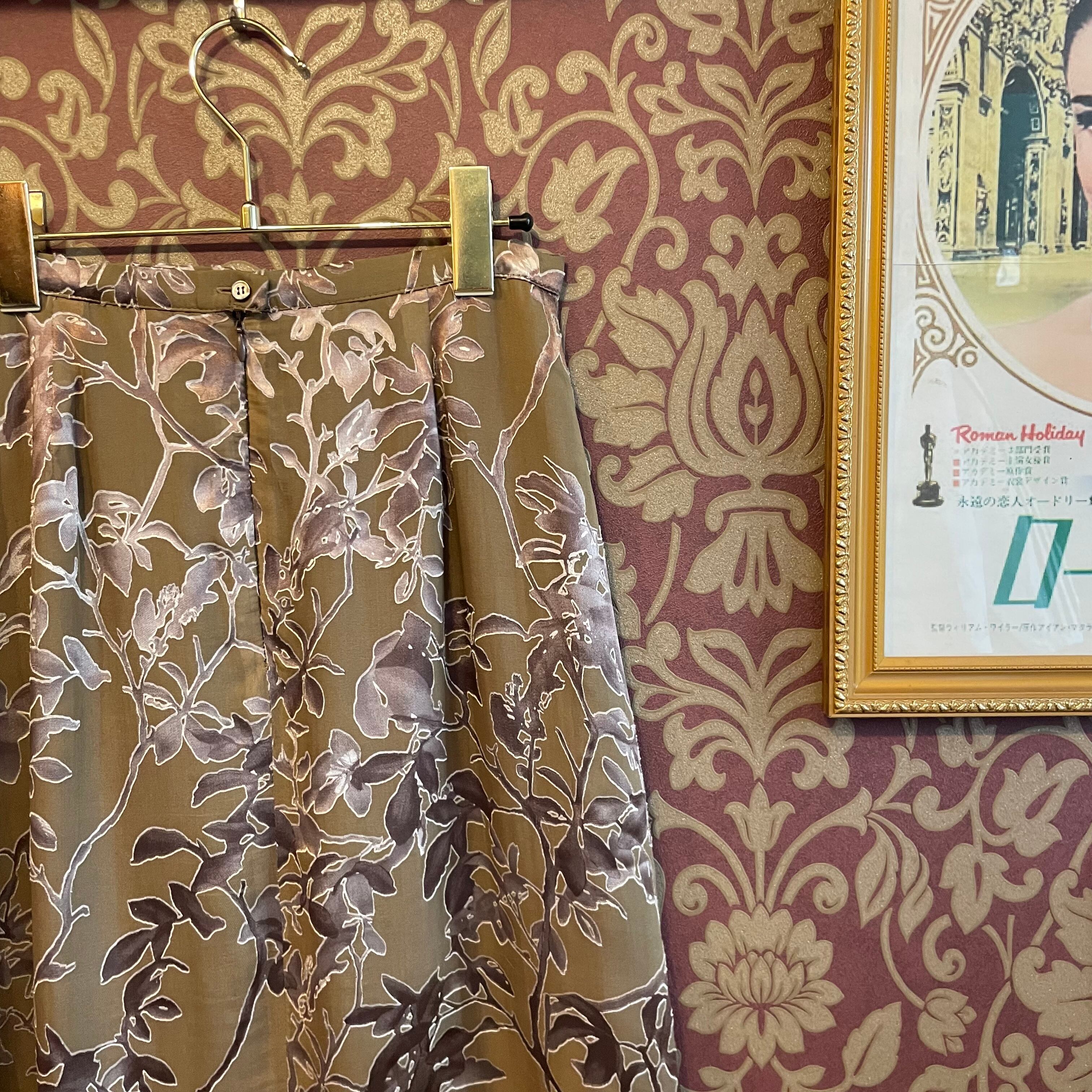 深みのあるオリーブグリーンにシルク混ならではの艶のある枝と葉っぱ柄が印象的な生地で作られています。