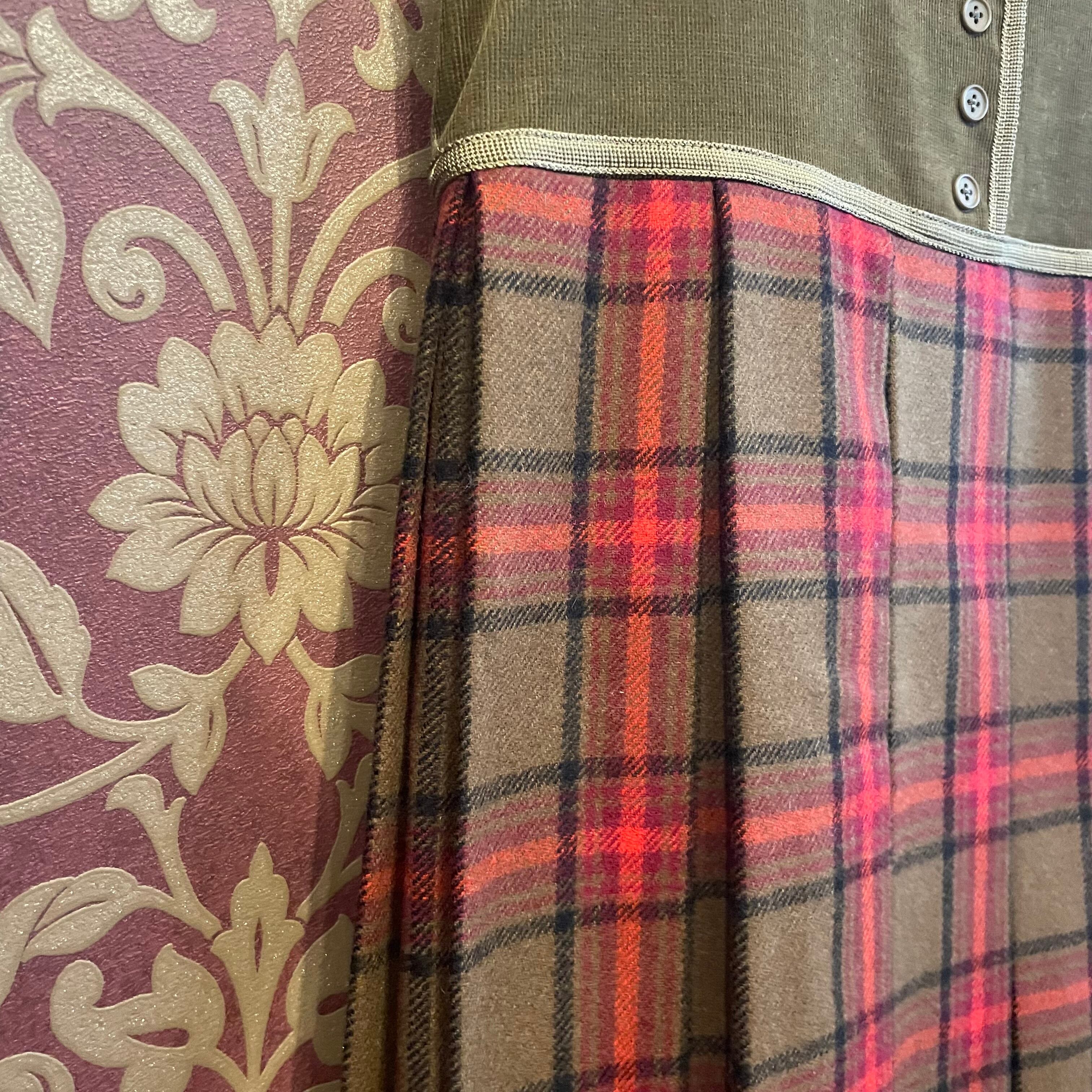 ワンピースは上身頃がコーデュロイ、スカート部分はチェック柄です。