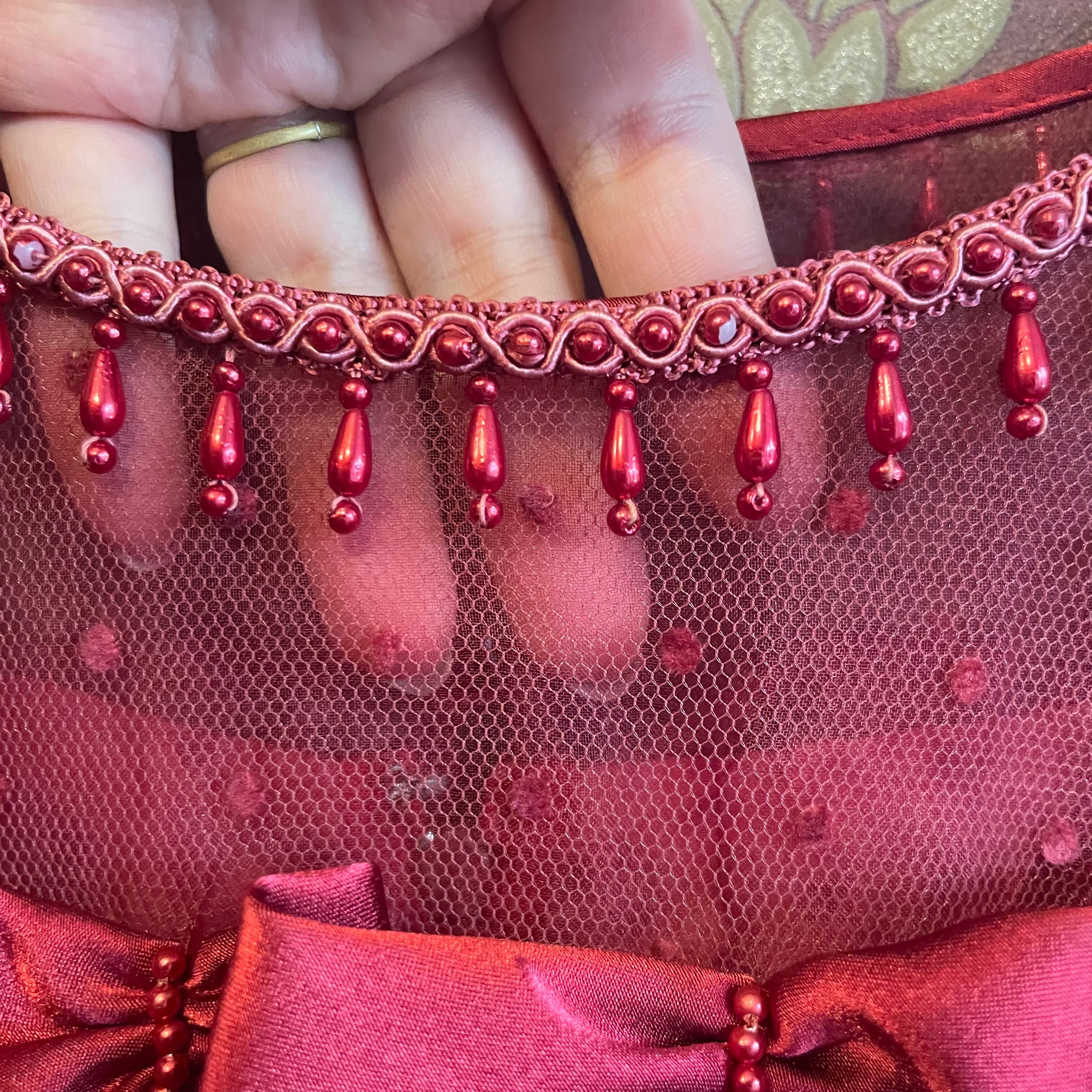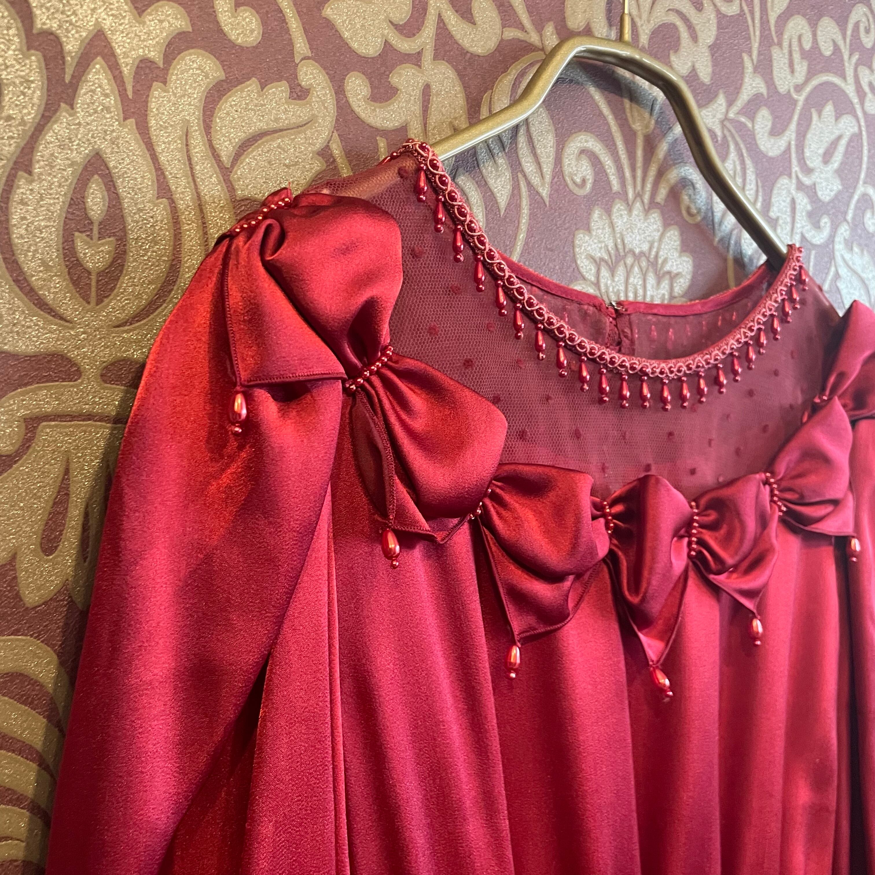 デコルテ周りはドット柄のチュールレースで作られていてたくさんのリボンとビーズで装飾されています。