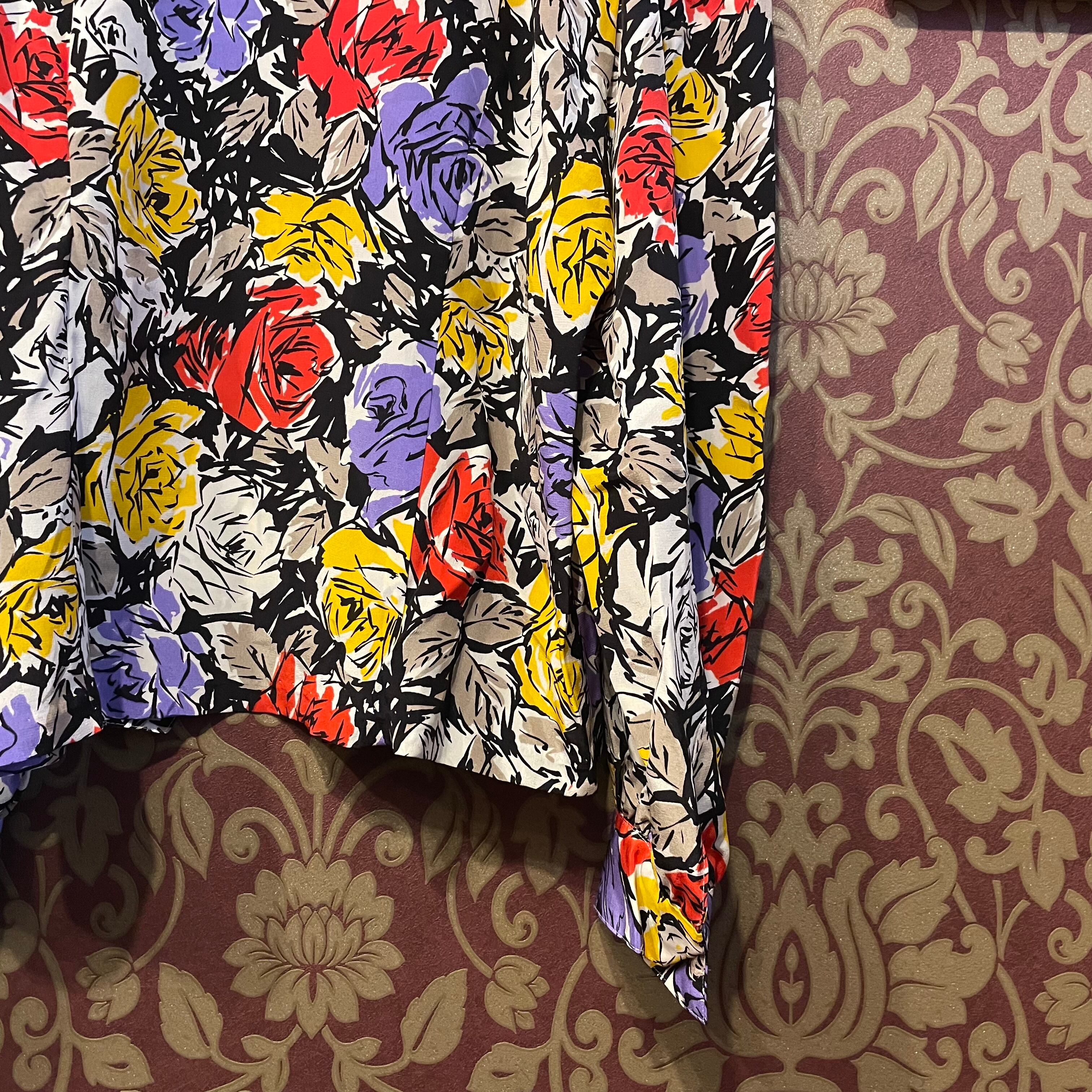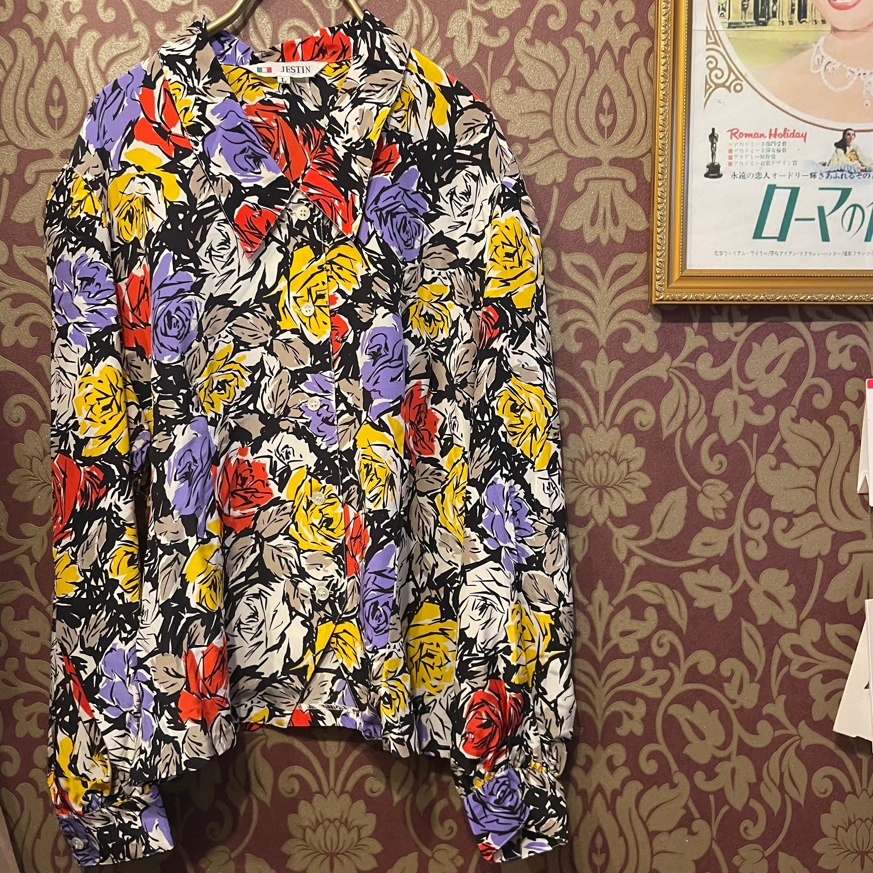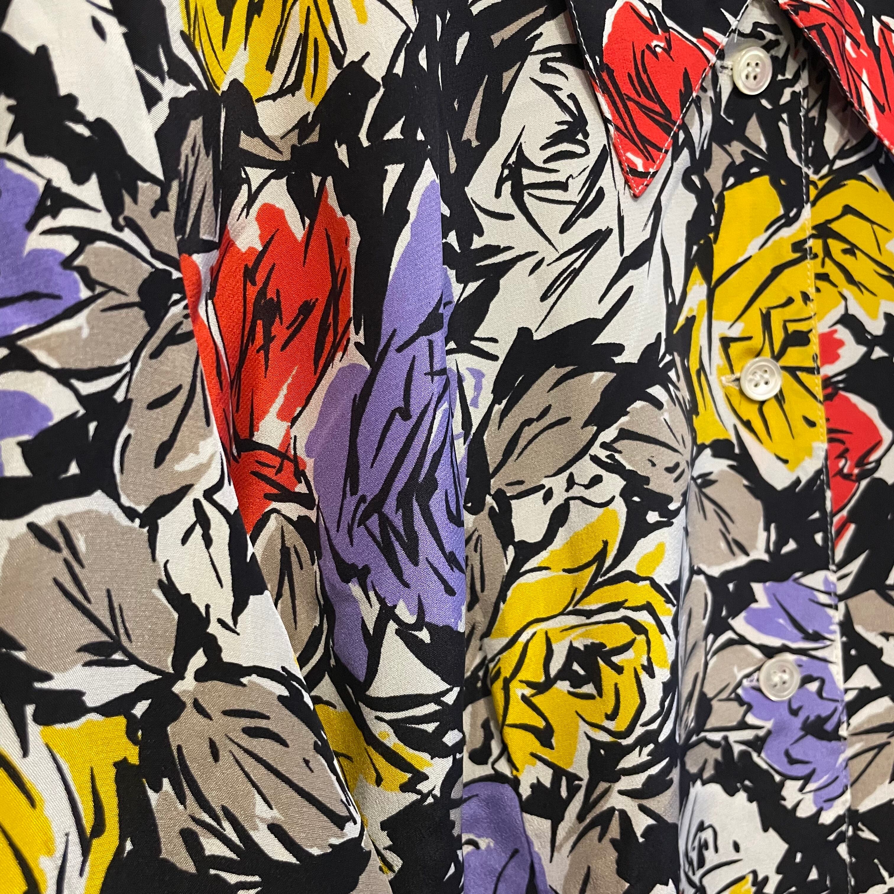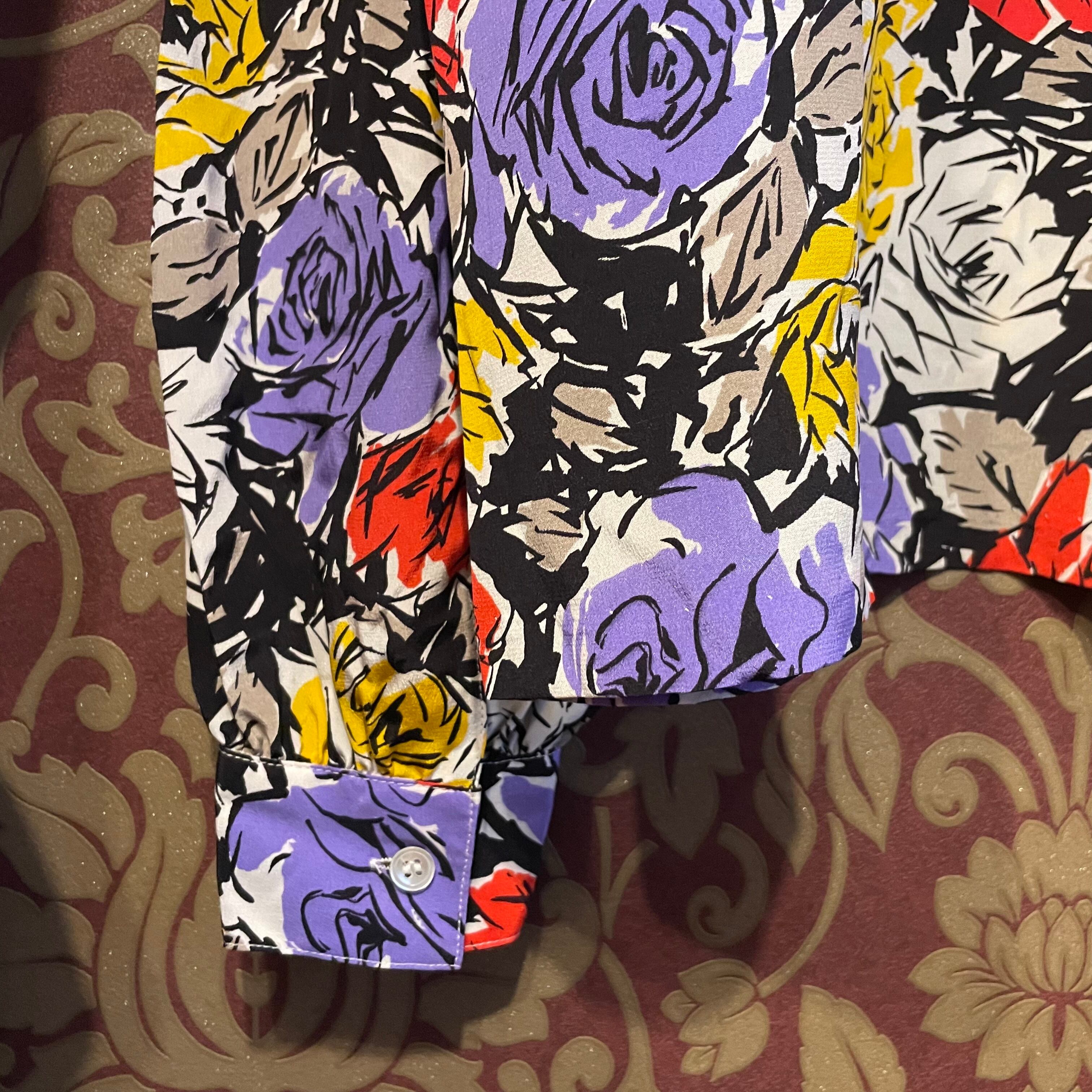 白地にペン画のような黒の鋭い線に紫と赤と黄色のバラ柄のブラウスです。