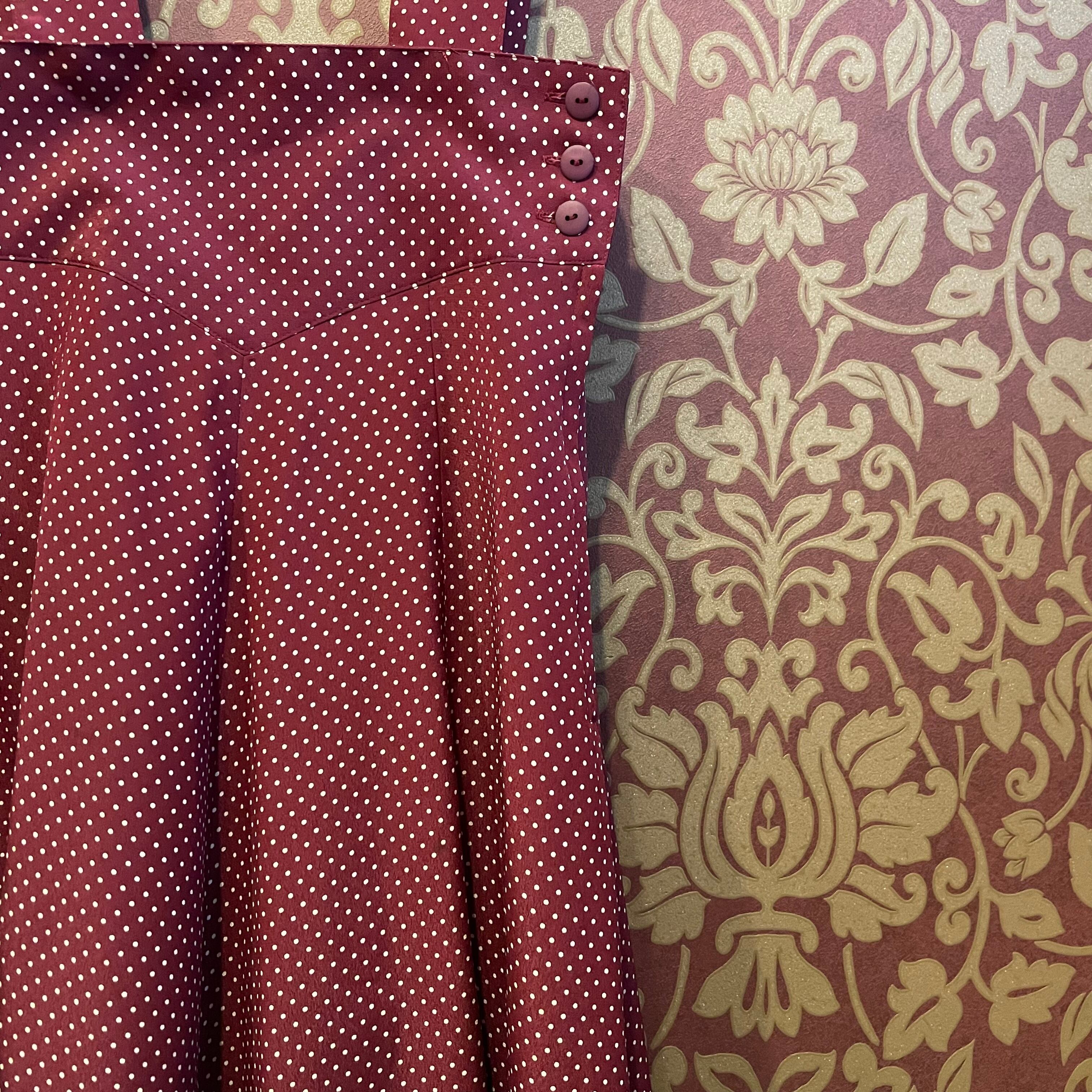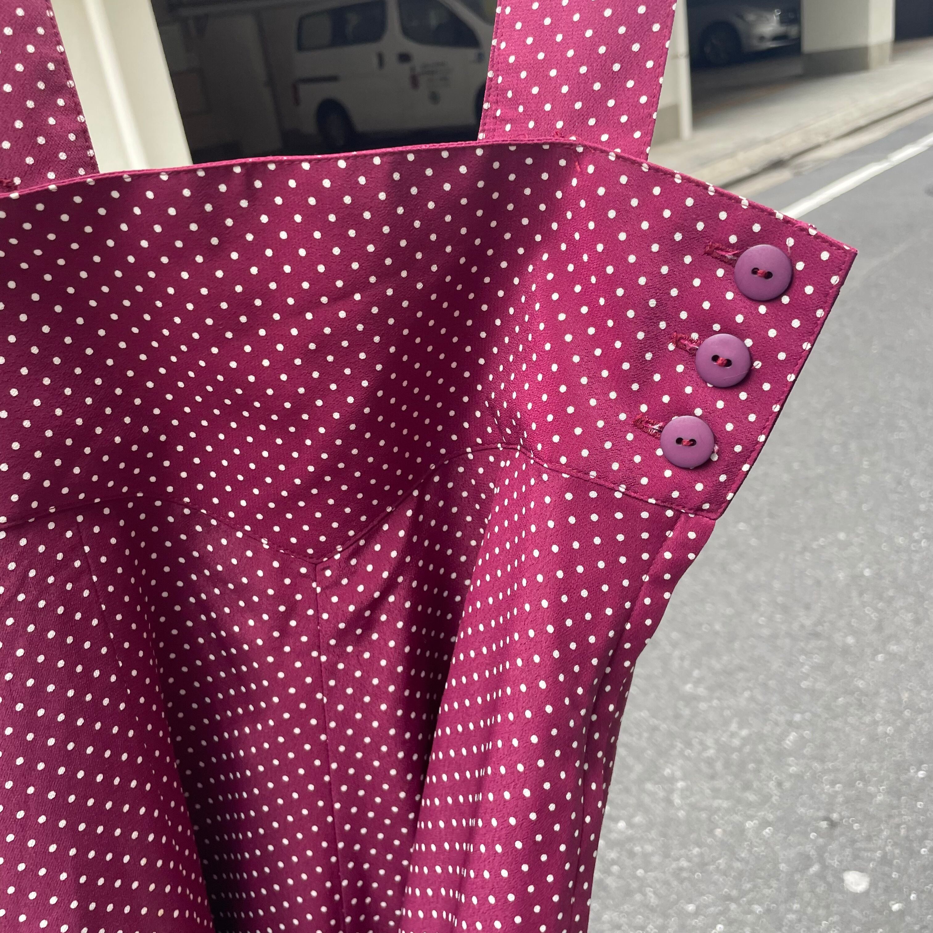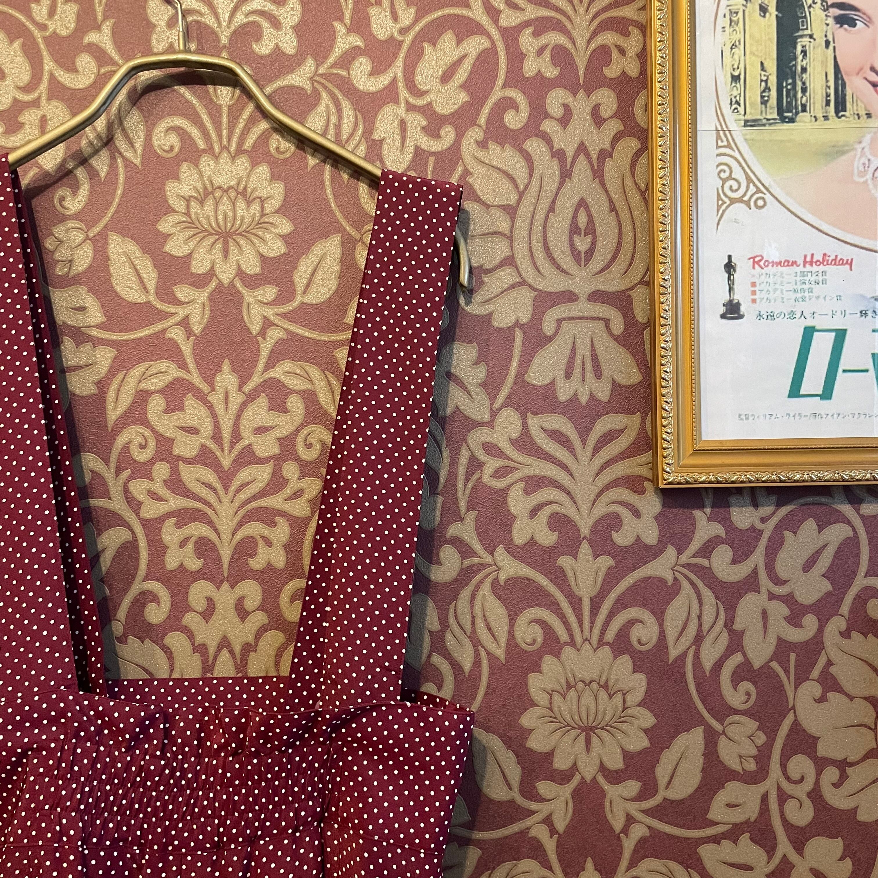 赤紫のような小豆色のポルカドット柄サスペンダースカートです。