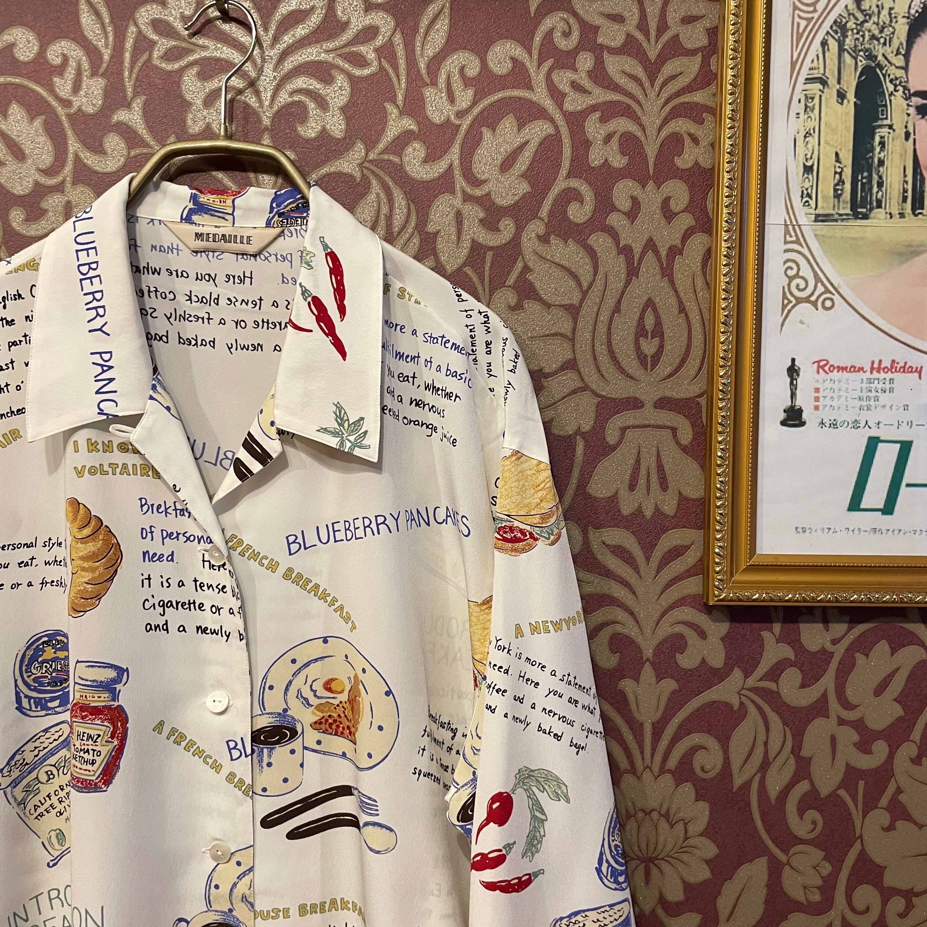 クロワッサンや目玉焼き、サンドイッチ、コーヒー、りんごなど朝食メニュー柄のシャツです。