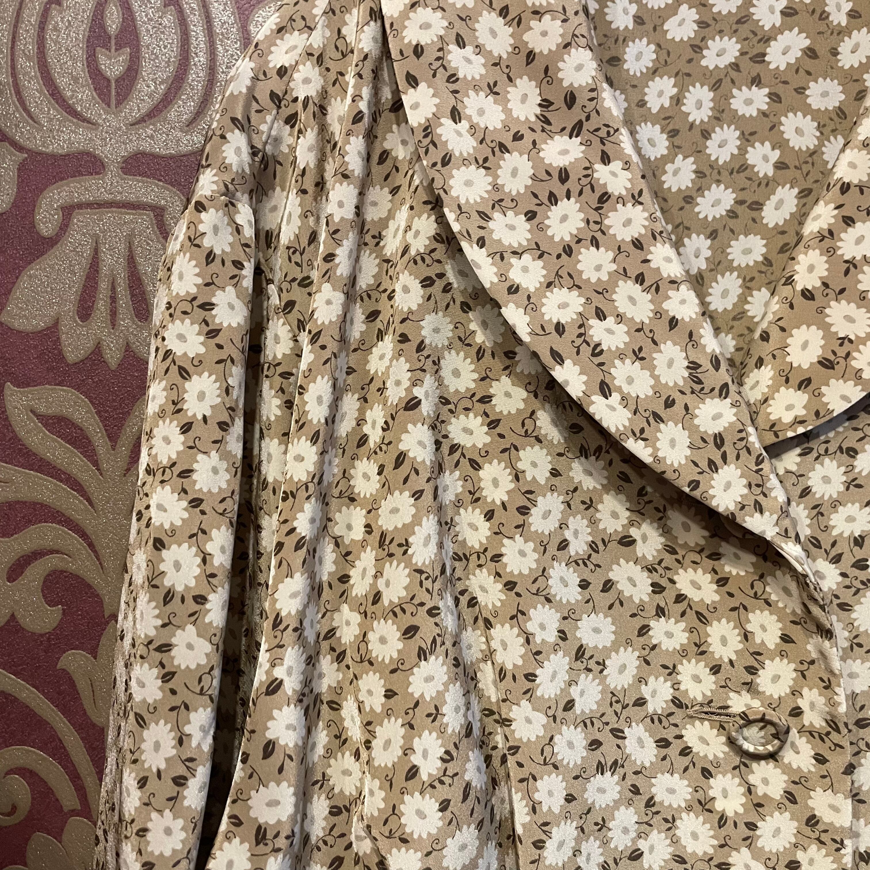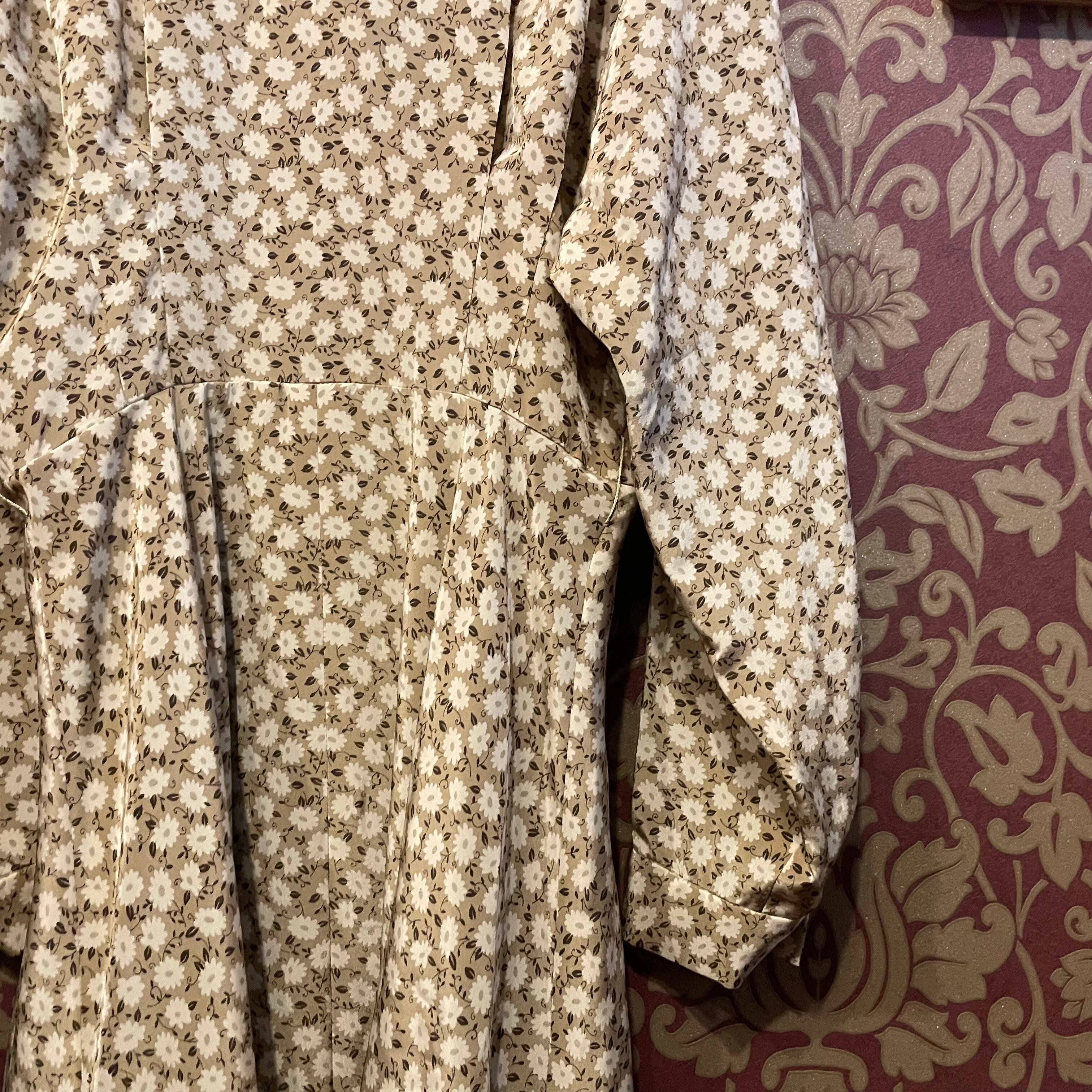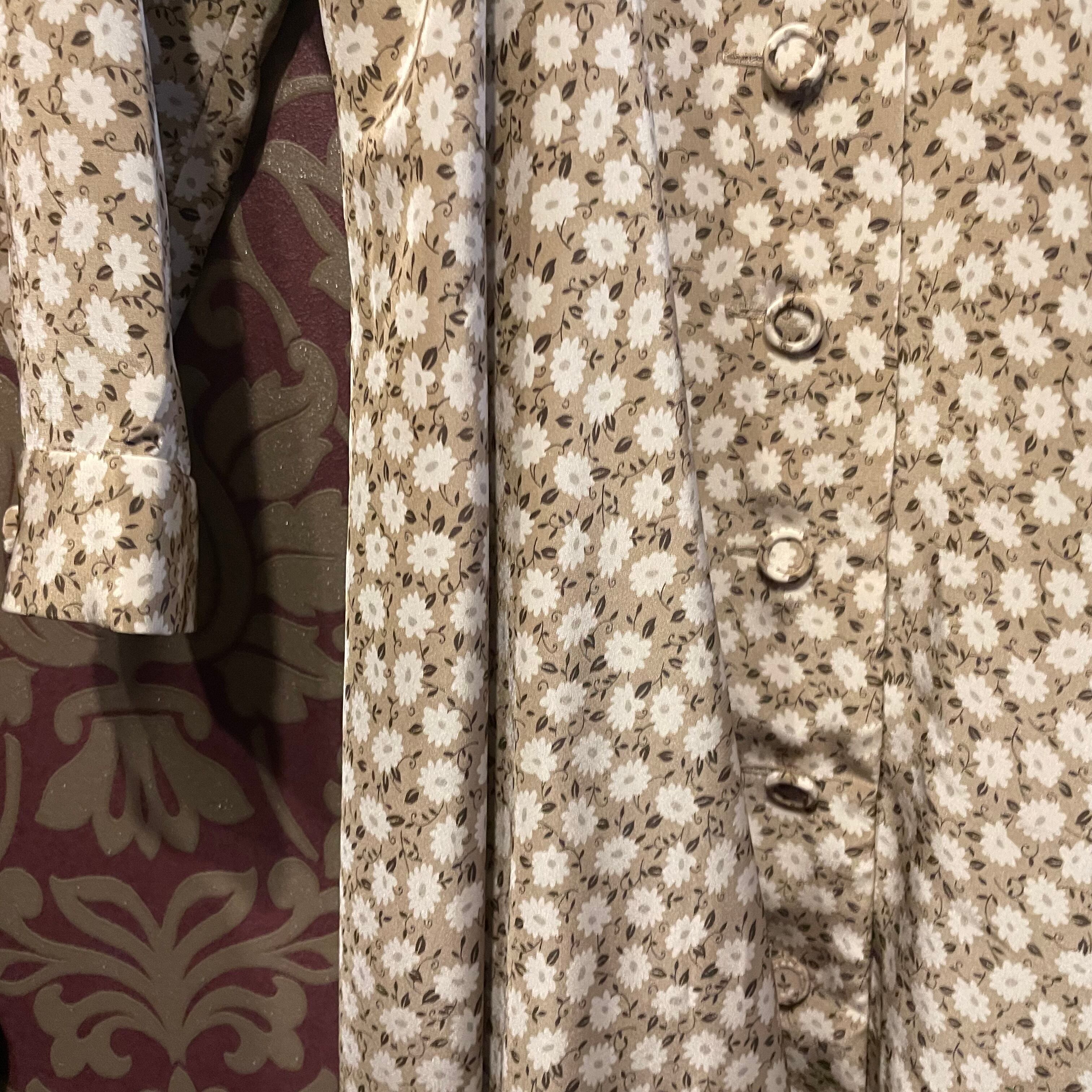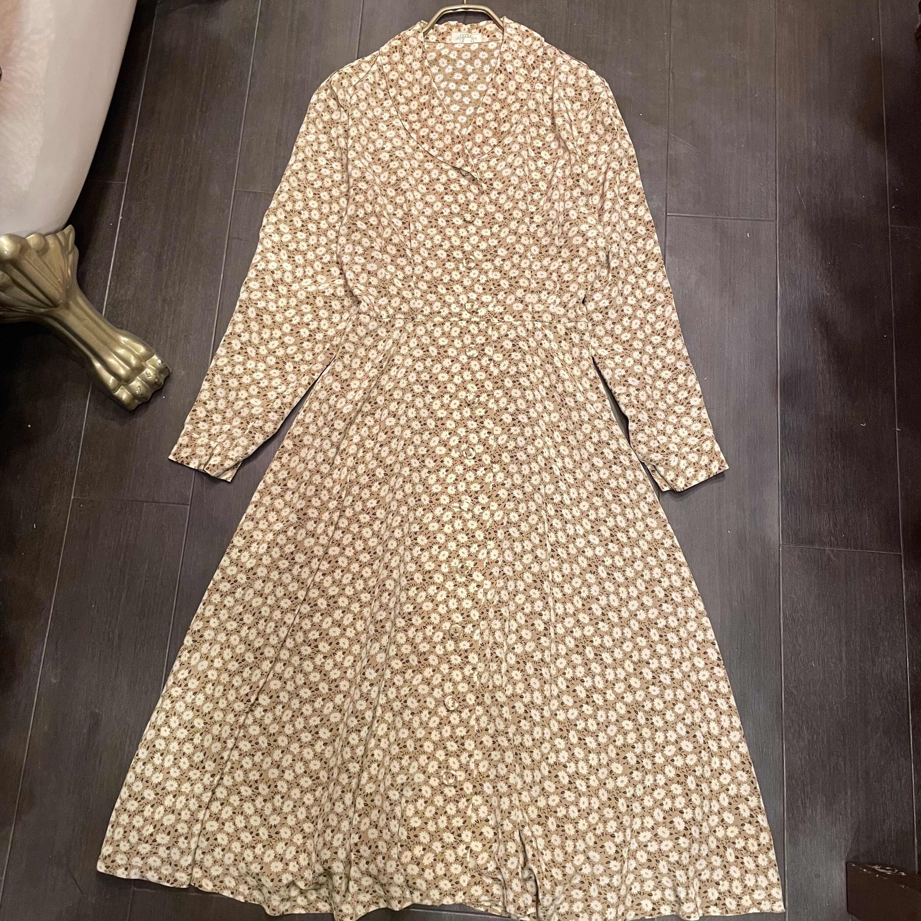 暗めのベージュ地にクリーム色の花柄のワンピースです。