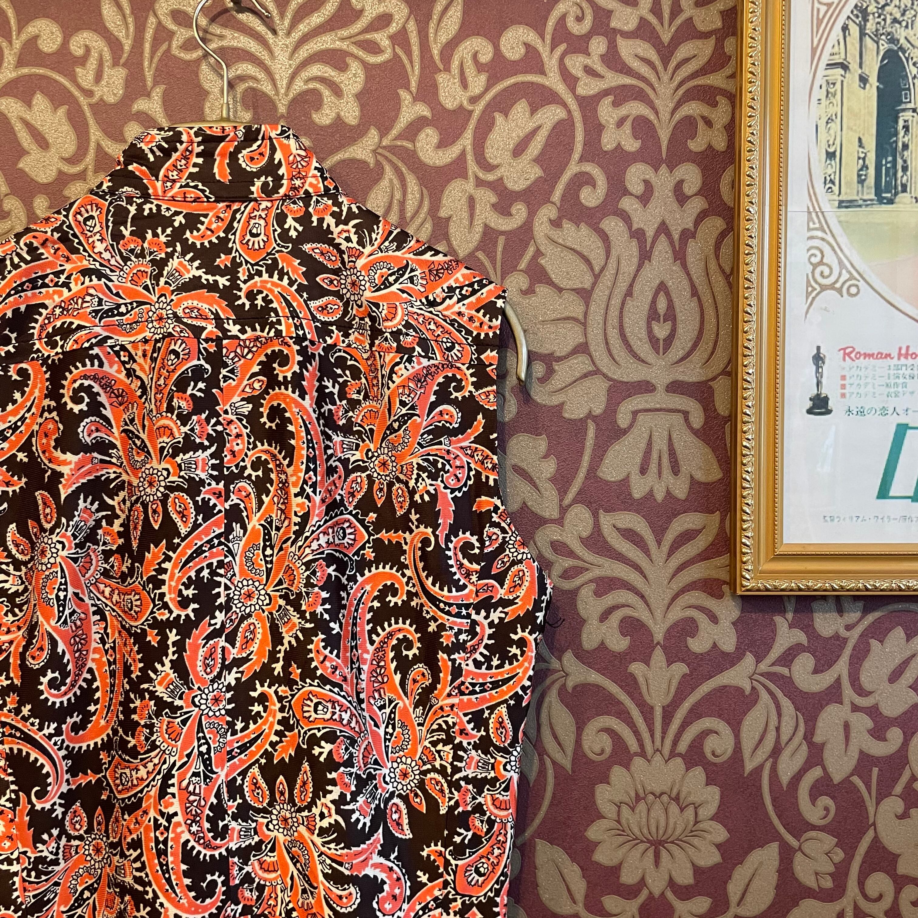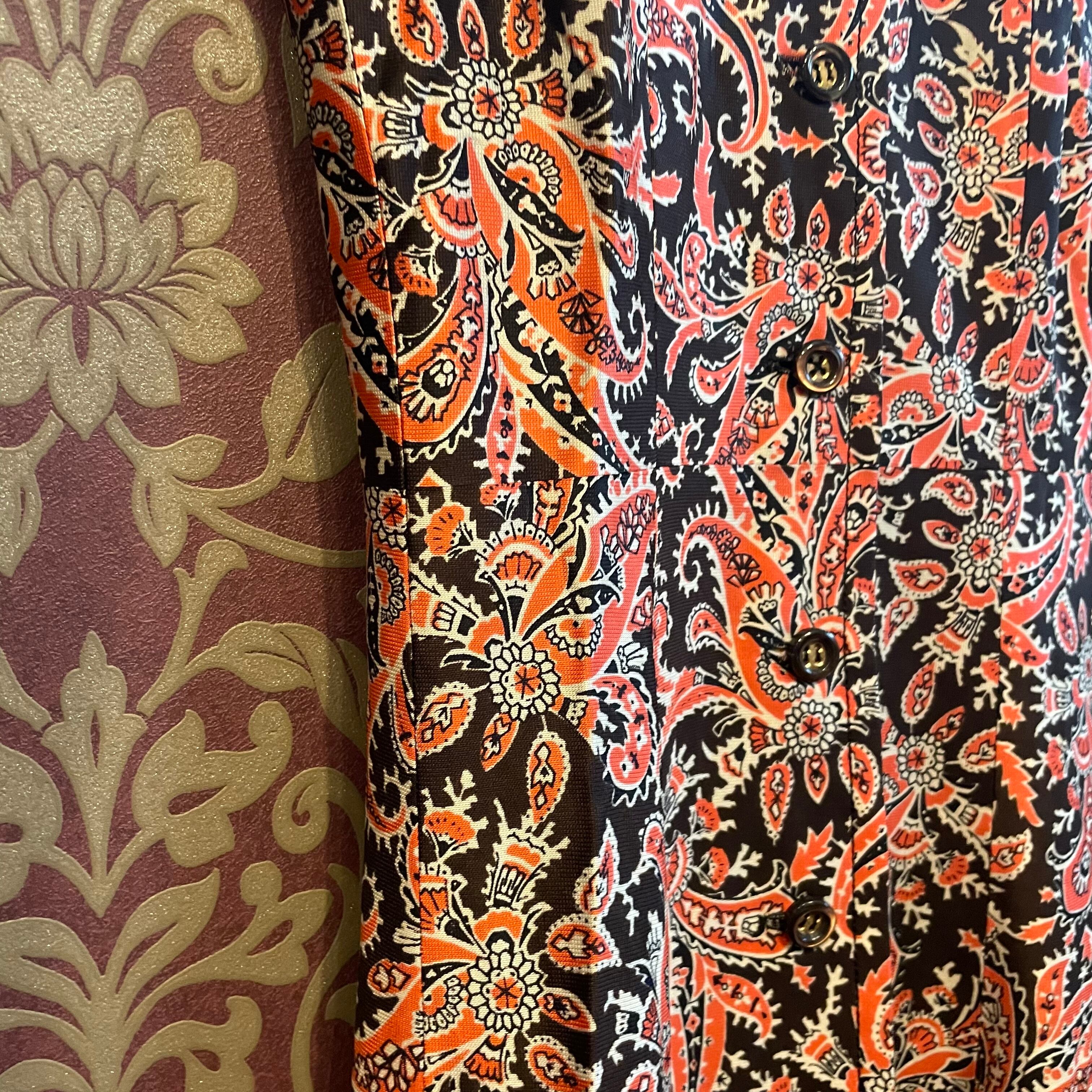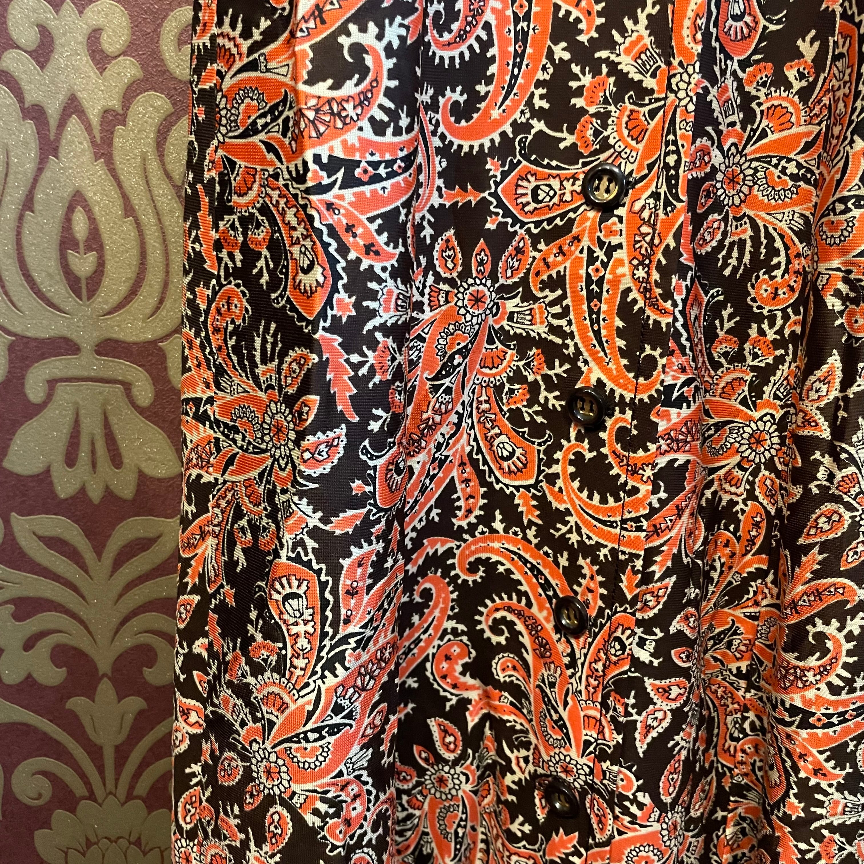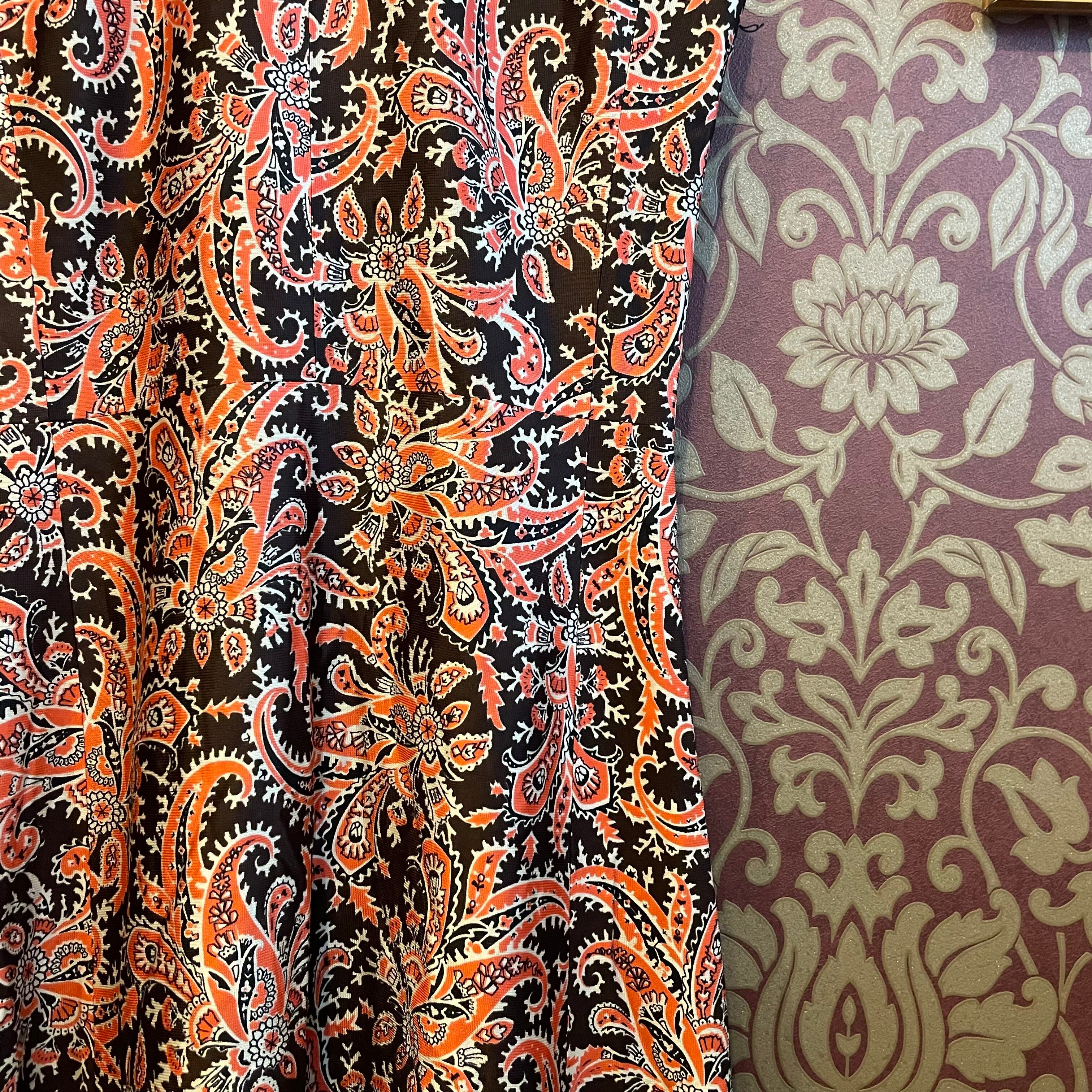 茶色地にオレンジのペイズリー柄ワンピースです。