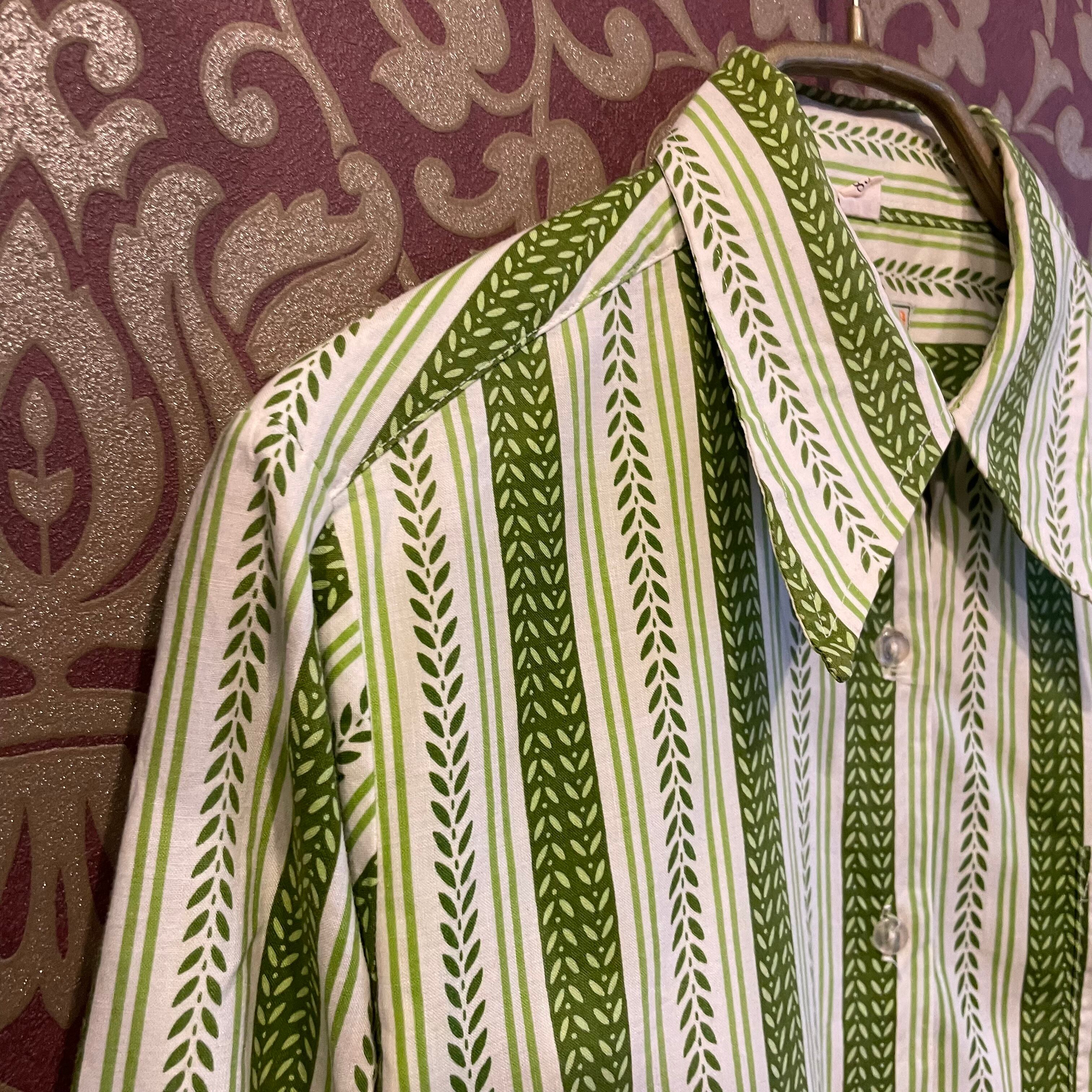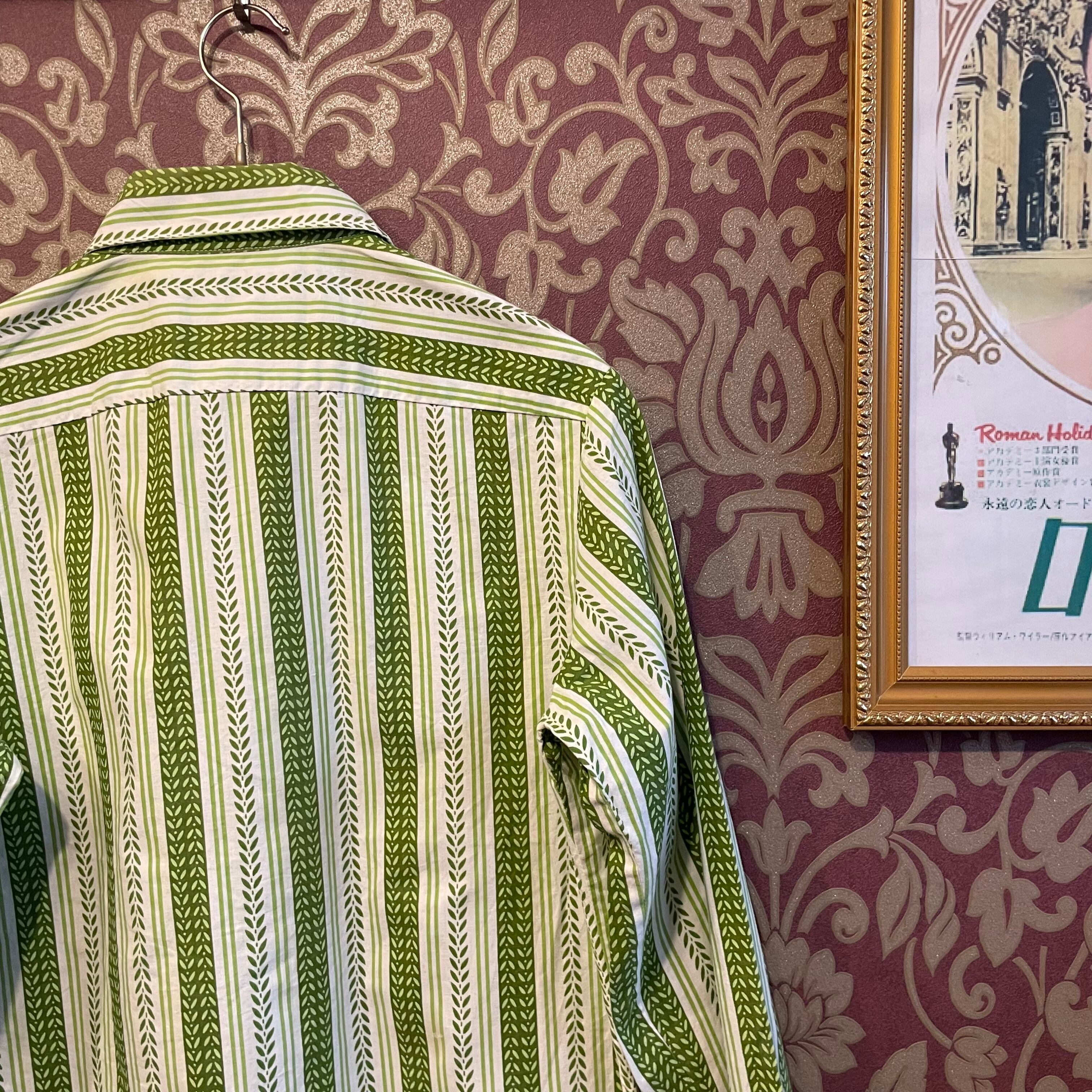 70年代風の尖った襟が個性的なマルチストライプ柄シャツです。