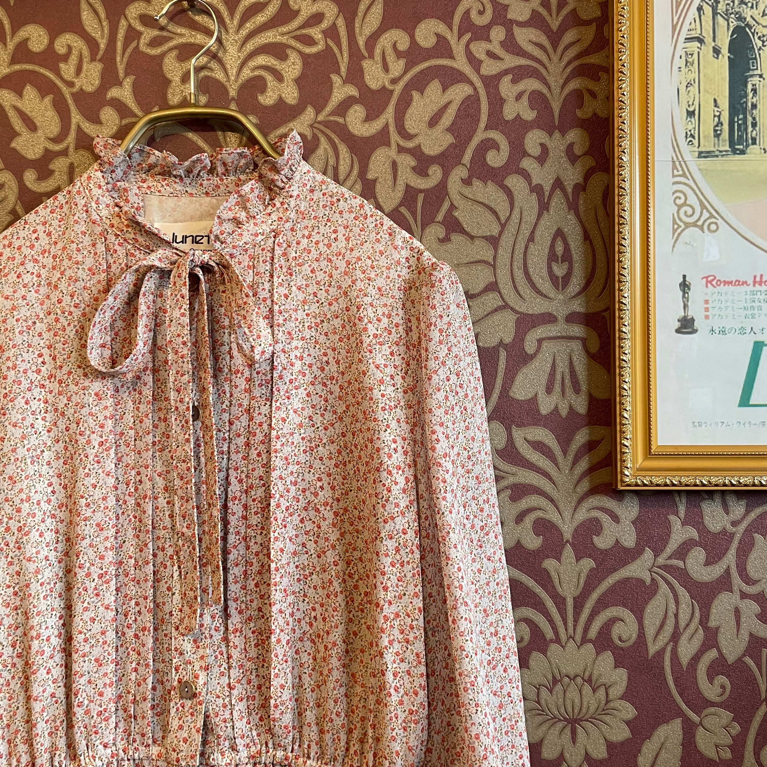 襟はフリルでボウタイが付いていて、ウエストにはペプラムが付いているのでウエストがキュッとした女性らしい柔らかいシルエットになります。