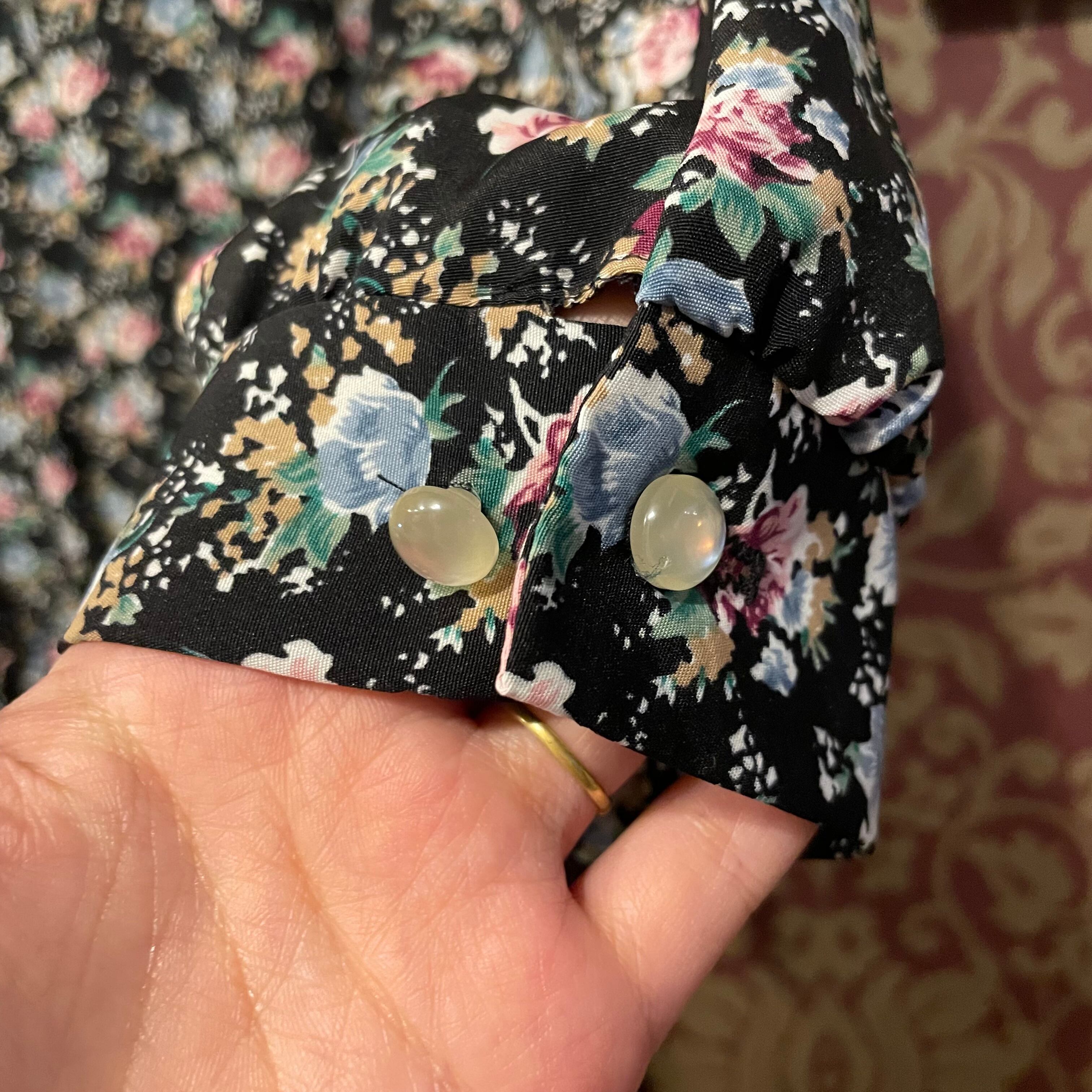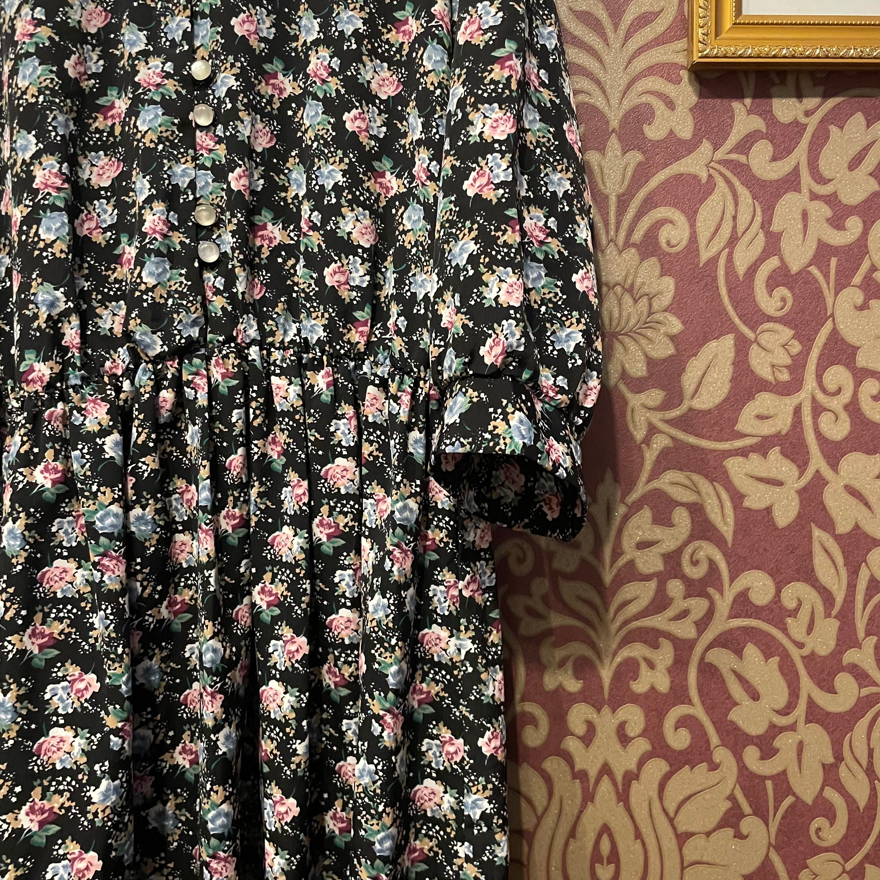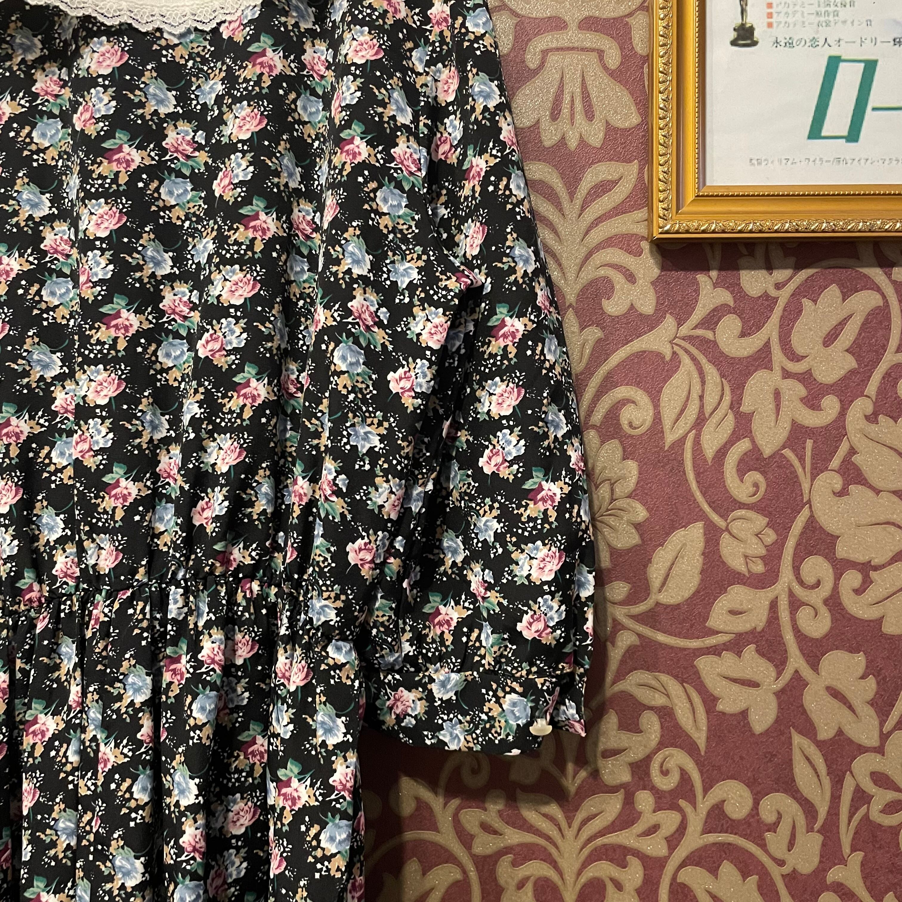 ワンピース本体は紺地にピンクと青のバラ柄で袖は7分丈です。