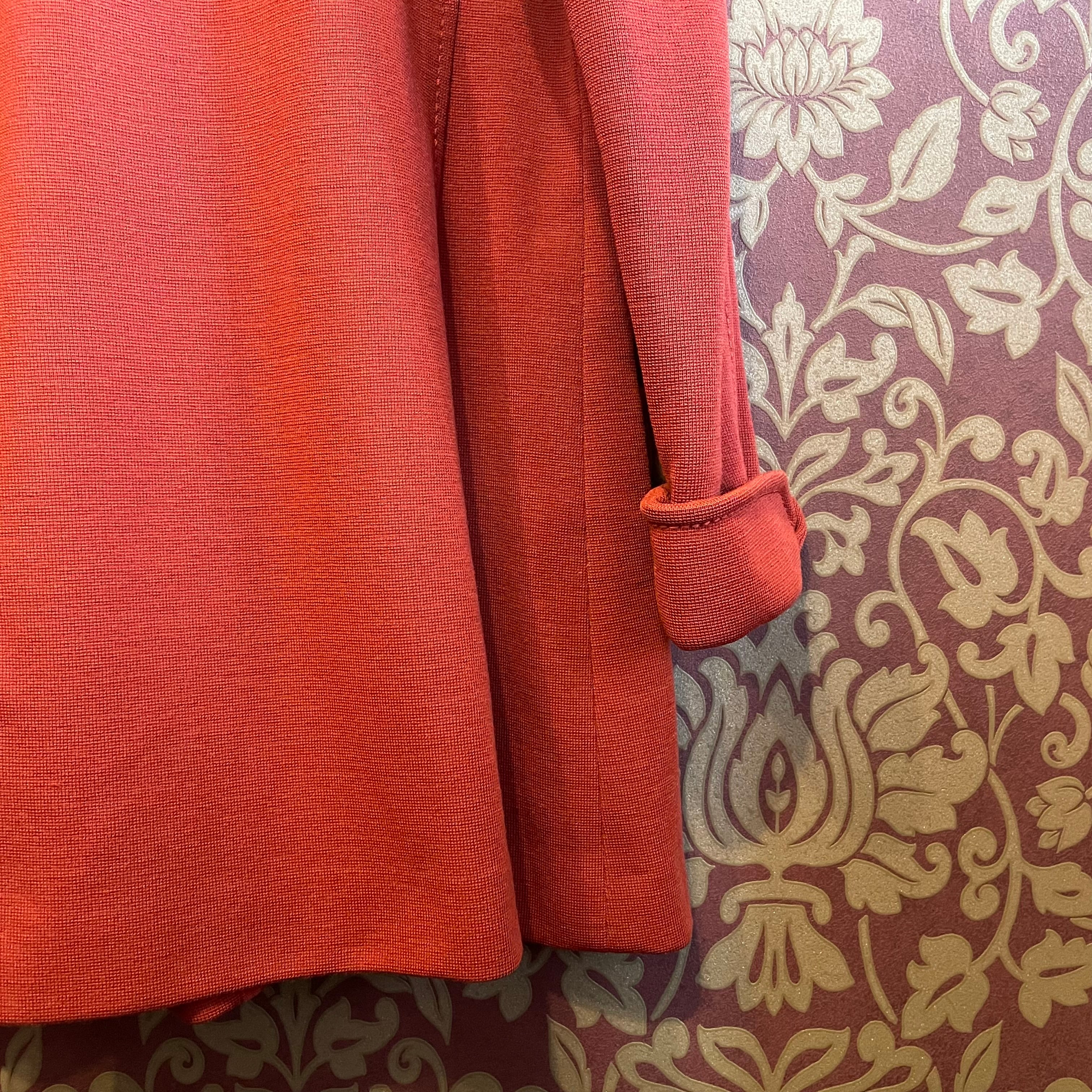 ジャケットは襟が個性的で脇から胸、裾までのダーツが女性らしく柔らかなデザインです。