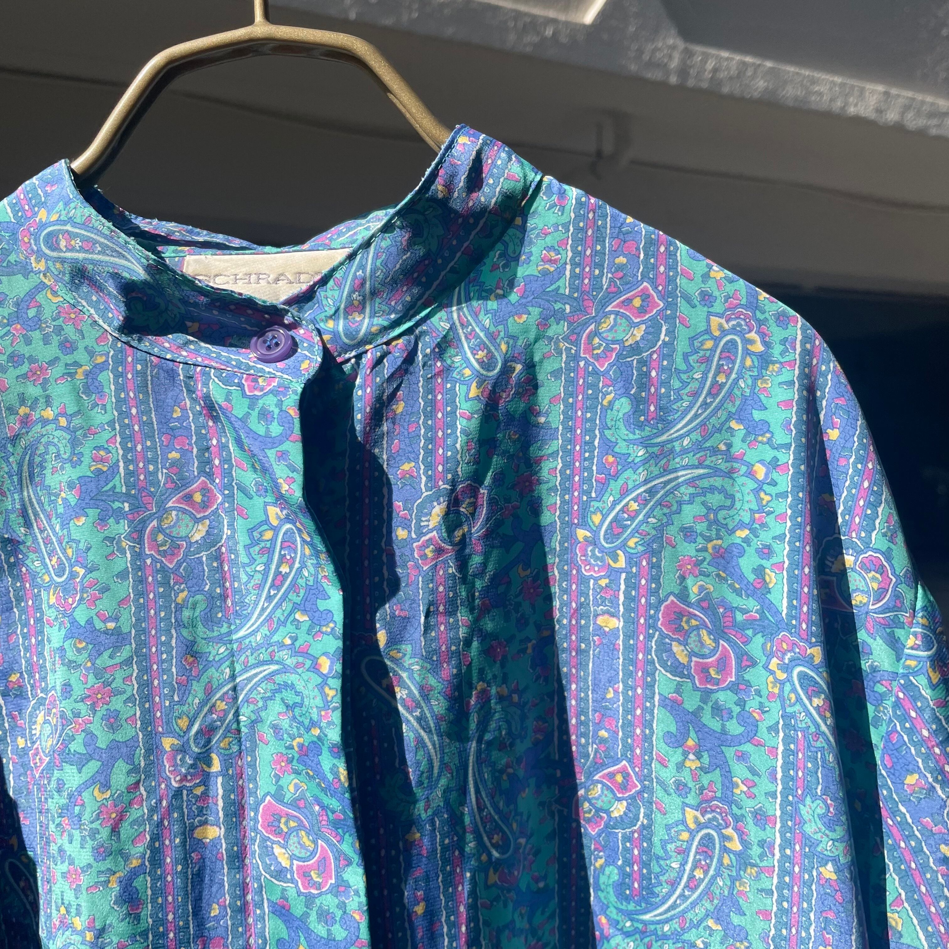 水色をベースに青紫、緑、ピンク、黄色のペイズリー柄のシャツワンピースです。
