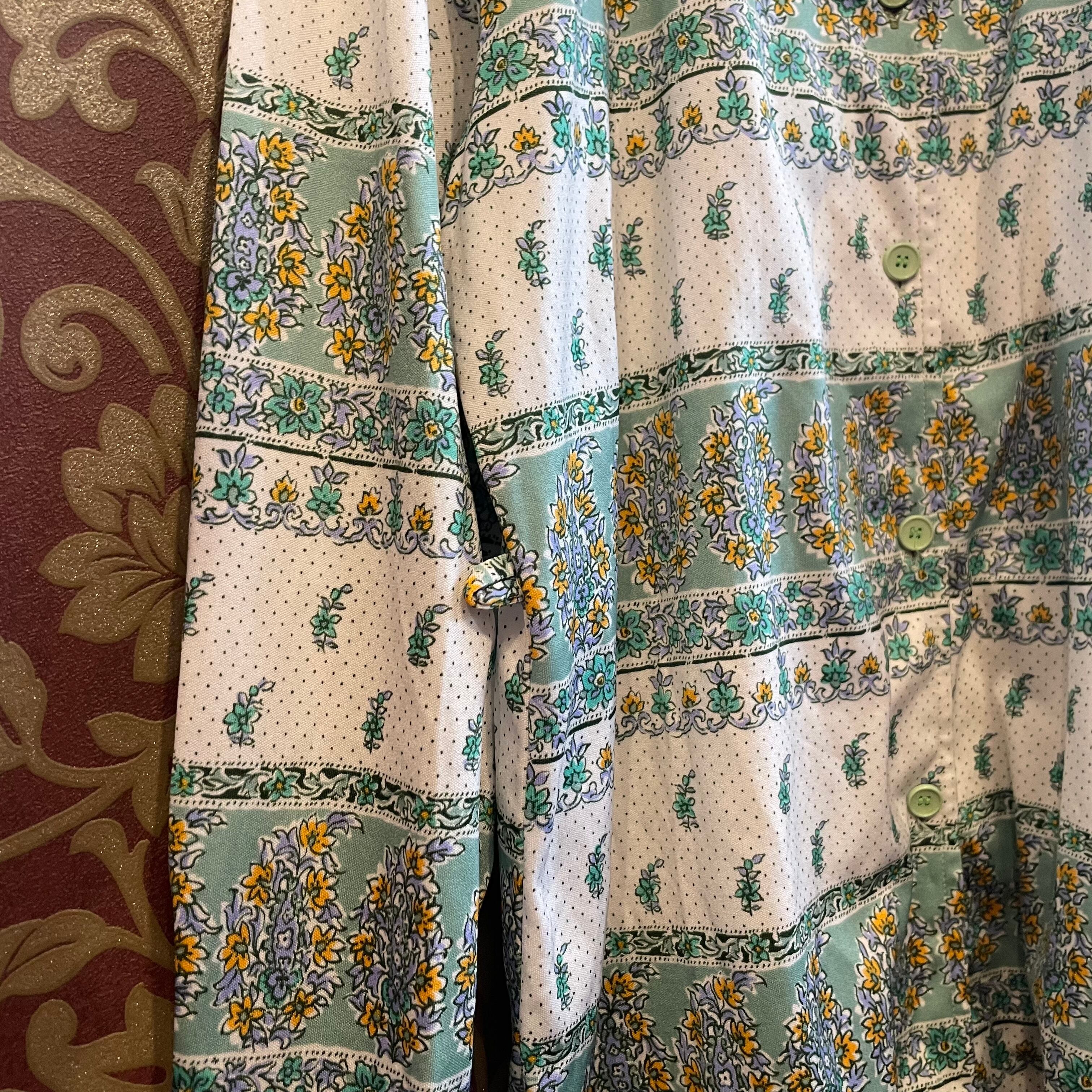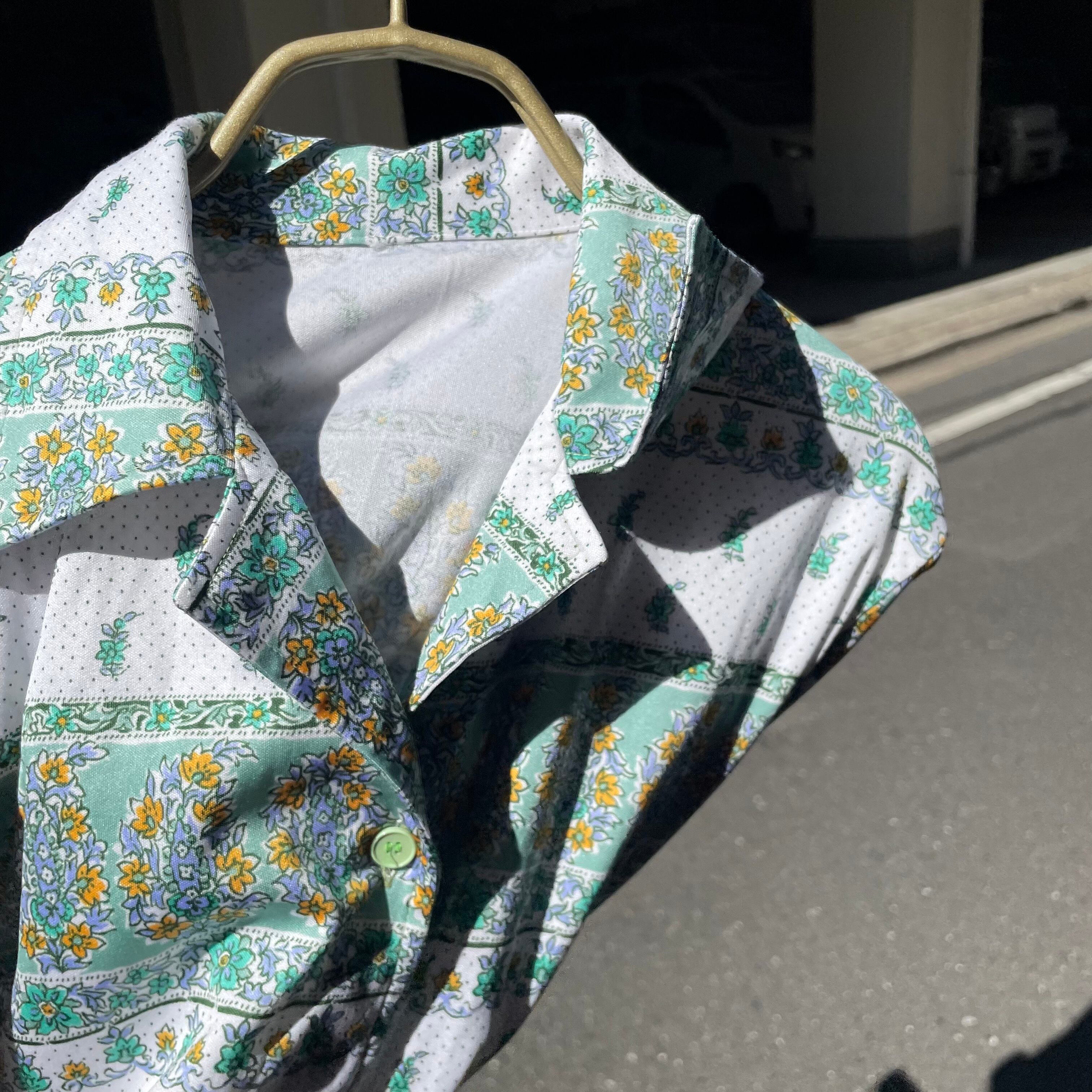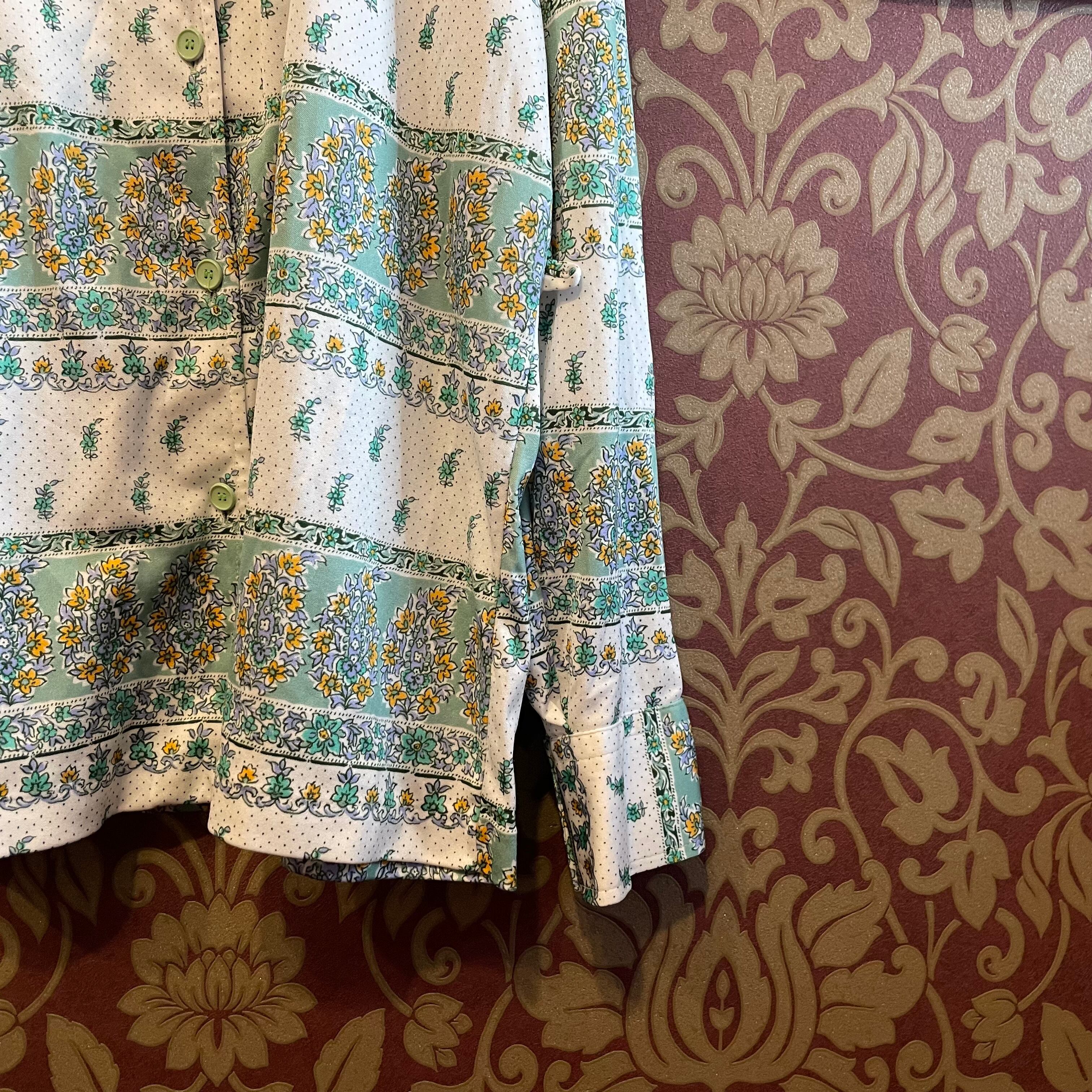 全体に花柄が散りばめられたデザインで白の部分はピンドット柄です。