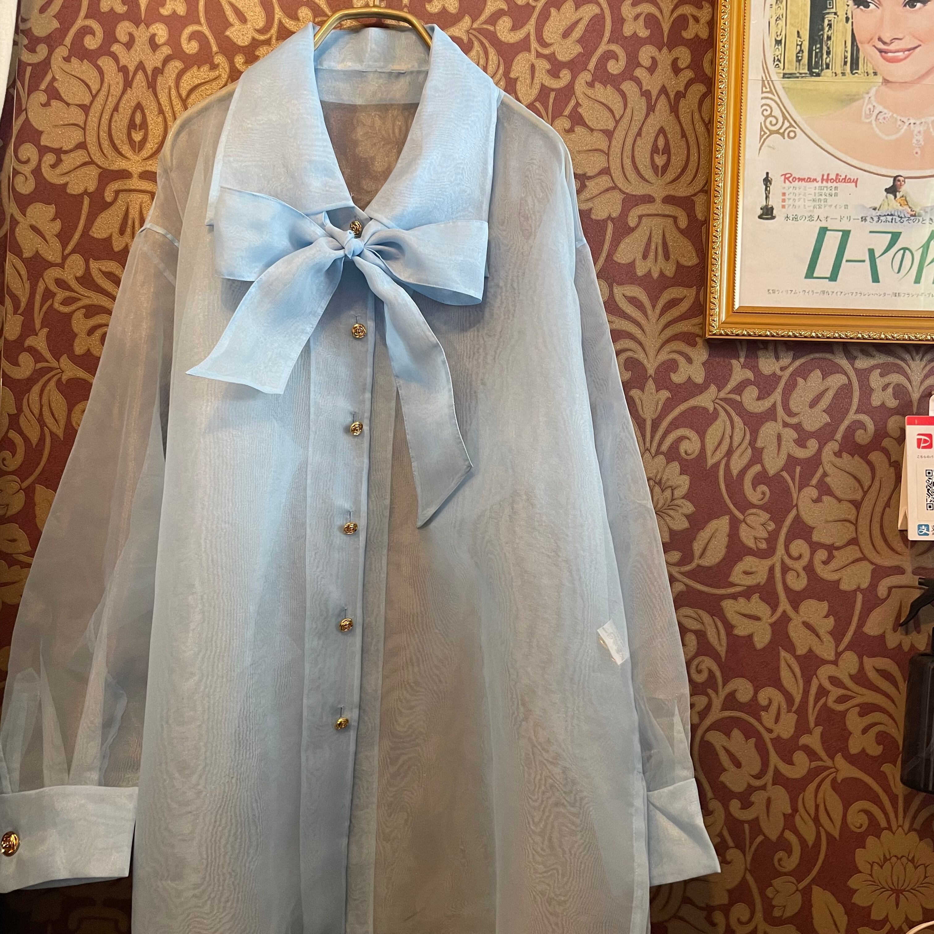 柔らかめのオーガンジーで透け感が美しいのはもちろん、大きめのサイズ感、共布のリボン、ゴールドのボタン、カフスなどどこを見ても素晴らしいです。