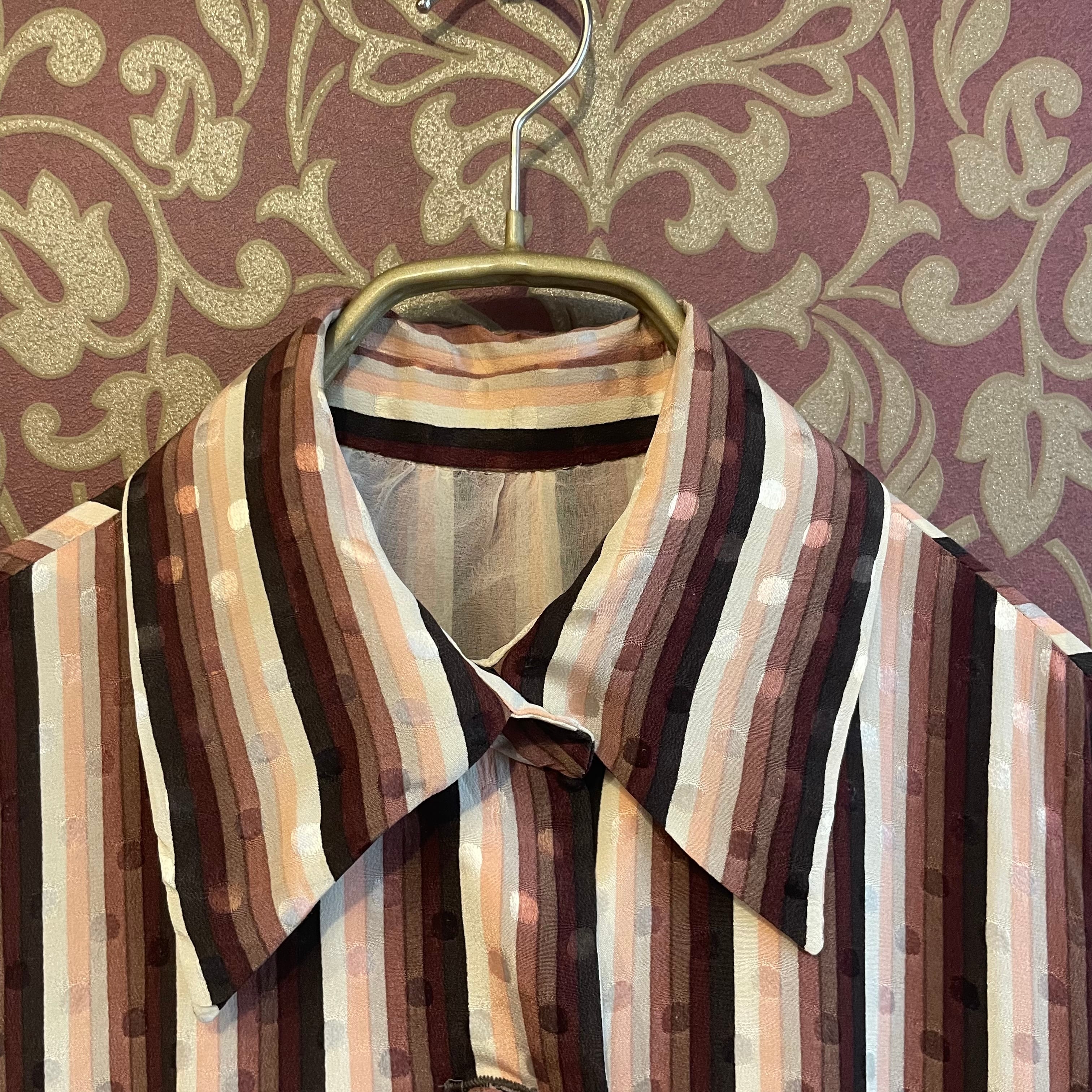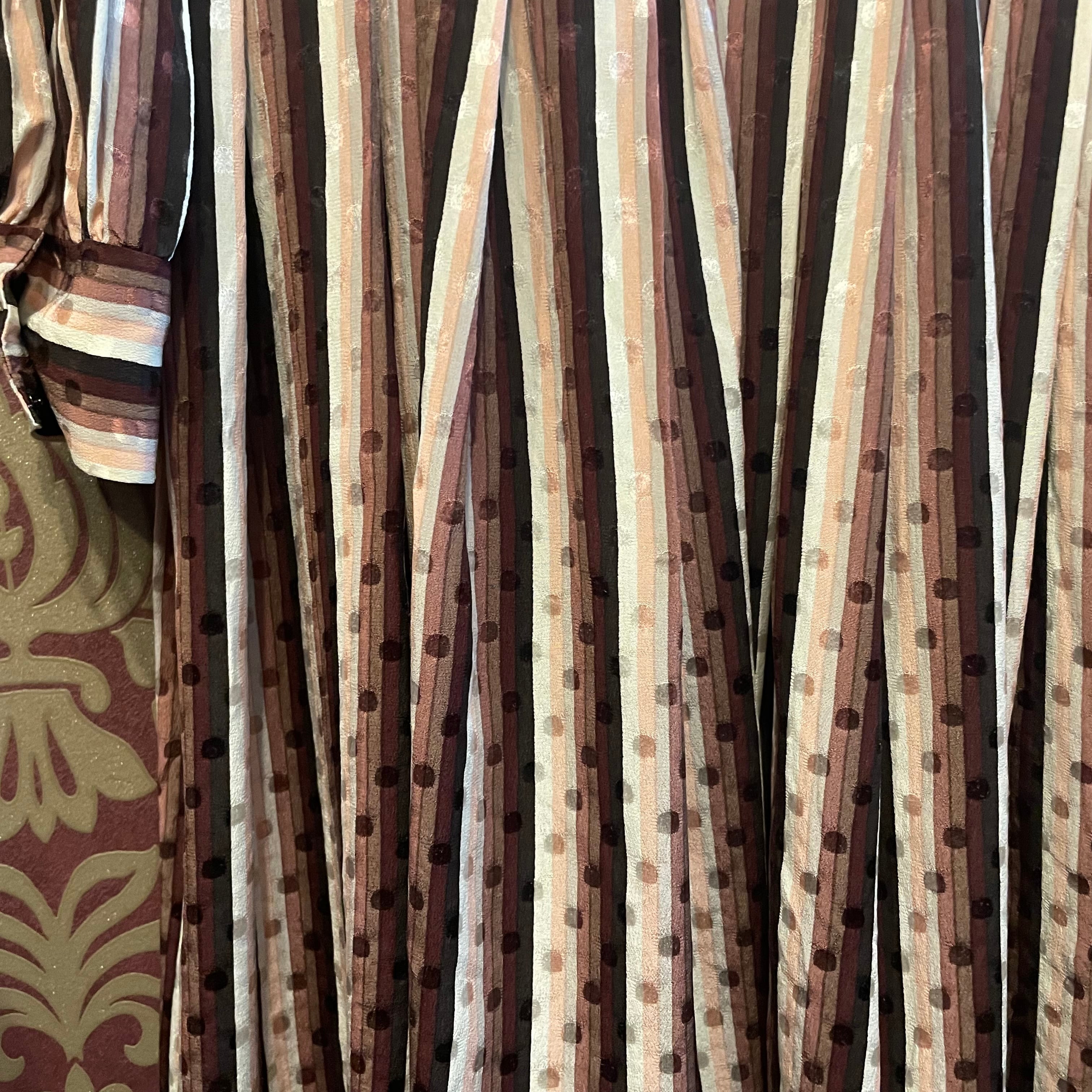全体は茶色、白、ピンクのグラデーションカラーのマルチストライプで、ドットのジャガードとの調和が心地よいデザインです。