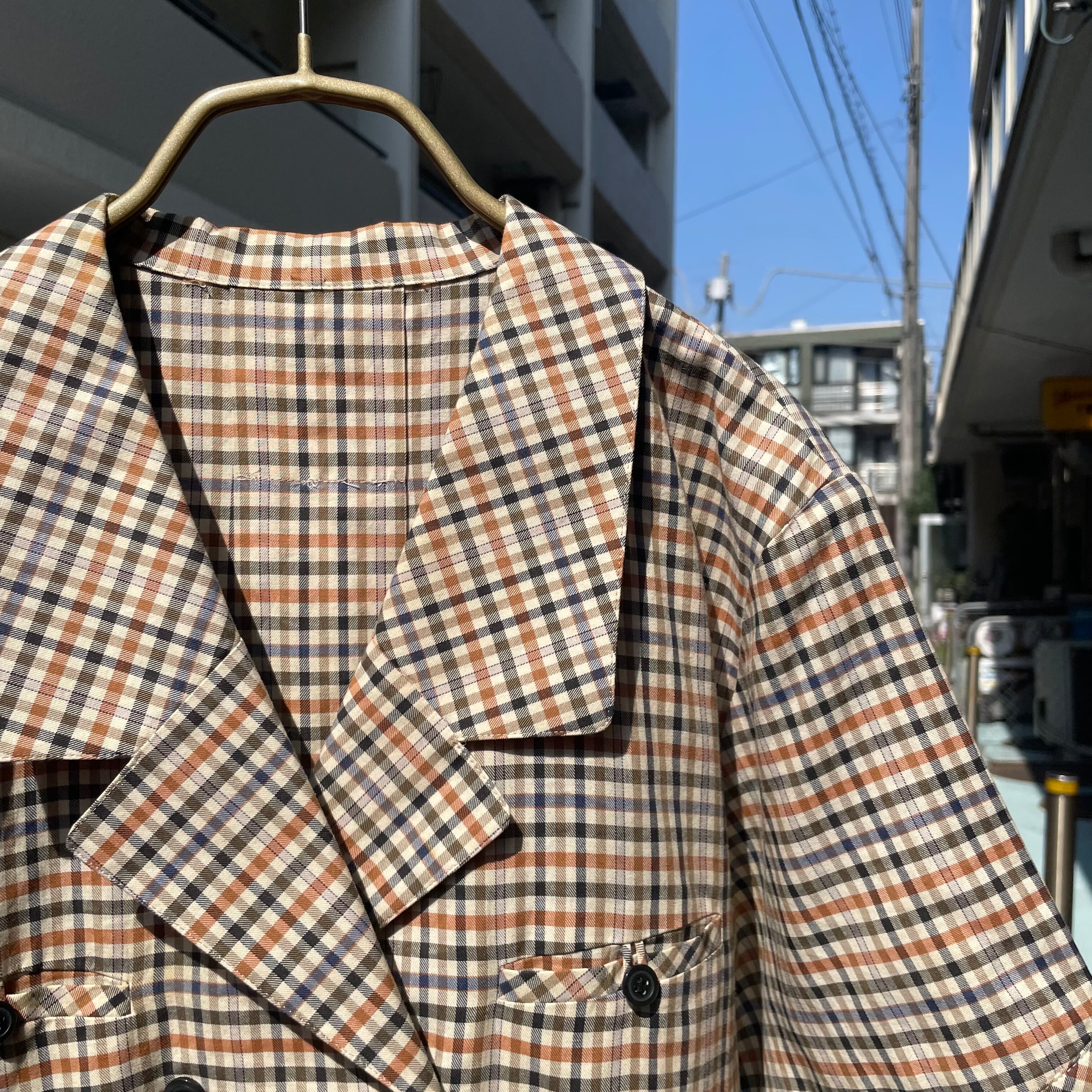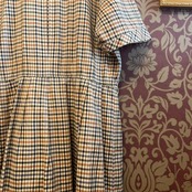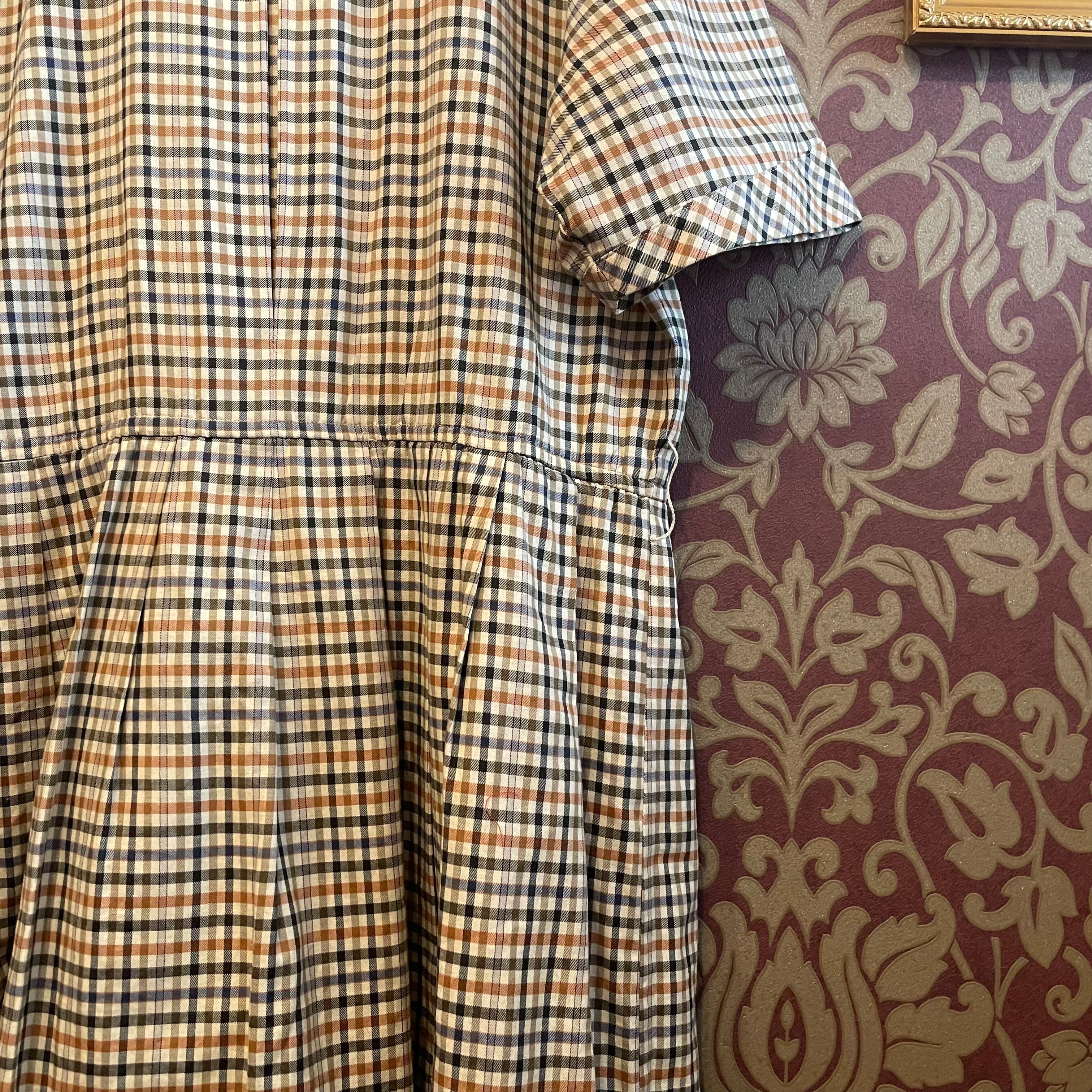 ベージュにオレンジ、カーキ、ブルーグレー、黒などのチェック柄ワンピースです。