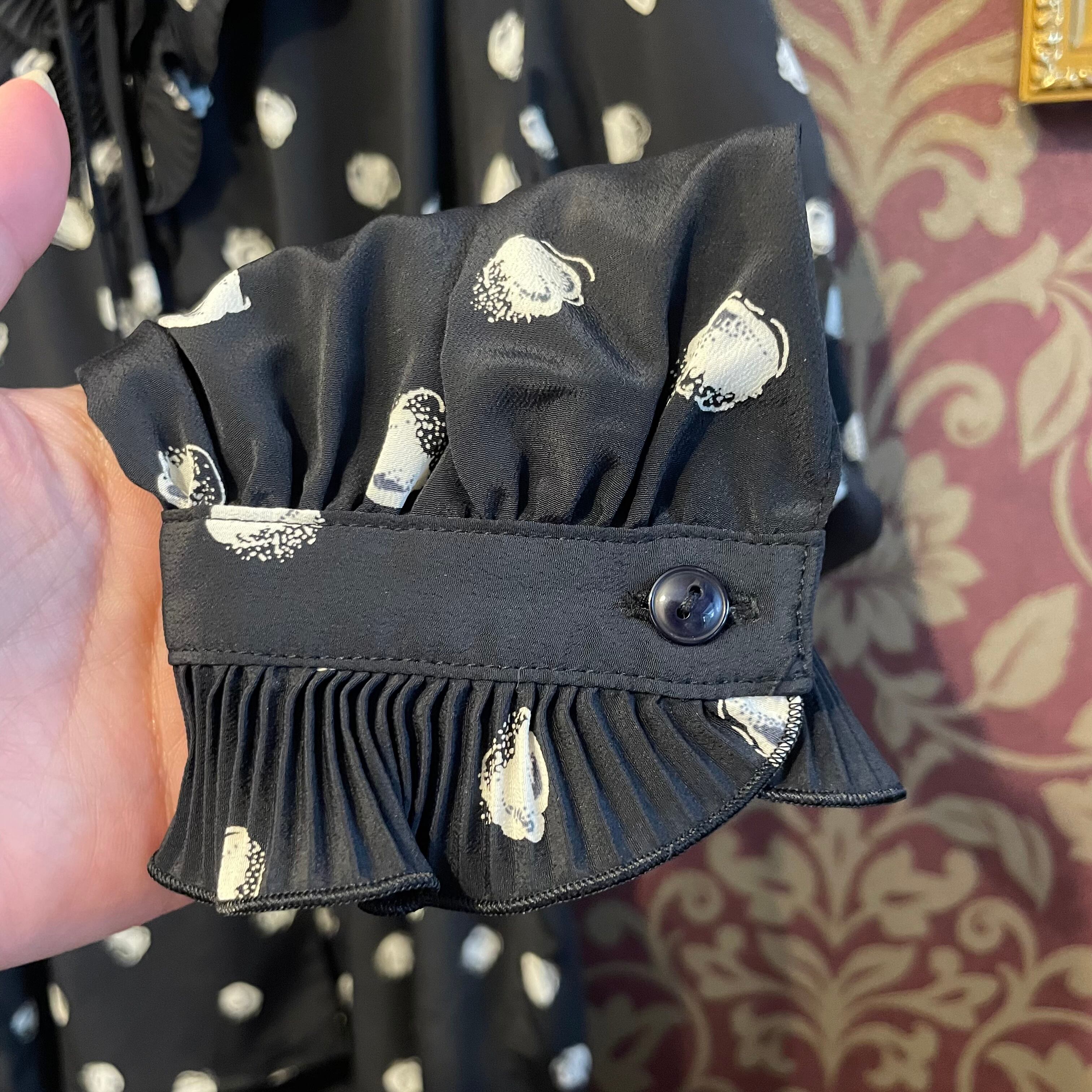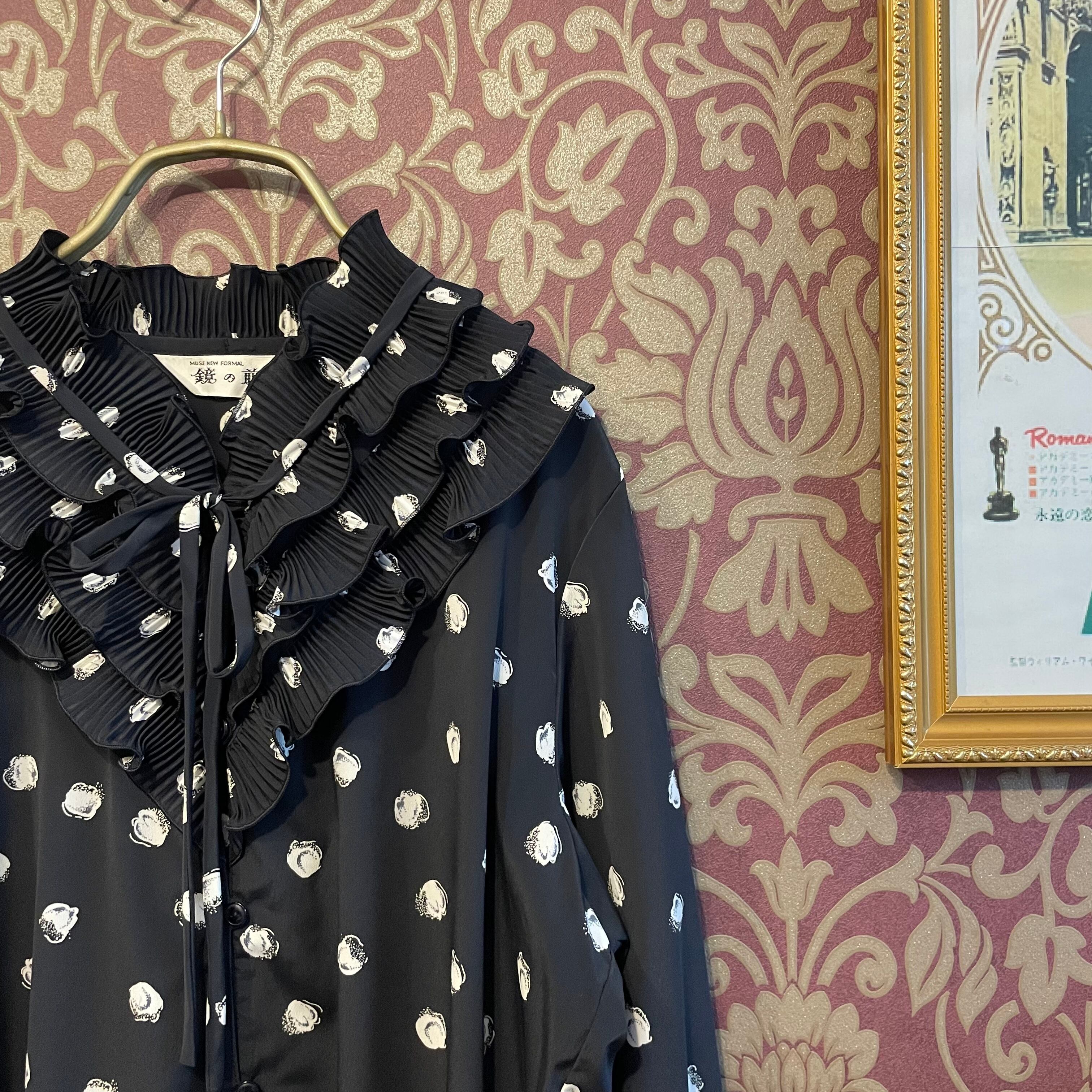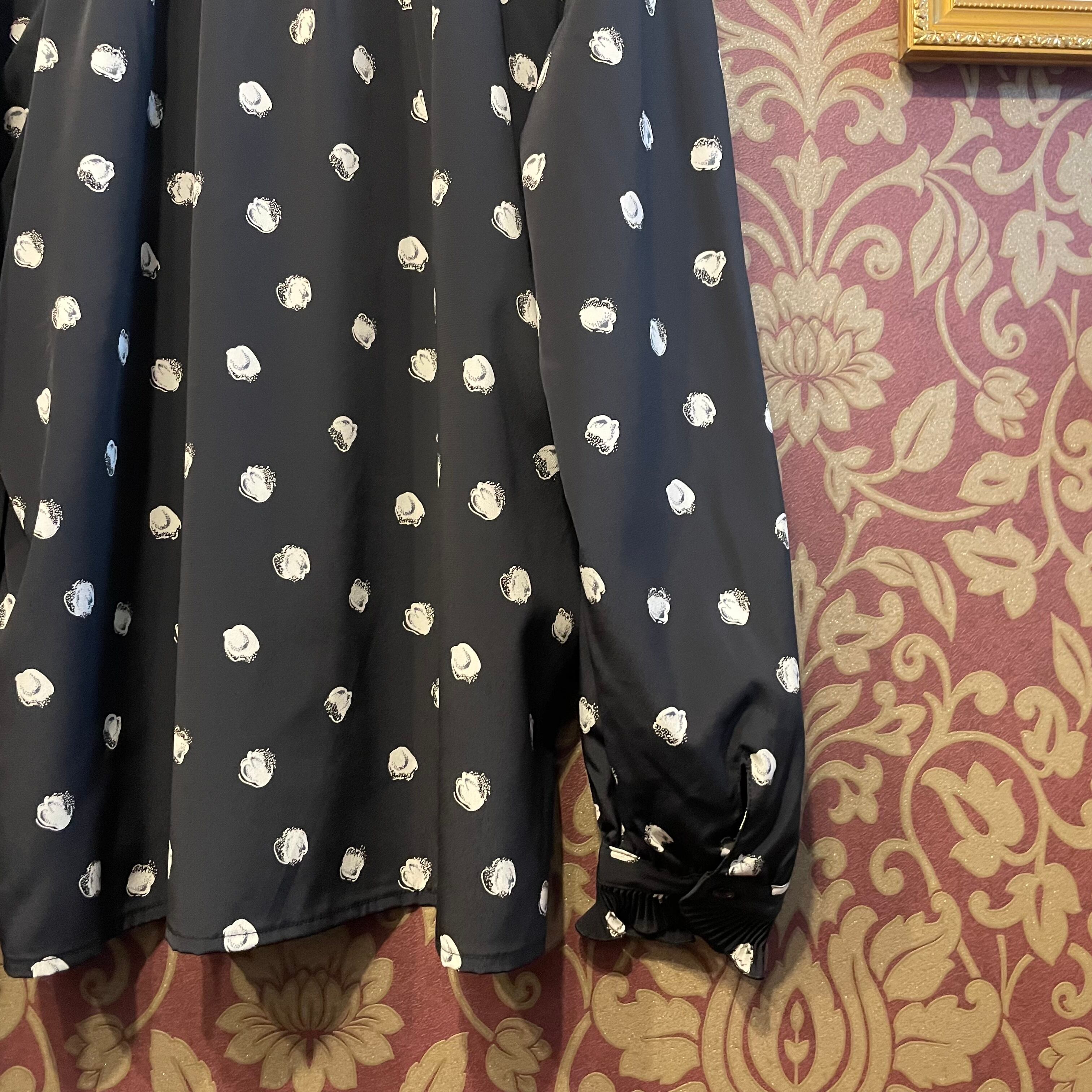 黒地に白の花弁のような不思議な柄のブラウスです。