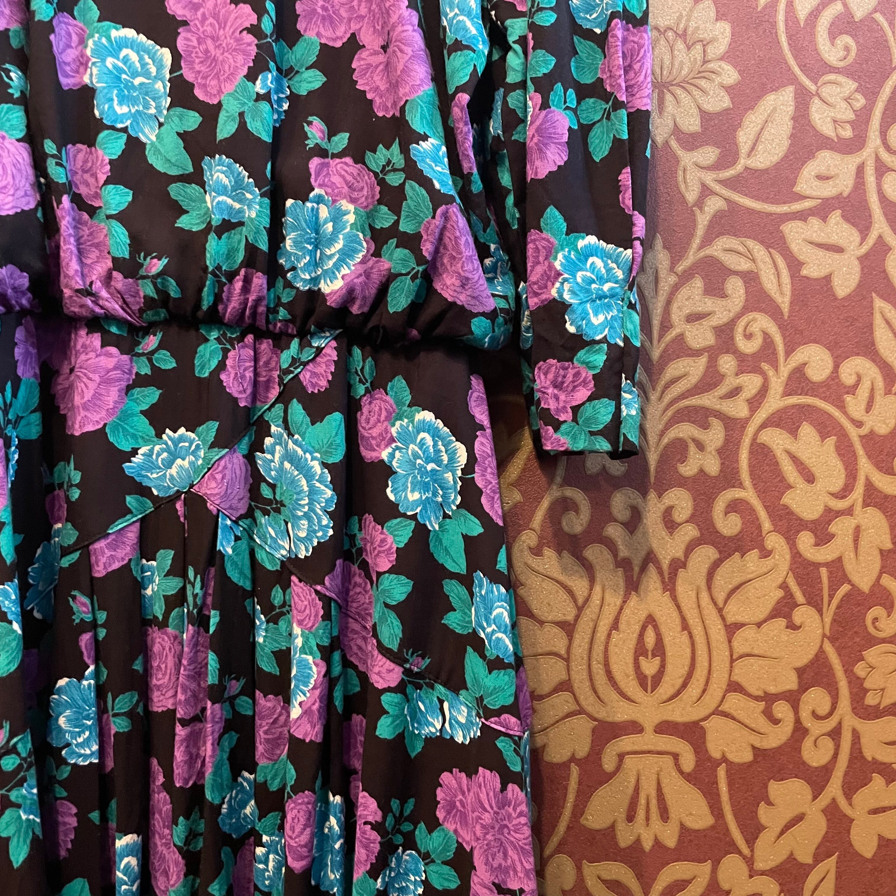 黒地に青と紫の花が映える柄で独特な美しさを感じます。