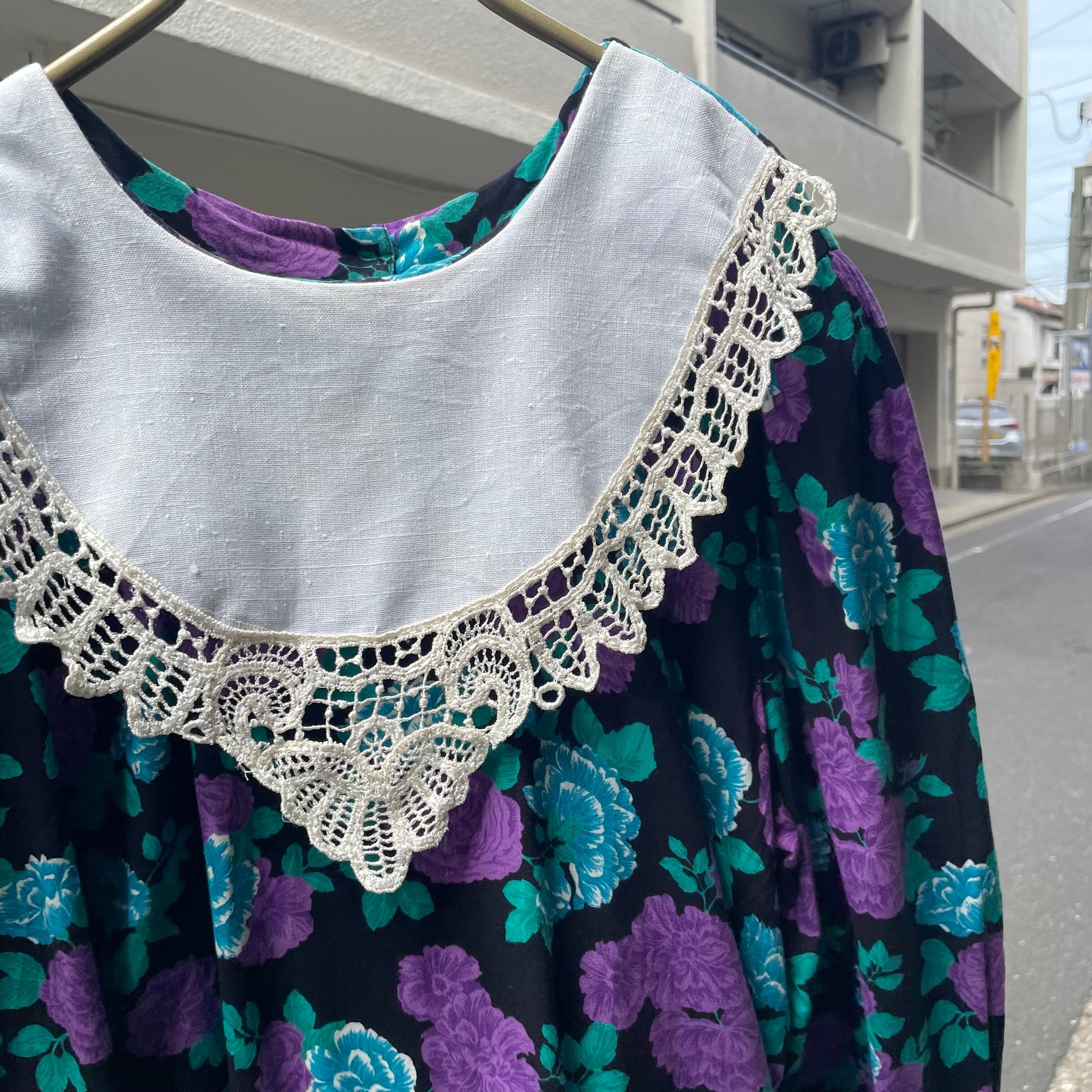 襟は生成りのようなナチュラルな生地と繊細なレースで作られています。