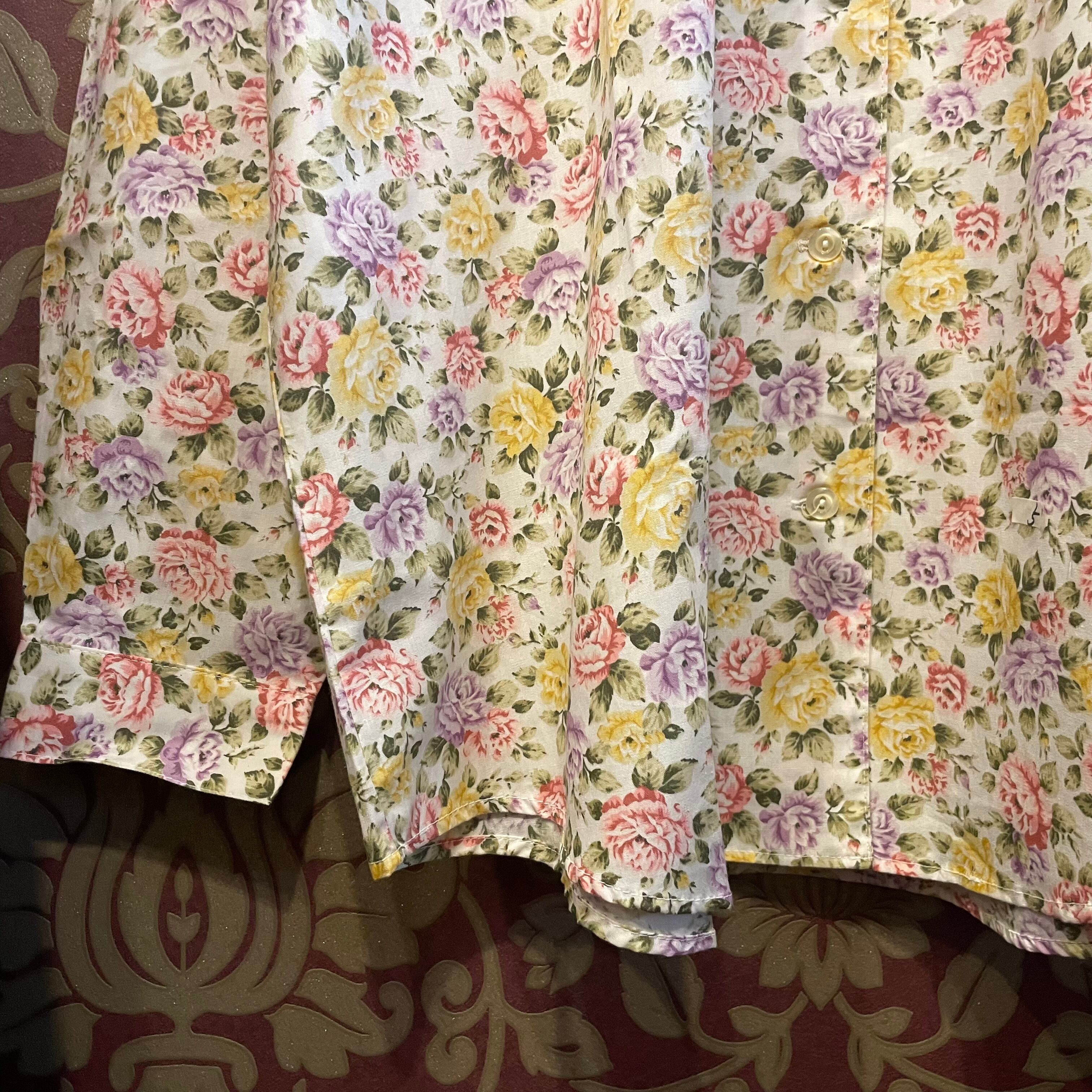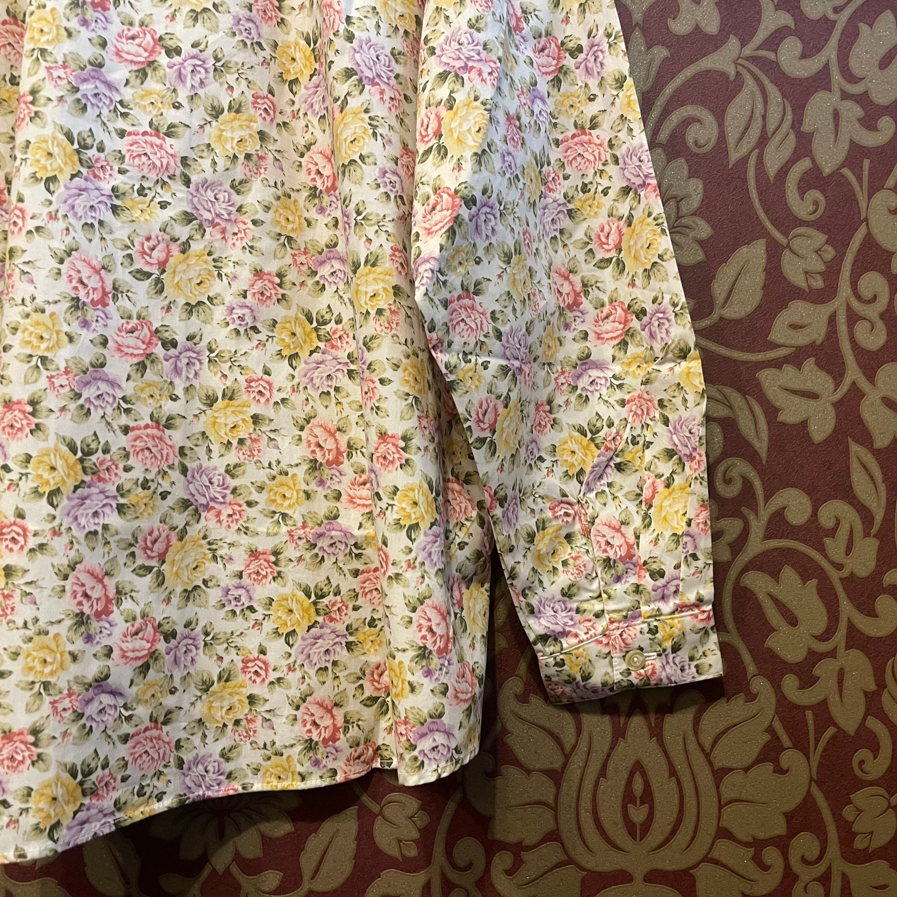 白地にピンク、黄色、紫のバラ柄のブラウスです。
