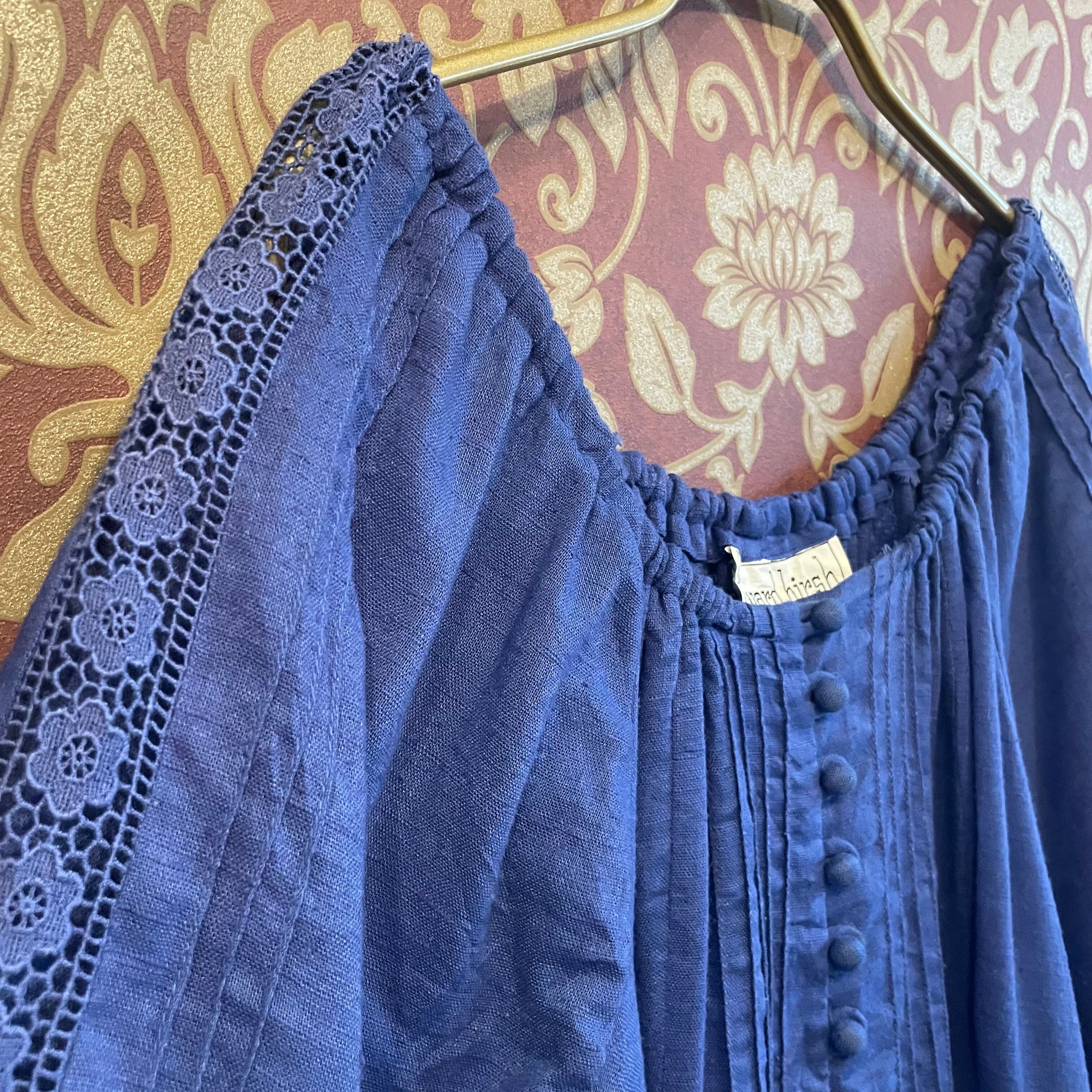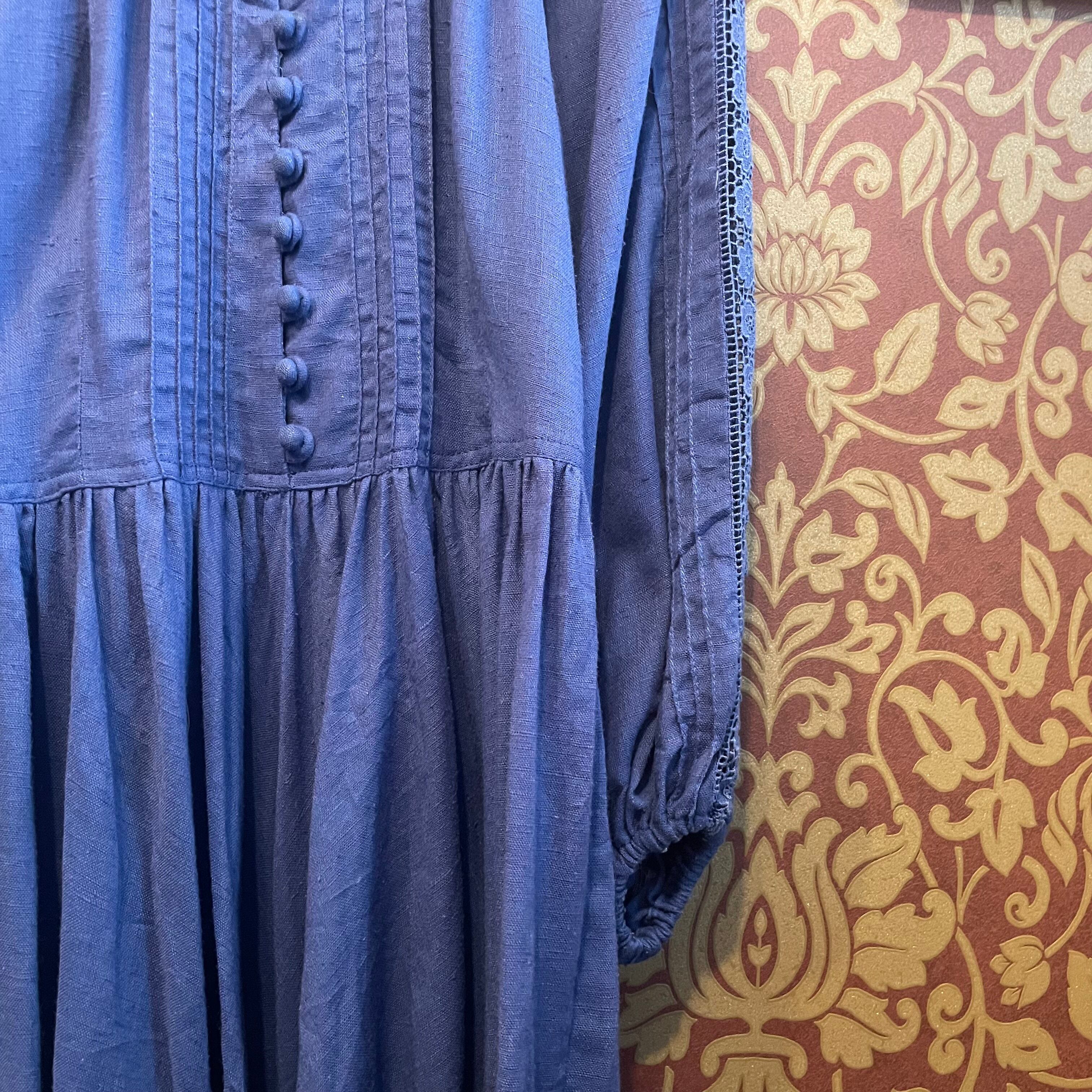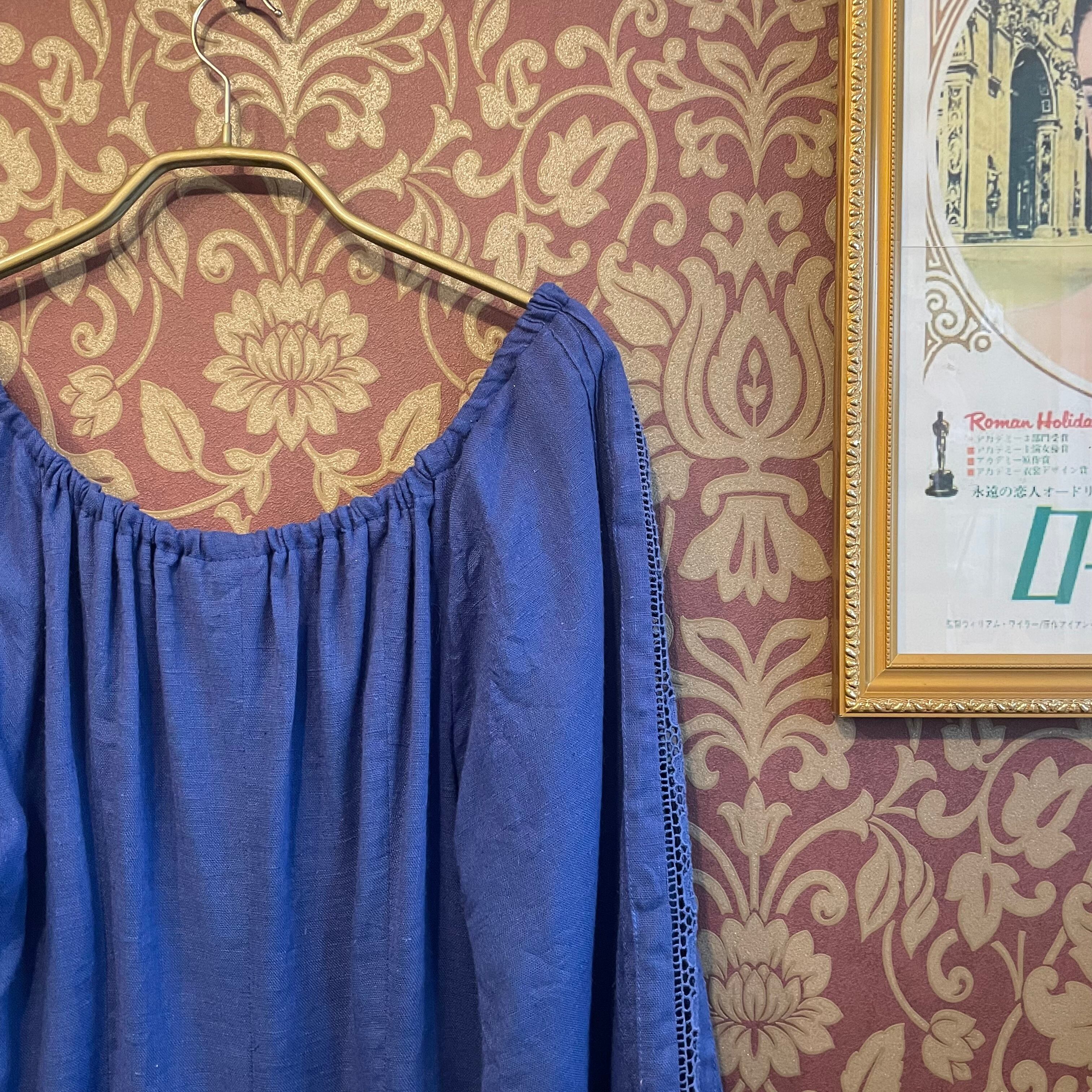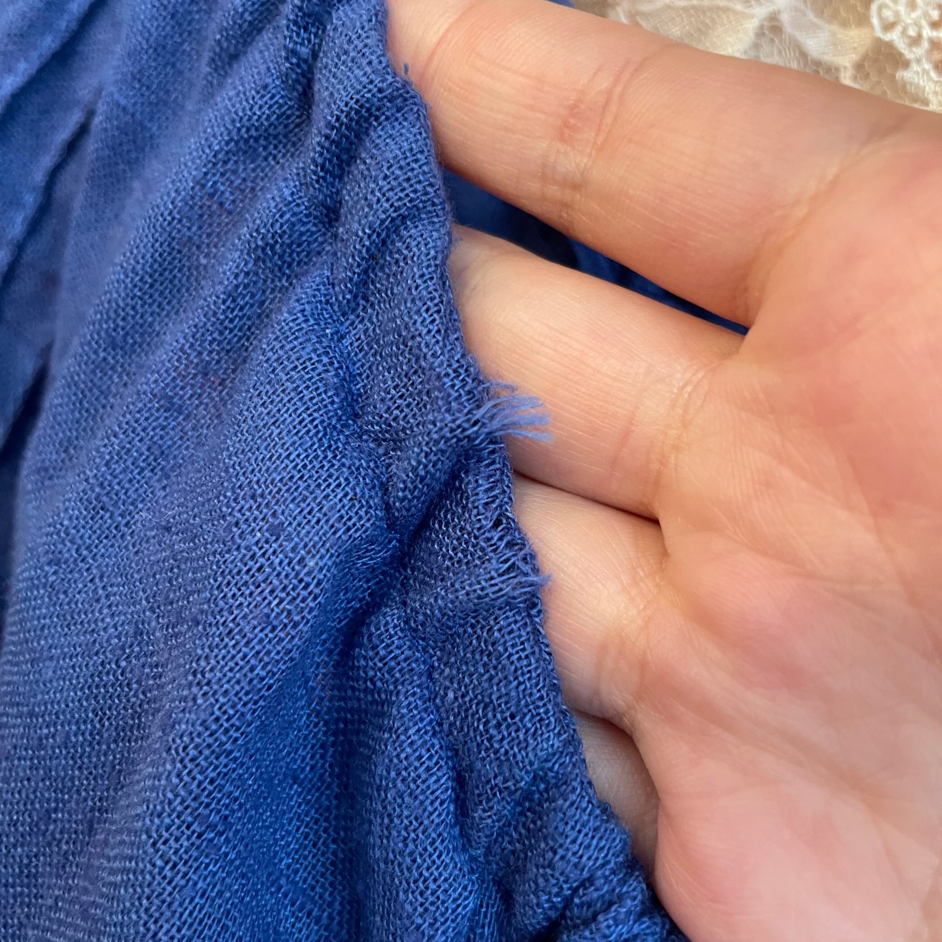 全体が青ですがコットンや麻のような節のあるガーゼのようなナチュラルな生地感のおかげで柔らかな印象です。